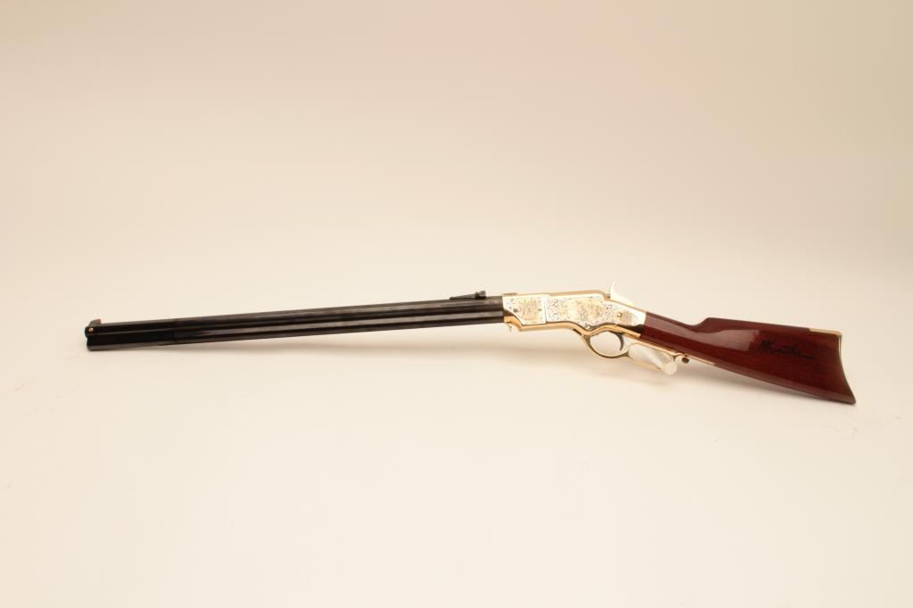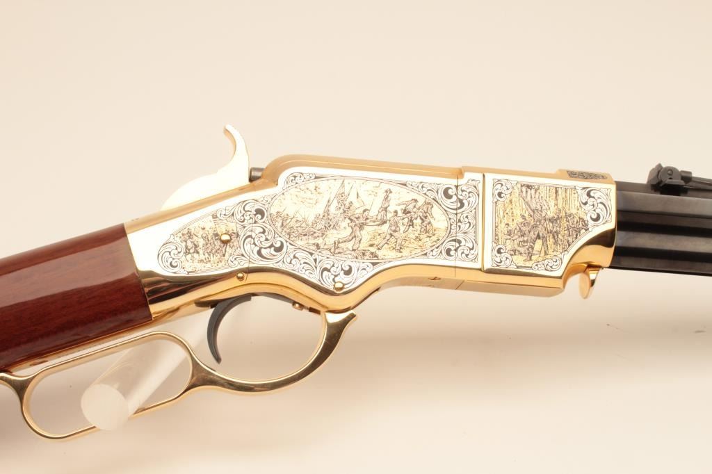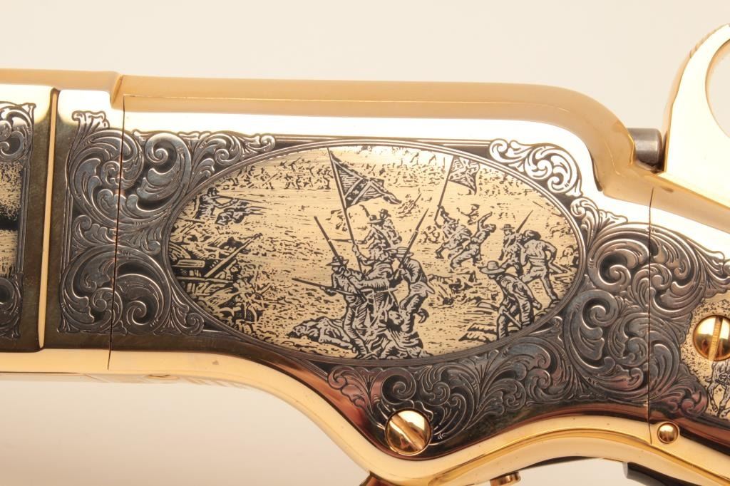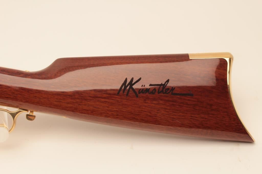 Taylor’s & Co. Modern copy of a Henry lever action rifle, Gettysburg Tribute Commemorative.44 W.C.F. caliber, 24” octagon barrel, blued finish to barrel assembly with decorated gold colored frame, lever and buttplate, wood butt stock with “MKunstler” branded on both sides of stock; S/N 124 of 500; overall like new condition. (Modern). Est.: $750-$1,500.