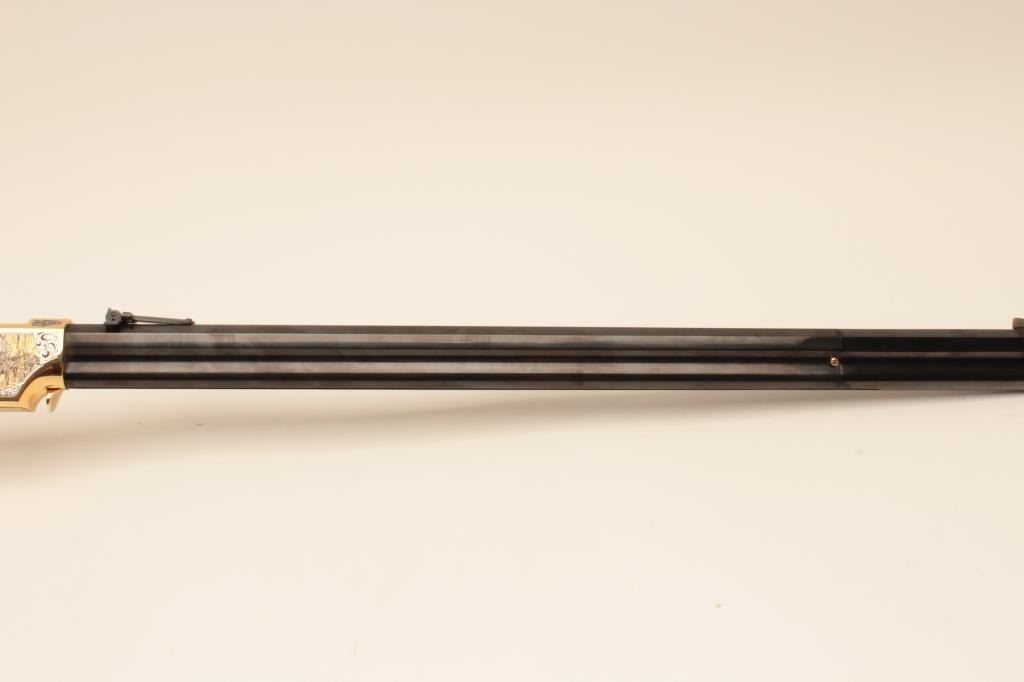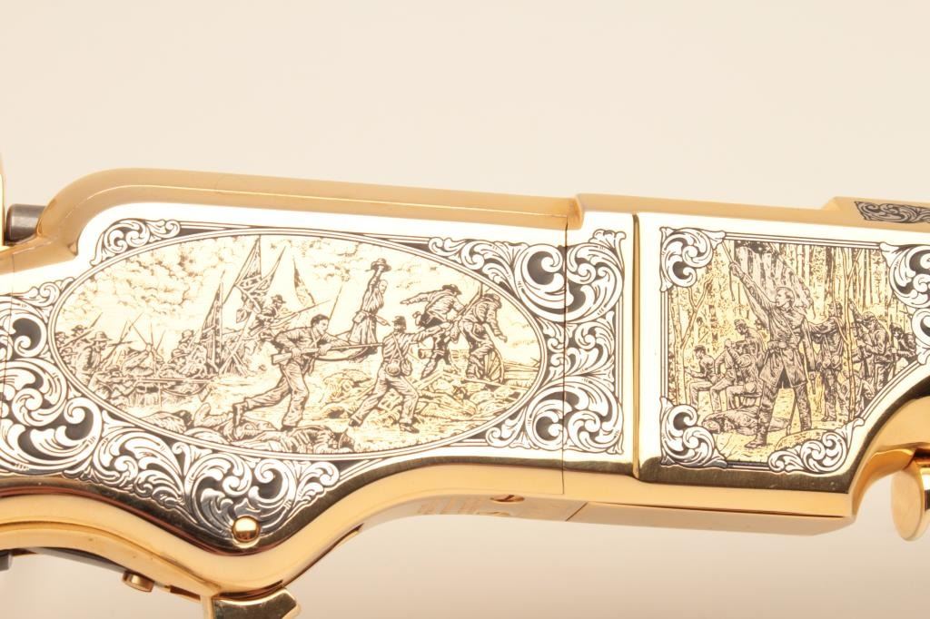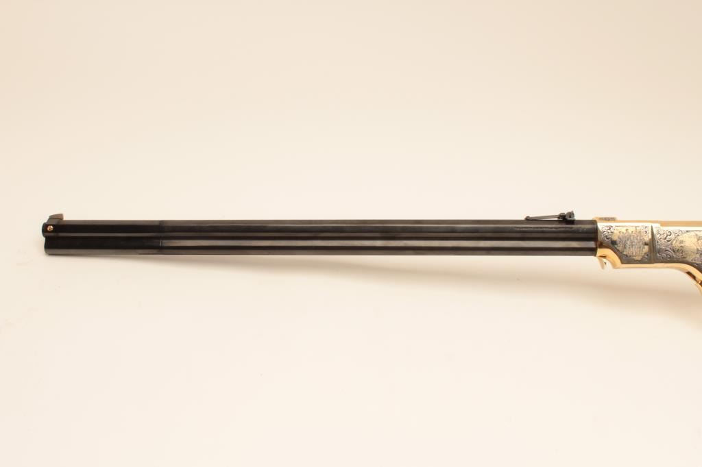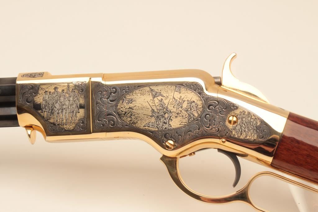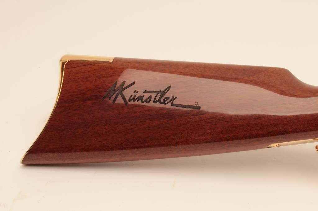 Taylor’s & Co. Modern copy of a Henry lever action rifle, Gettysburg Tribute Commemorative.44 W.C.F. caliber, 24” octagon barrel, blued finish to barrel assembly with decorated gold colored frame, lever and buttplate, wood butt stock with “MKunstler” branded on both sides of stock; S/N 124 of 500; overall like new condition. (Modern). Est.: $750-$1,500.