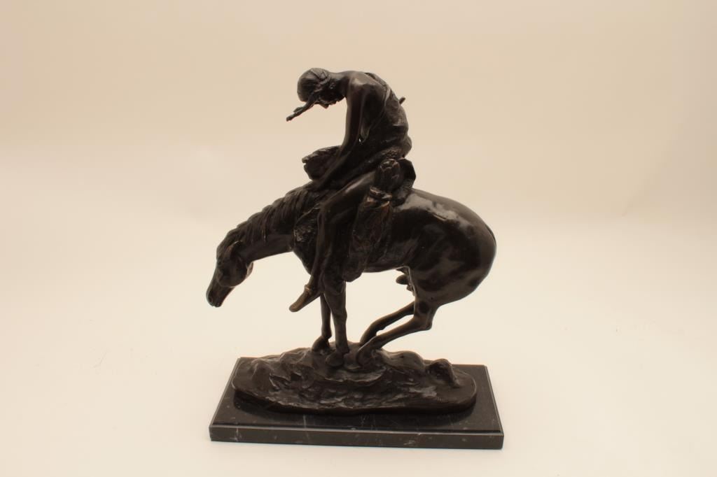 “End of Trail” Bronze by James Fraser; approximately 21” high x 17” long x 8” wide on base with ID plaque; nice patina and appears to be an older re-cast. Est.: $200-$400.