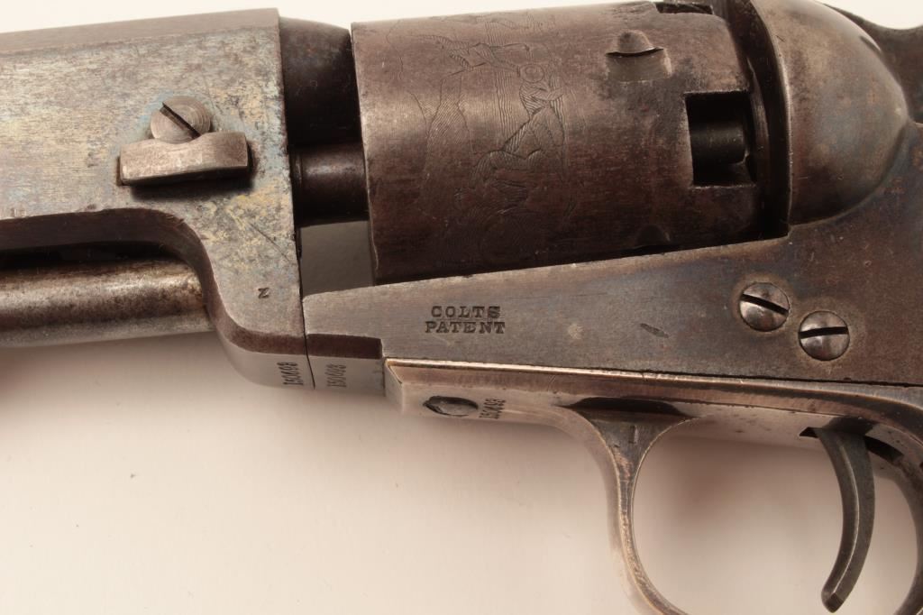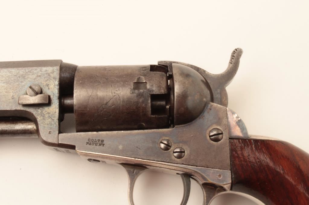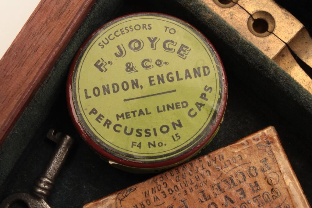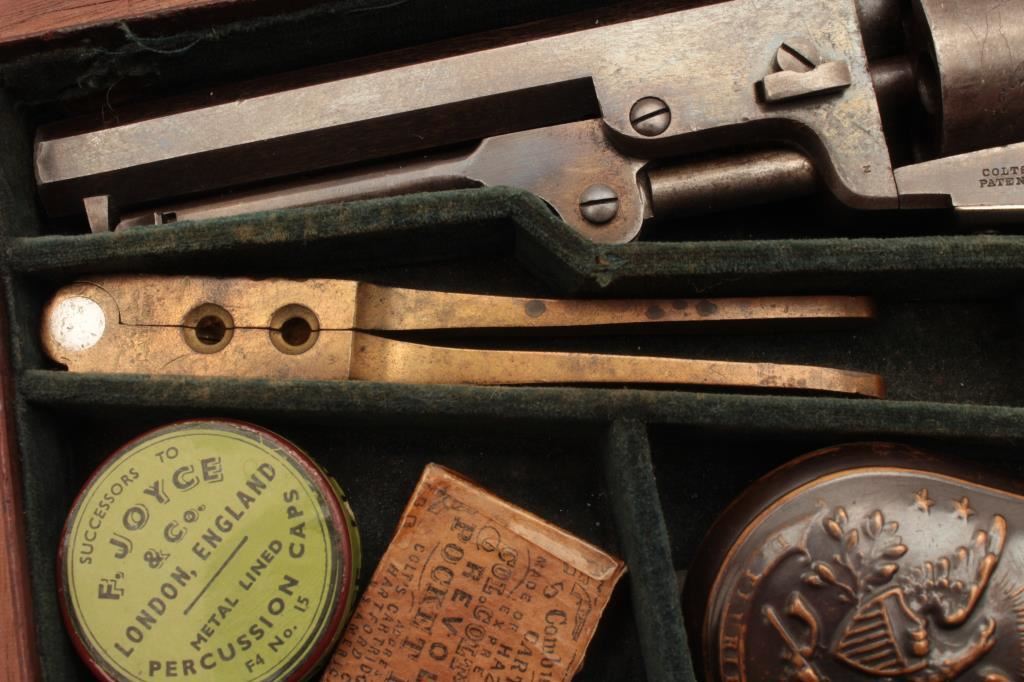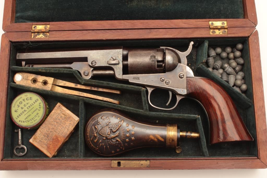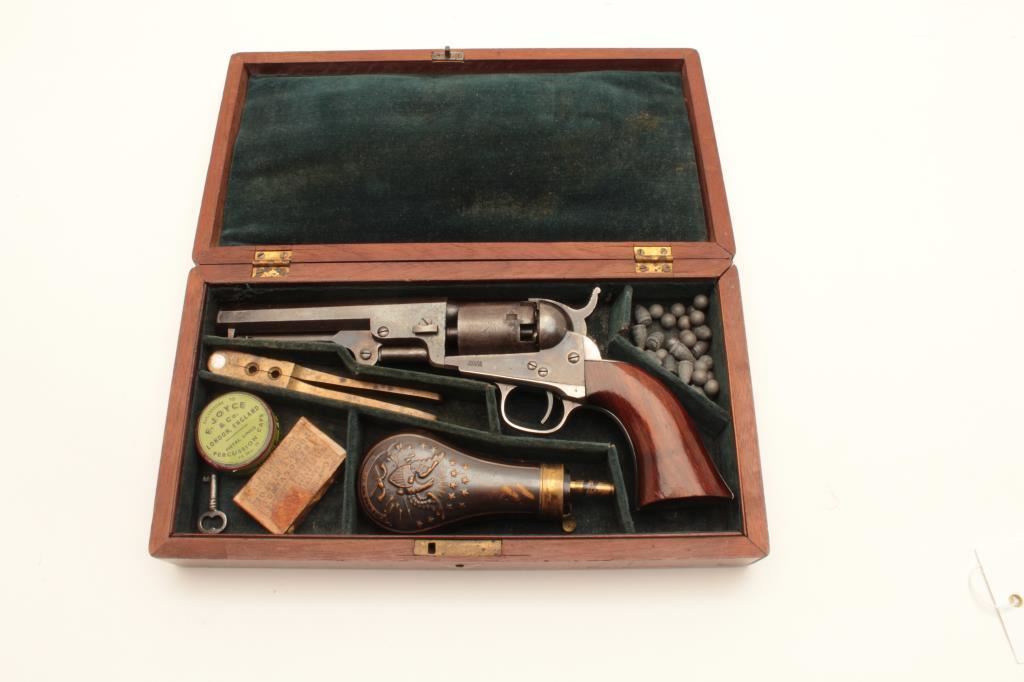 Colt Model 1849 Pocket percussion revolver, .31 caliber, 5” octagon barrel, blued and case hardened finish, wood grips, S/N 150693 (all visible #s matching); overall very good to near fine with considerable original blued and case color finish; majority of cylinder scene present; crisp action, sharp markings and near fine grips; majority of original silver wash remaining on brass straps; accompanied by a wood presentation partitioned casing with eagle powder flask, brass bullet mold, skin pack of cartridges, F. Joyce & Co. cap tin plus assorted lead bullets; key to case lock is also present. (Antique). Est.: $4,000-$8,000.