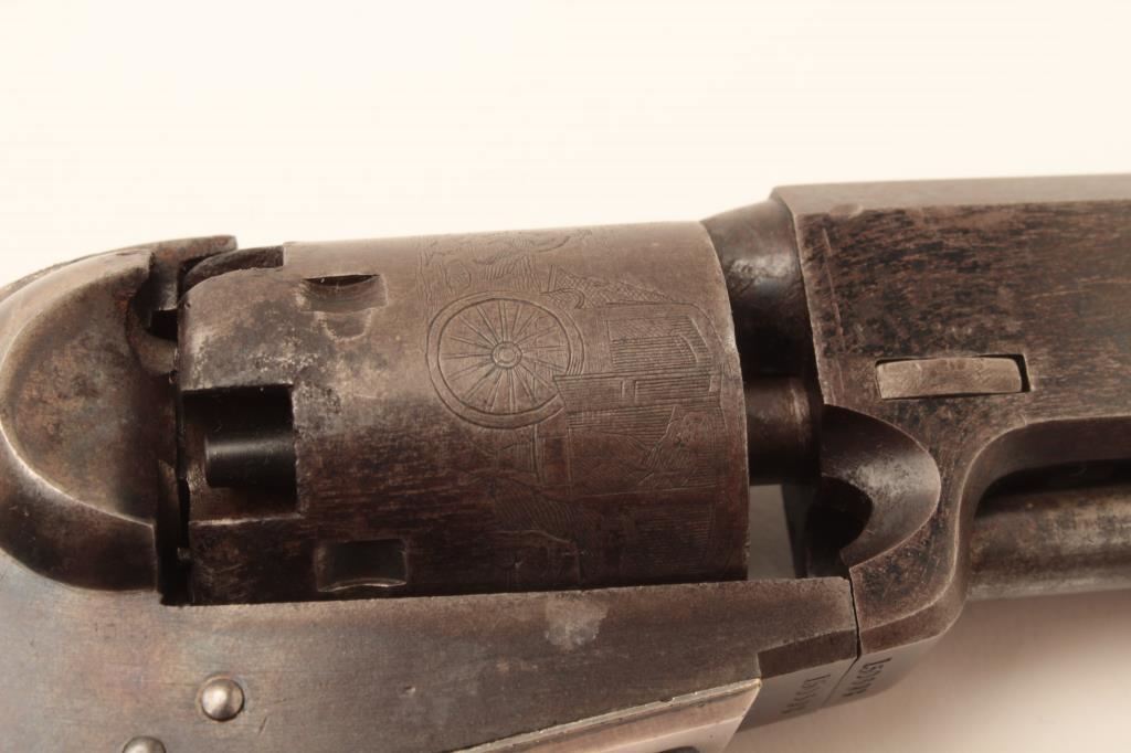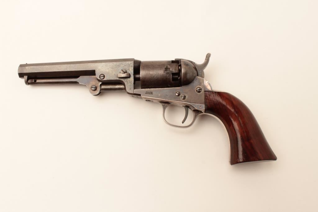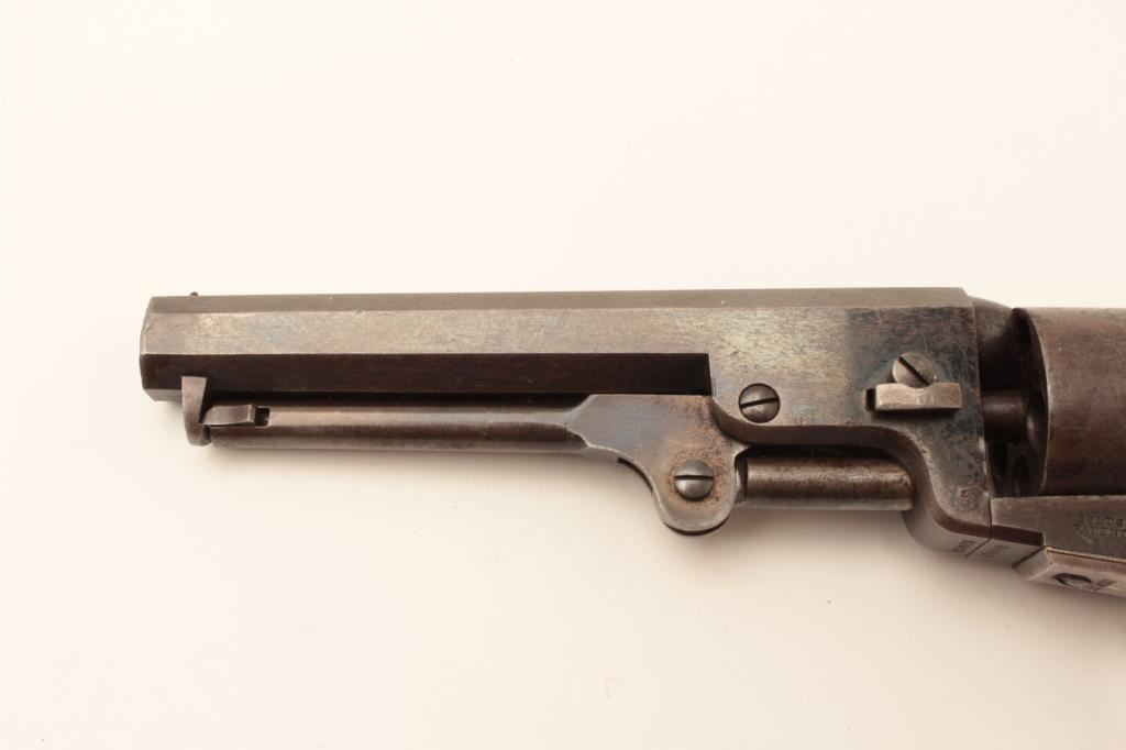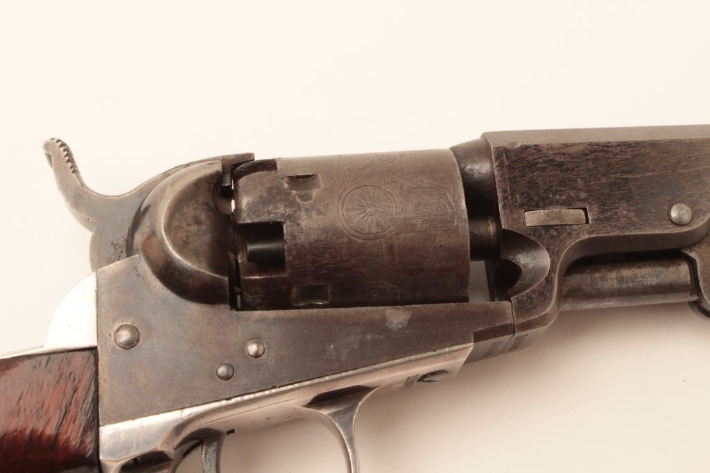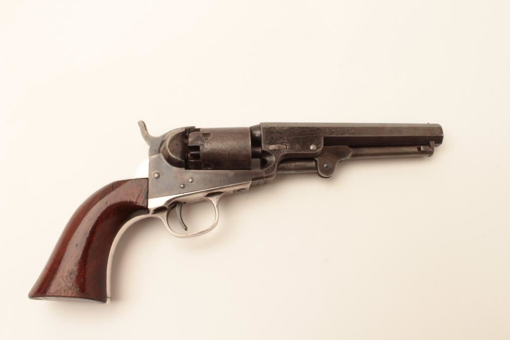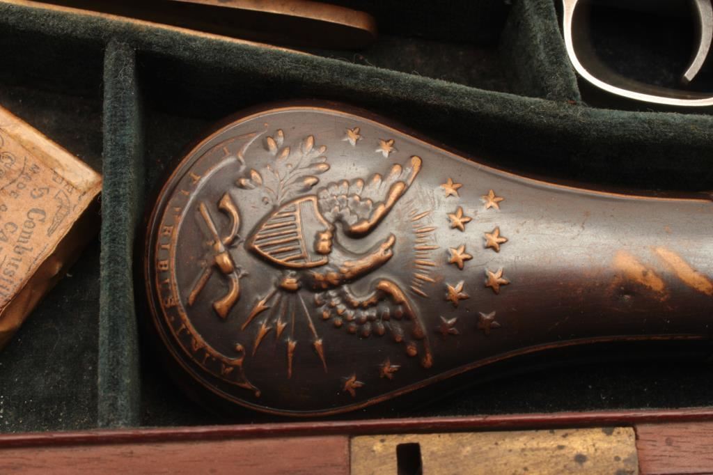 Colt Model 1849 Pocket percussion revolver, .31 caliber, 5” octagon barrel, blued and case hardened finish, wood grips, S/N 150693 (all visible #s matching); overall very good to near fine with considerable original blued and case color finish; majority of cylinder scene present; crisp action, sharp markings and near fine grips; majority of original silver wash remaining on brass straps; accompanied by a wood presentation partitioned casing with eagle powder flask, brass bullet mold, skin pack of cartridges, F. Joyce & Co. cap tin plus assorted lead bullets; key to case lock is also present. (Antique). Est.: $4,000-$8,000.