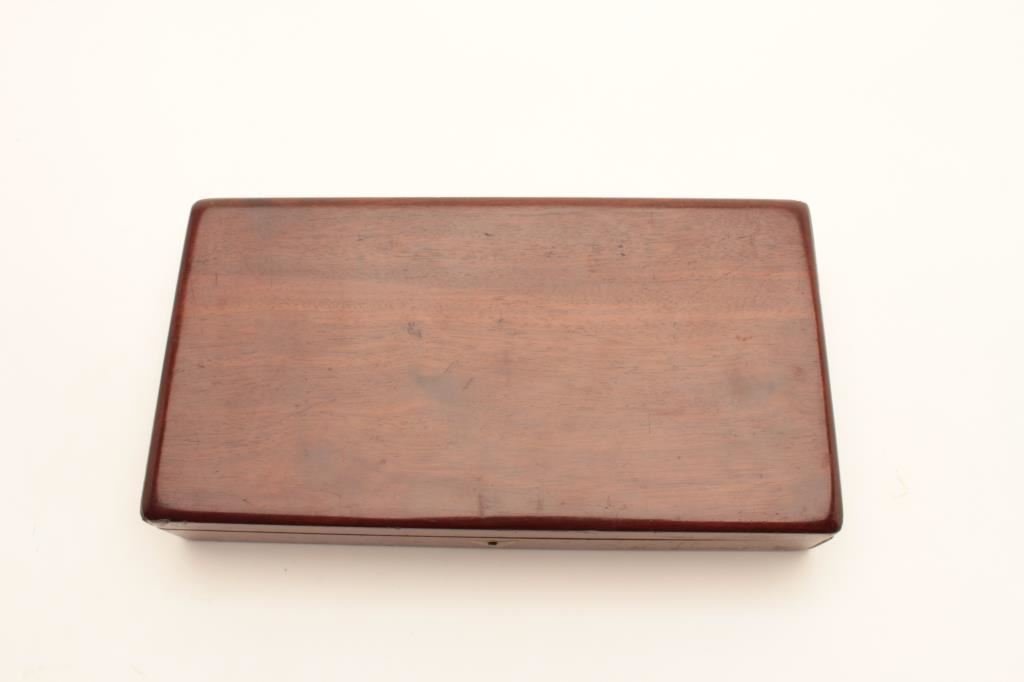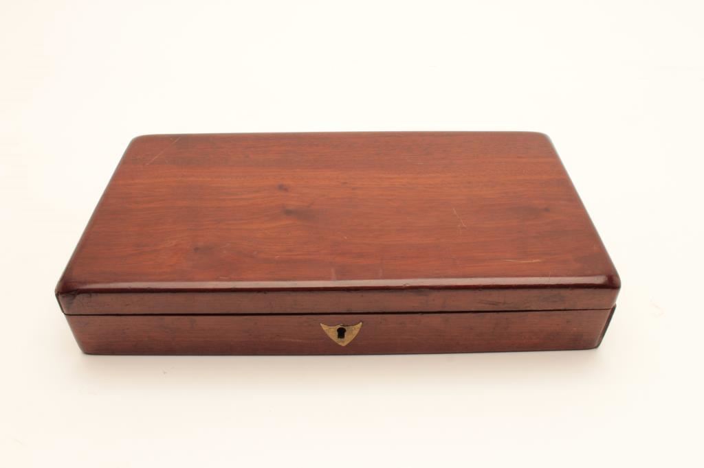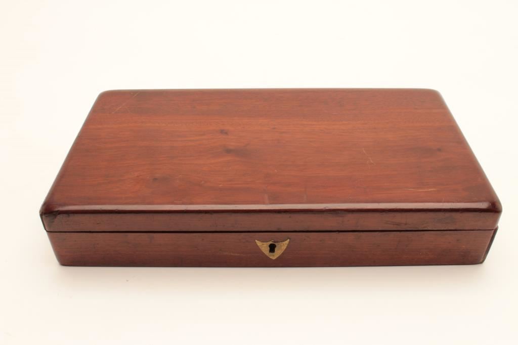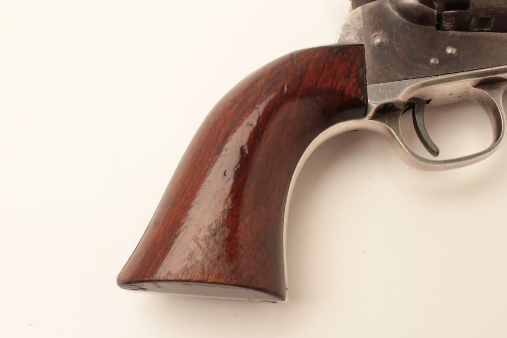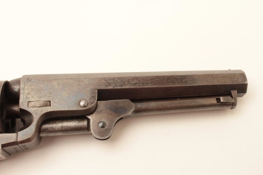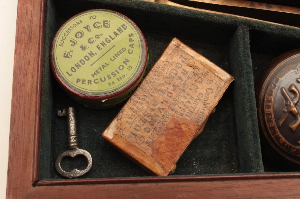 Colt Model 1849 Pocket percussion revolver, .31 caliber, 5” octagon barrel, blued and case hardened finish, wood grips, S/N 150693 (all visible #s matching); overall very good to near fine with considerable original blued and case color finish; majority of cylinder scene present; crisp action, sharp markings and near fine grips; majority of original silver wash remaining on brass straps; accompanied by a wood presentation partitioned casing with eagle powder flask, brass bullet mold, skin pack of cartridges, F. Joyce & Co. cap tin plus assorted lead bullets; key to case lock is also present. (Antique). Est.: $4,000-$8,000.