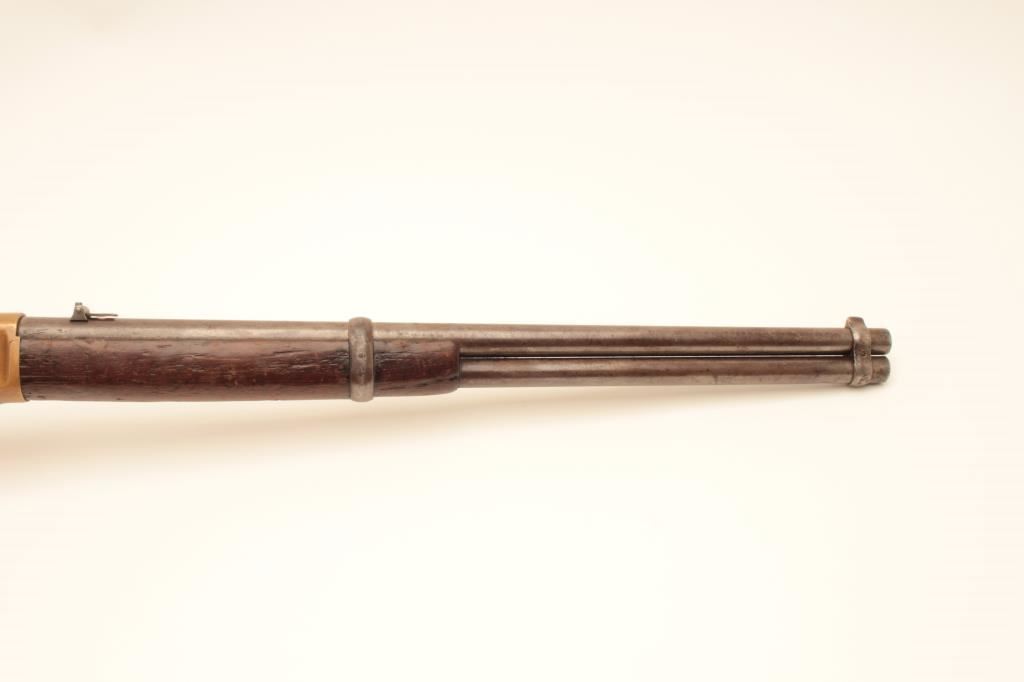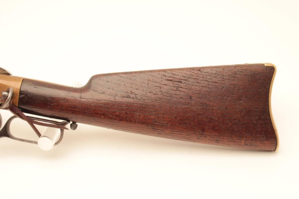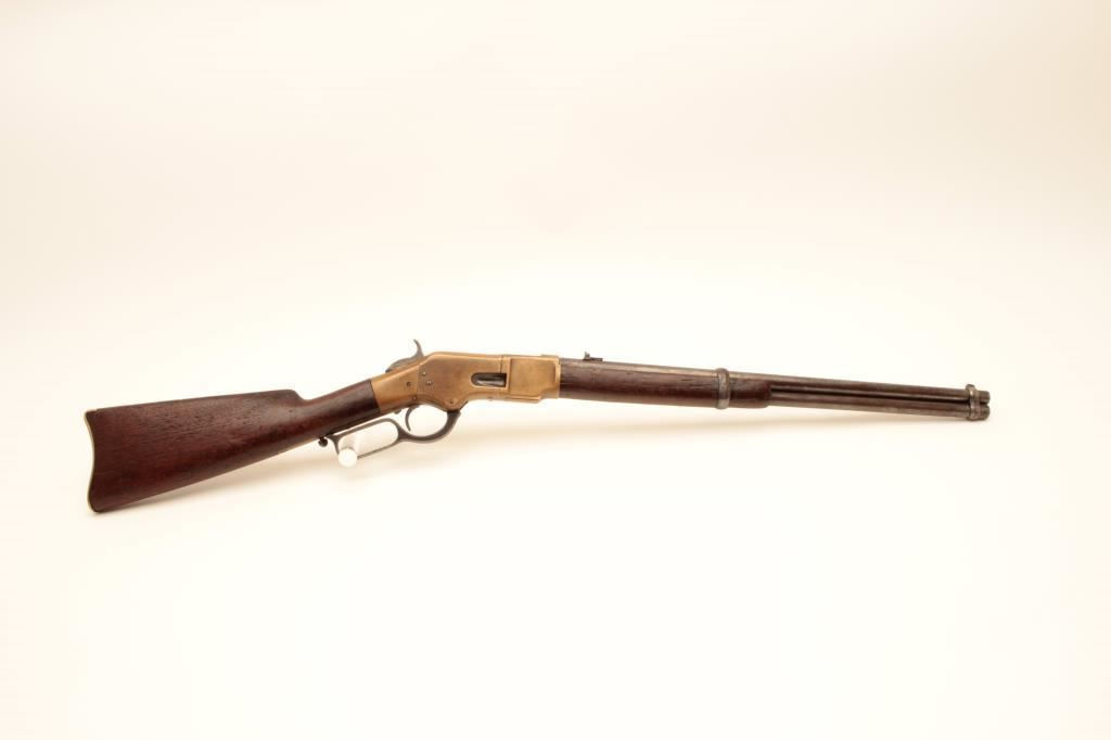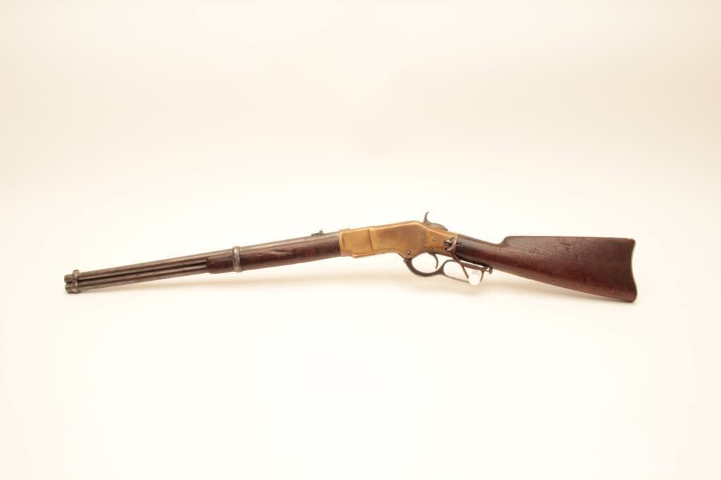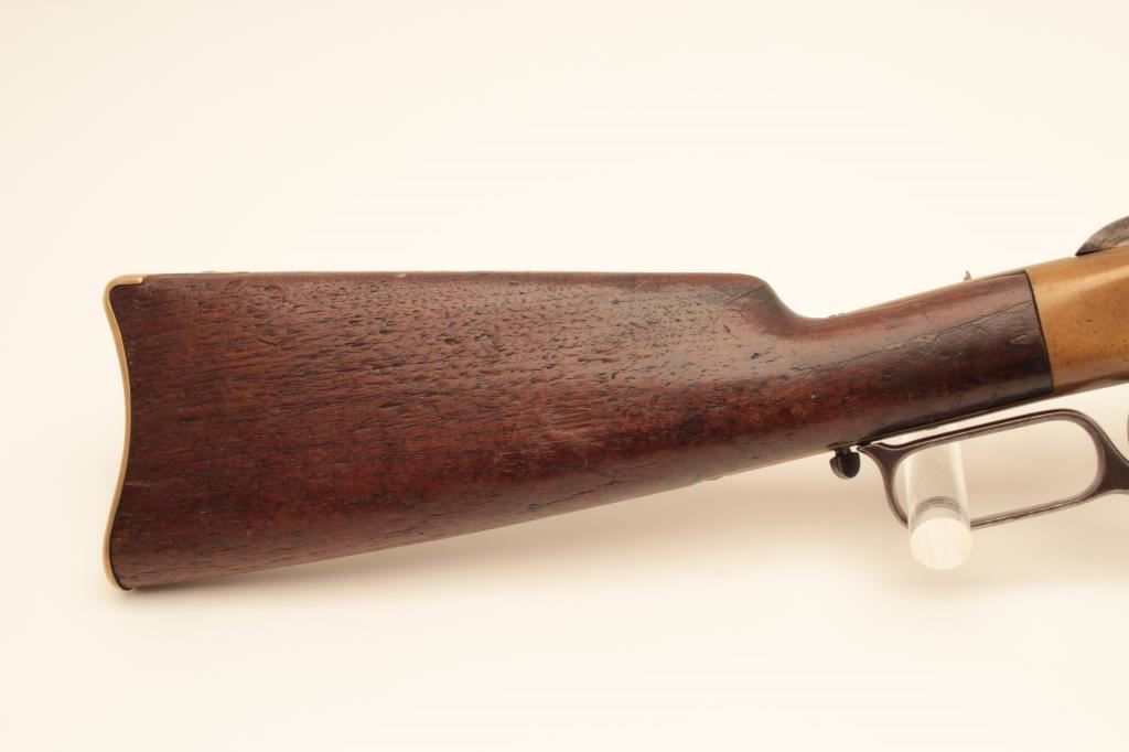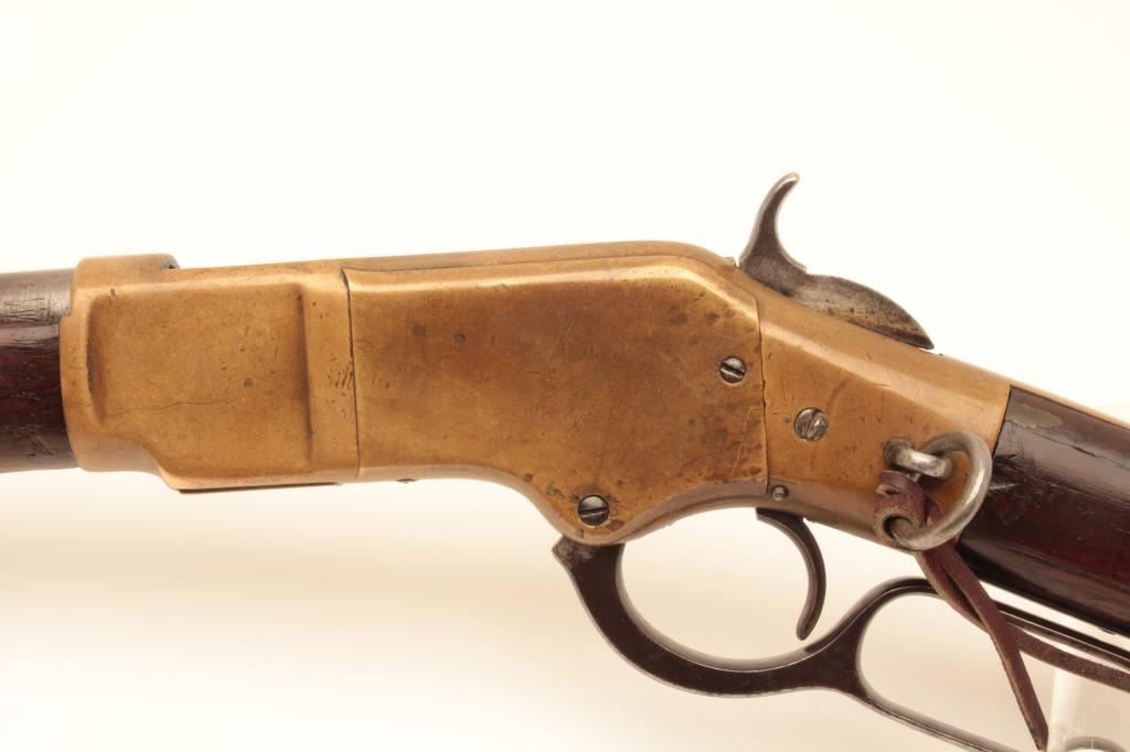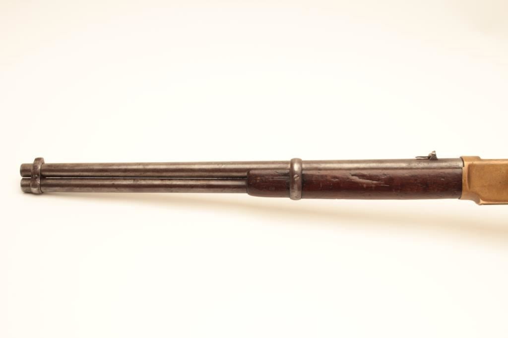 Winchester Model 1866 lever action SRC, .44 caliber, 20” barrel, brass frame, wood stocks, S/N 45296; overall good un-cleaned condition with brown patina to barrel and loading tube, pleasing taffy colored patina to brass receiver, good action, dark bore, good markings and weathered wood stocks showing some spots of old filler including repair to an old crack on the right side only of the butt stock at wrist. (Antique). Est.: $5,000-$8,000.