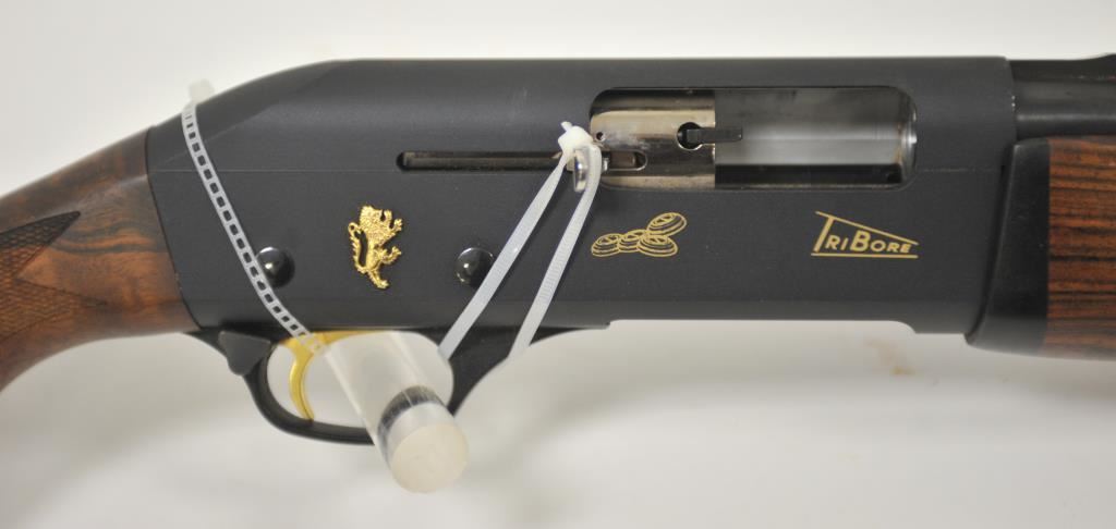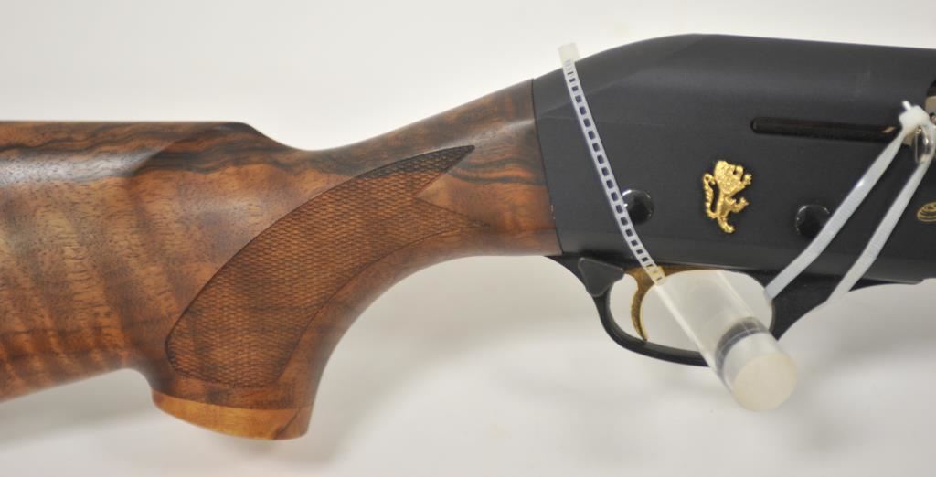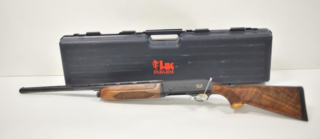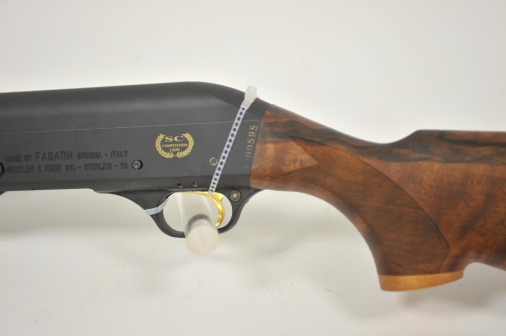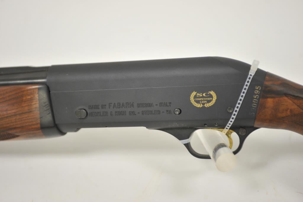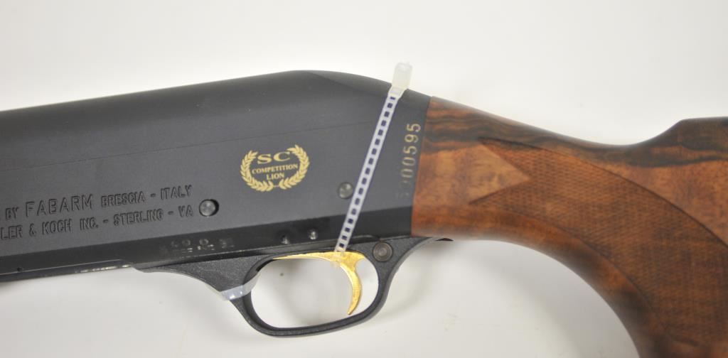 Fabarm H&K SC Competition Lion semi-automatic shotgun, 12 gauge, 28” ventilated and ported barrel, blued finish, checkered finely grained wood stocks, 4 screw-in chokes with factory hard carry case; S/N 5000595; overall excellent like new condition with gold trigger and gold lion on right side of receiver which also shows “RiBore” marking and 4 clays. (Modern/NO PPT). Est.: $400-$800.