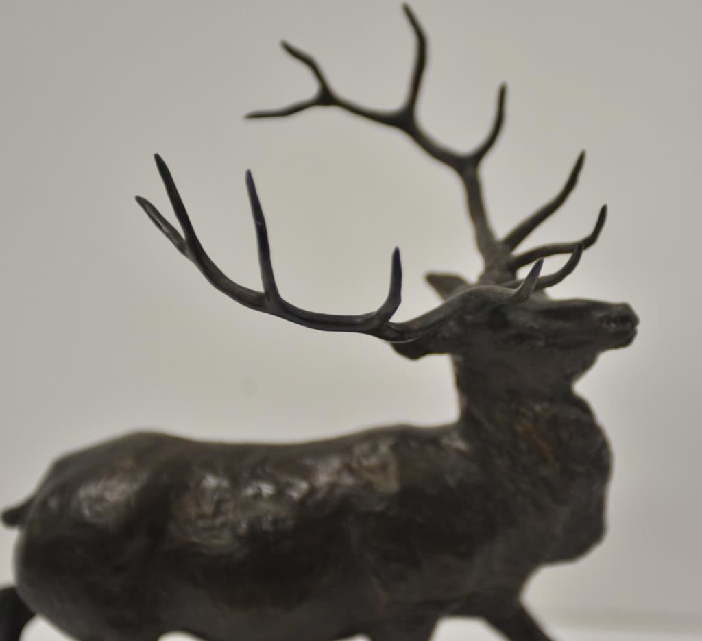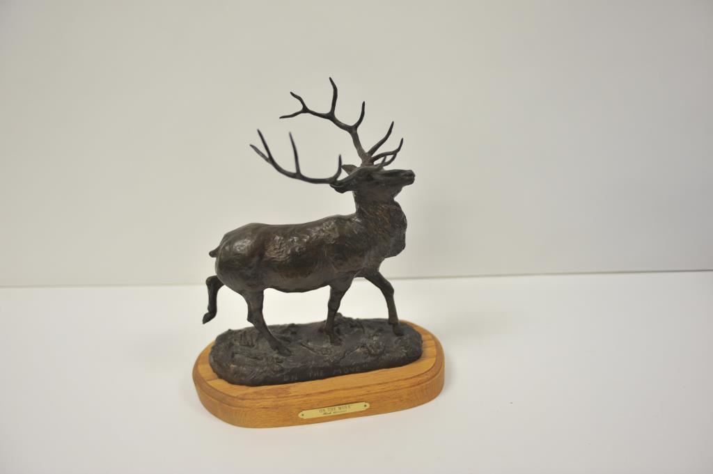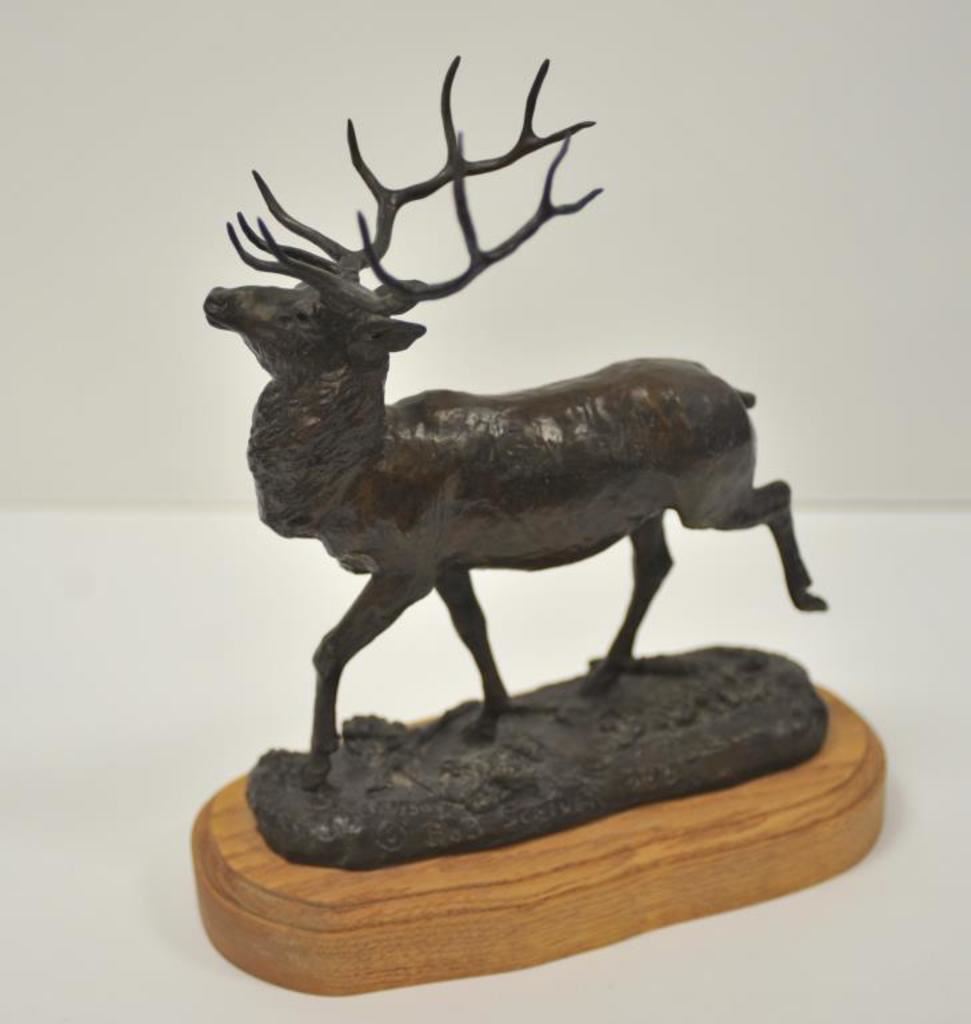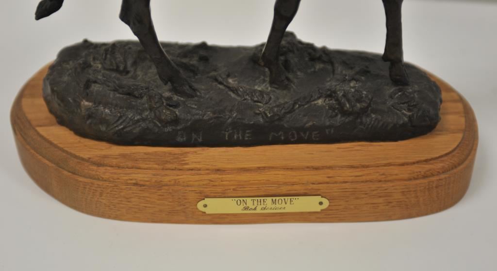 Limited edition bronze on wood base entitled “On The Move” of an elk, (72/250) by Bob Scriver (1987); approximately 11” in length x 13” in height; fine detail and patina. Est.: $400-$800.