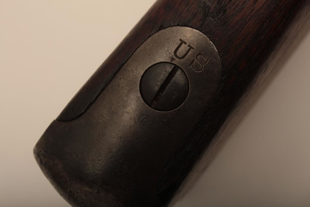 U.S. Springfield Trapdoor rifle, .45-70 caliber, 32.5” barrel, blued and case hardened finish, wood stock, sling swivels, iron cleaning rod, S/N 7469; overall very good + condition with a very good + bore, crisp action, sharp markings, brown patina to barrel, silver toning to trapdoor; “MASS” stamped on front base of trapdoor hinge (Massachusetts); very good wood with partial circle P proof and visible inspector’s cartouche “SWP/1876”. (Antique). Est.: $500-$1,000.