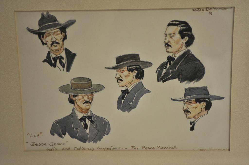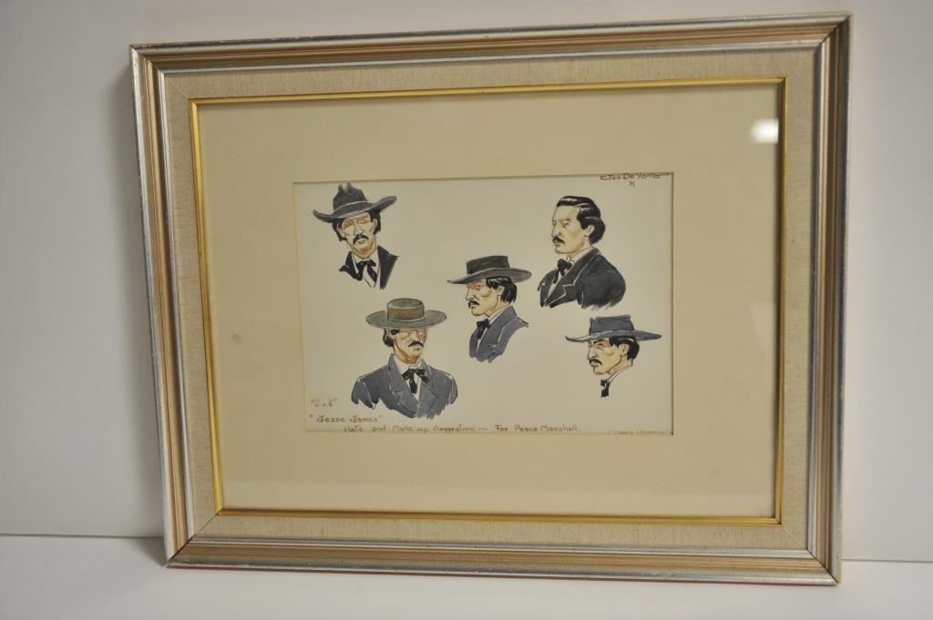 Framed and matted work by Joe De Yong (the only protégé of Charlie Russell) of 5 different production portraits of “Jesse James” with notation lower right hand corner “For Peace Marshall/Co. Harry Sherman Co.”; approximately 18.5” x 23.5” overall. Est.: $500-$1,000.