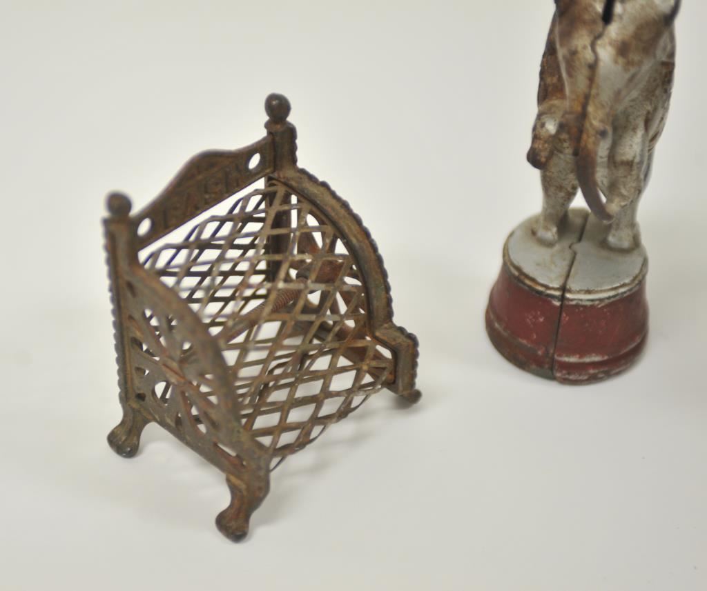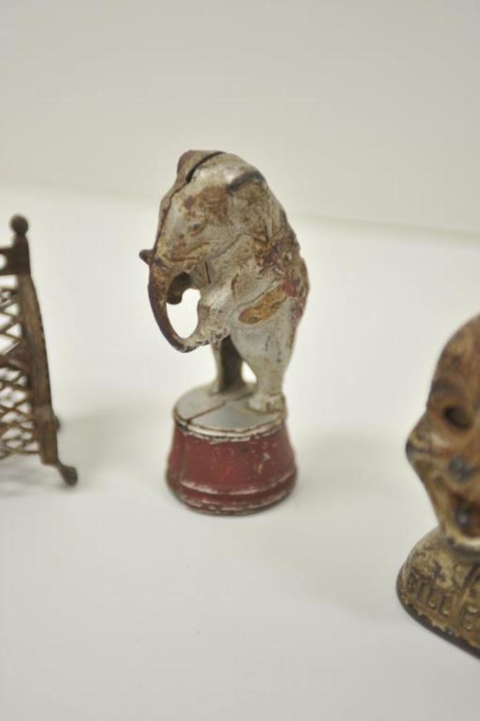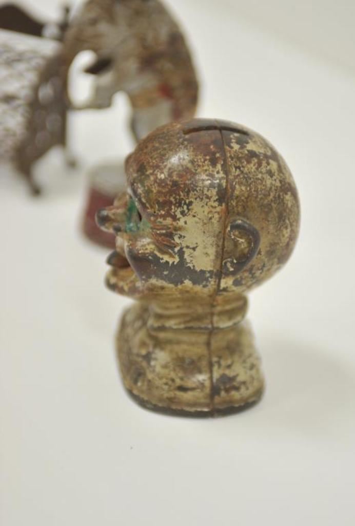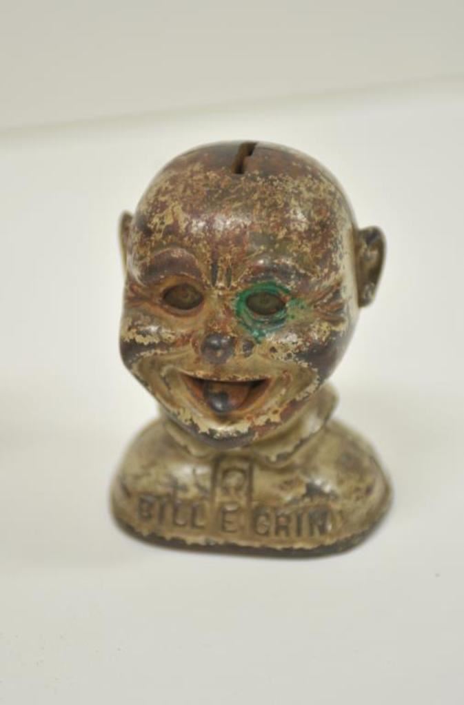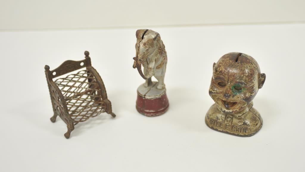 Lot of 3 authentic antique metal banks including a rearing elephant, an old style cash register and a “Bill E. Grin” head bank that rolls his eyes and sticks out his tongue when a coin is deposited in the top of his head. Est.: $250-$500.