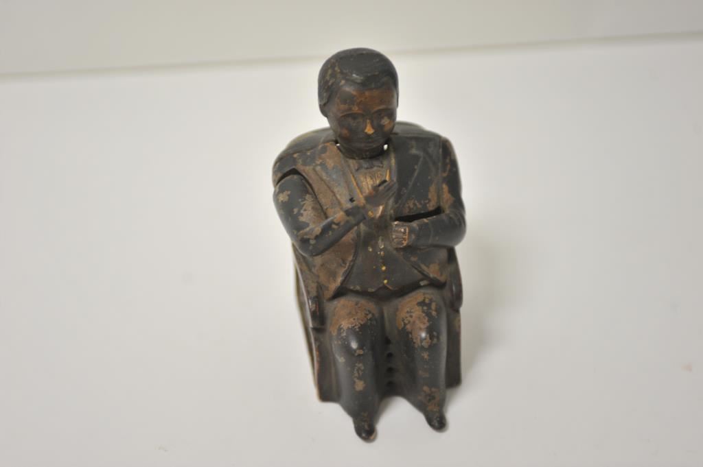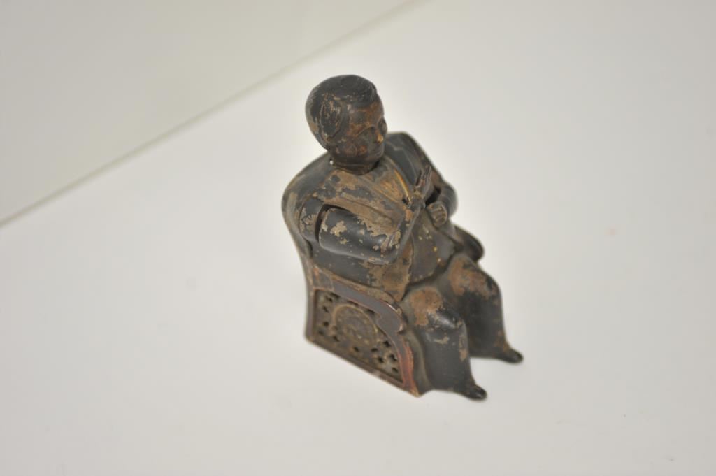 Metal Tammany bank with 80-90% original paint, small damage to hand, some scattered nicks, etc. Classic! Est.: $175-$350.