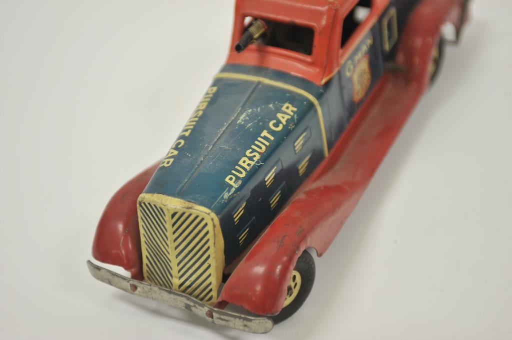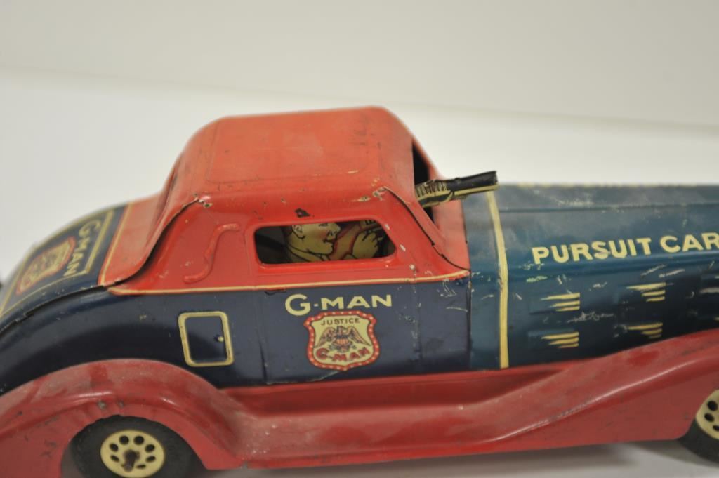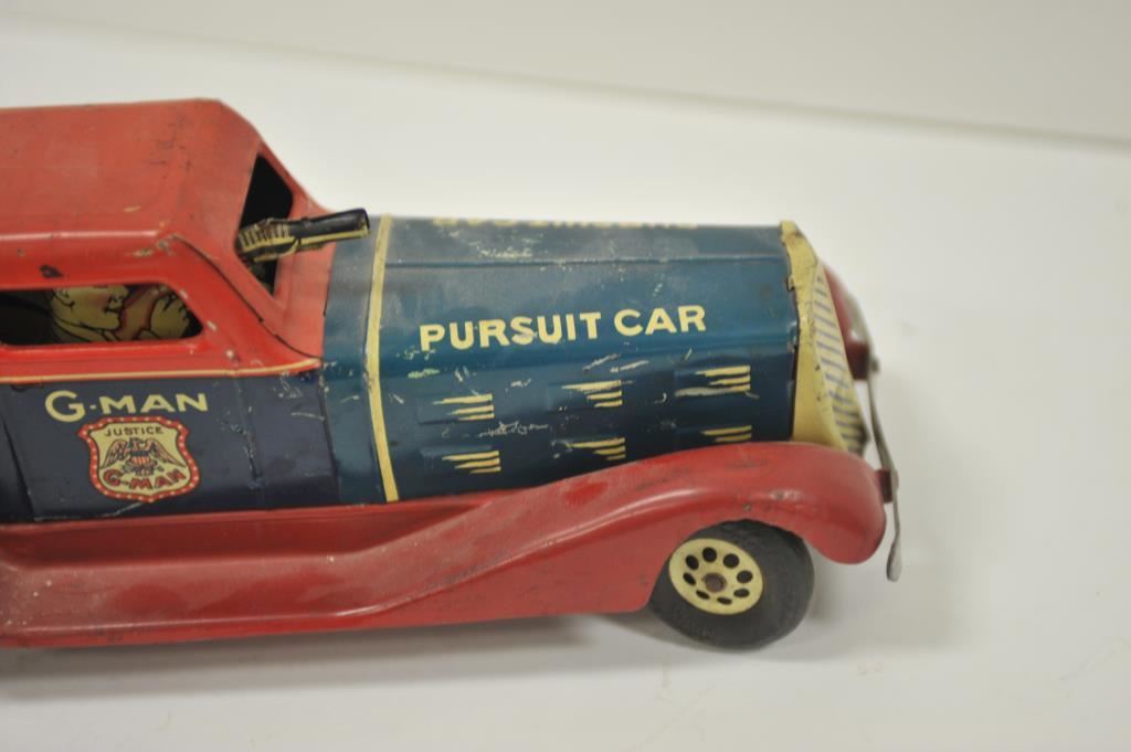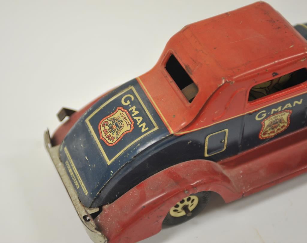 Louis Marx & Co. tin friction “G-Man Pursuit Car”; approximately 14” long x 6” wide x 5.5” in height; overall very good condition showing majority of original un-cleaned paint; very collectible; ca. 1930’s. Est.: $300-$600.