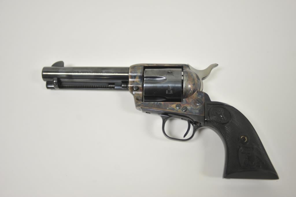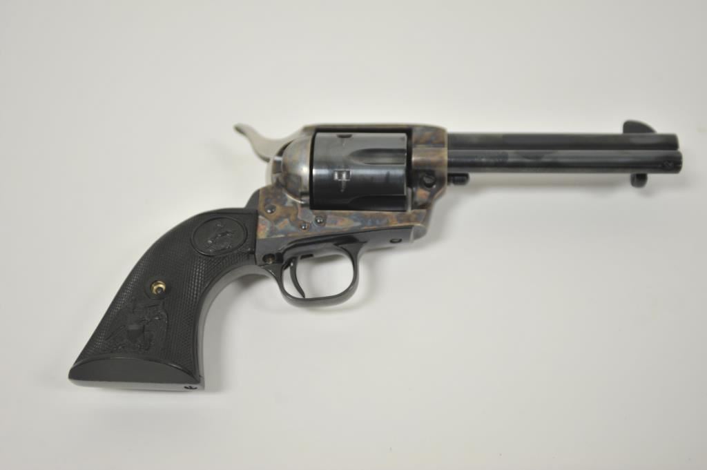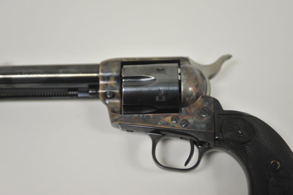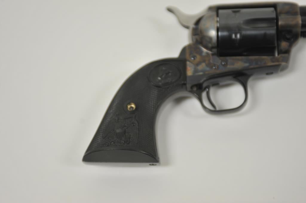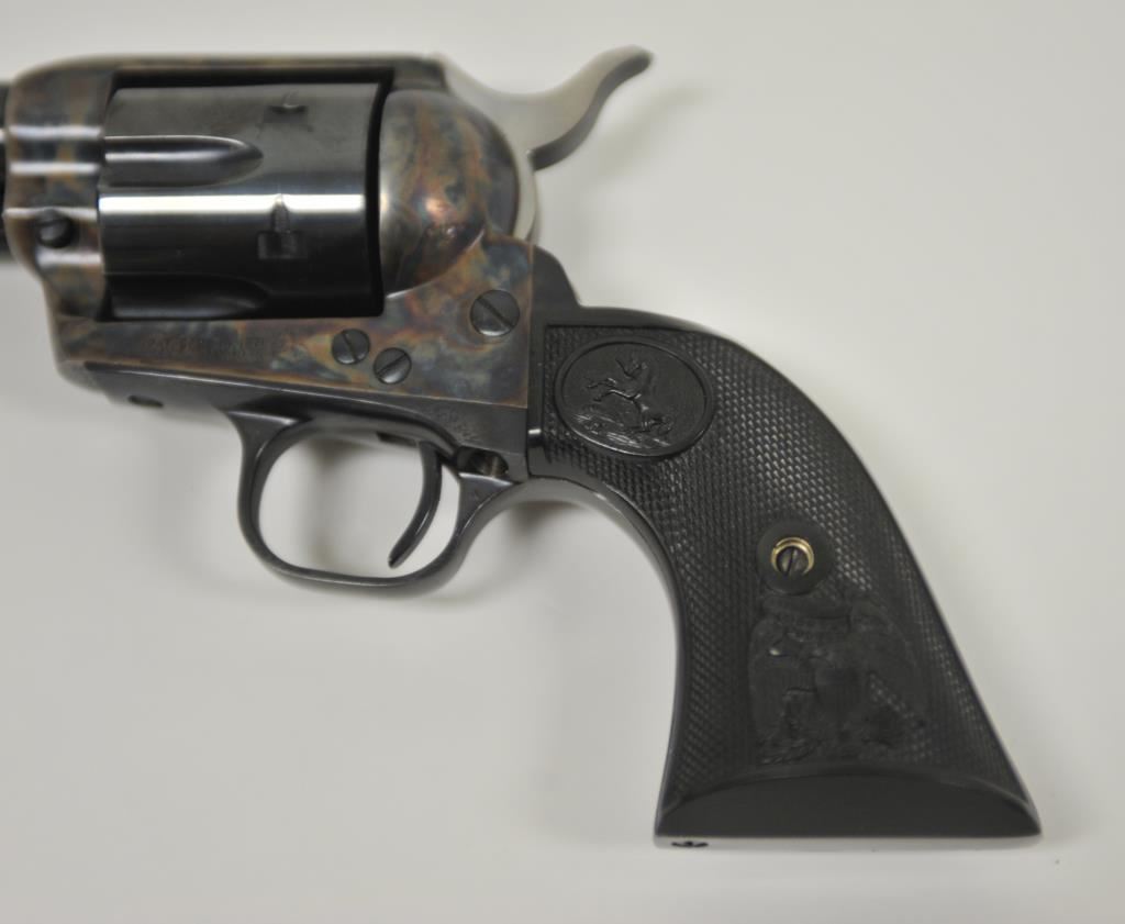 Colt 3rd Generation SAA revolver, .45 caliber, Serial #SA45272. The pistol in in fine overall condition with a 4 ¾” barrel. The barrel and cylinder retain nearly all of their blue finish with only light handling marks and a faint drag line. The frame shows beautiful case hardening. The checkered plastic eagle grips are in very good condition with sharp checkering showing little to no use. The bore is very good, the action crisp and markings are sharp on this desirable third generation SAA. Est.: $900-$1,800. (Modern).