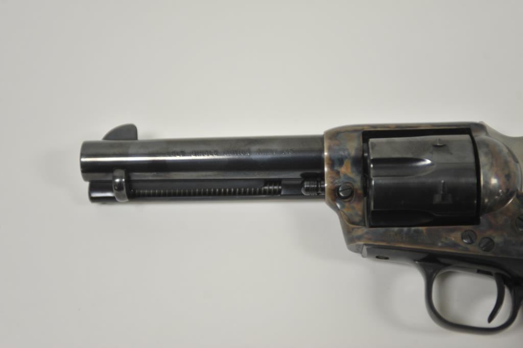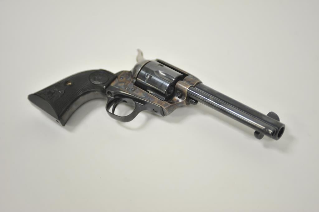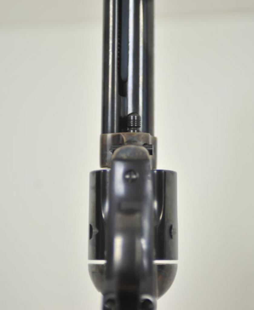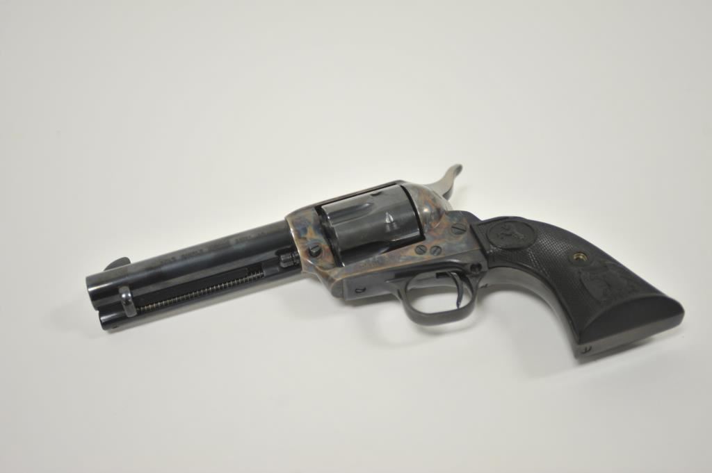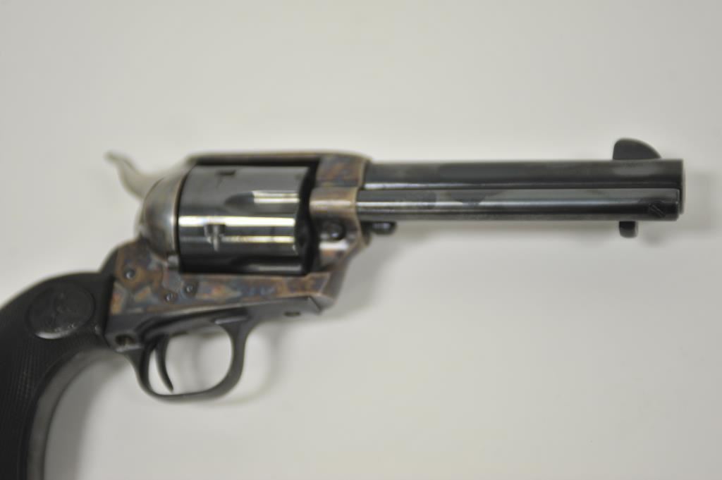 Colt 3rd Generation SAA revolver, .45 caliber, Serial #SA45272. The pistol in in fine overall condition with a 4 ¾” barrel. The barrel and cylinder retain nearly all of their blue finish with only light handling marks and a faint drag line. The frame shows beautiful case hardening. The checkered plastic eagle grips are in very good condition with sharp checkering showing little to no use. The bore is very good, the action crisp and markings are sharp on this desirable third generation SAA. Est.: $900-$1,800. (Modern).