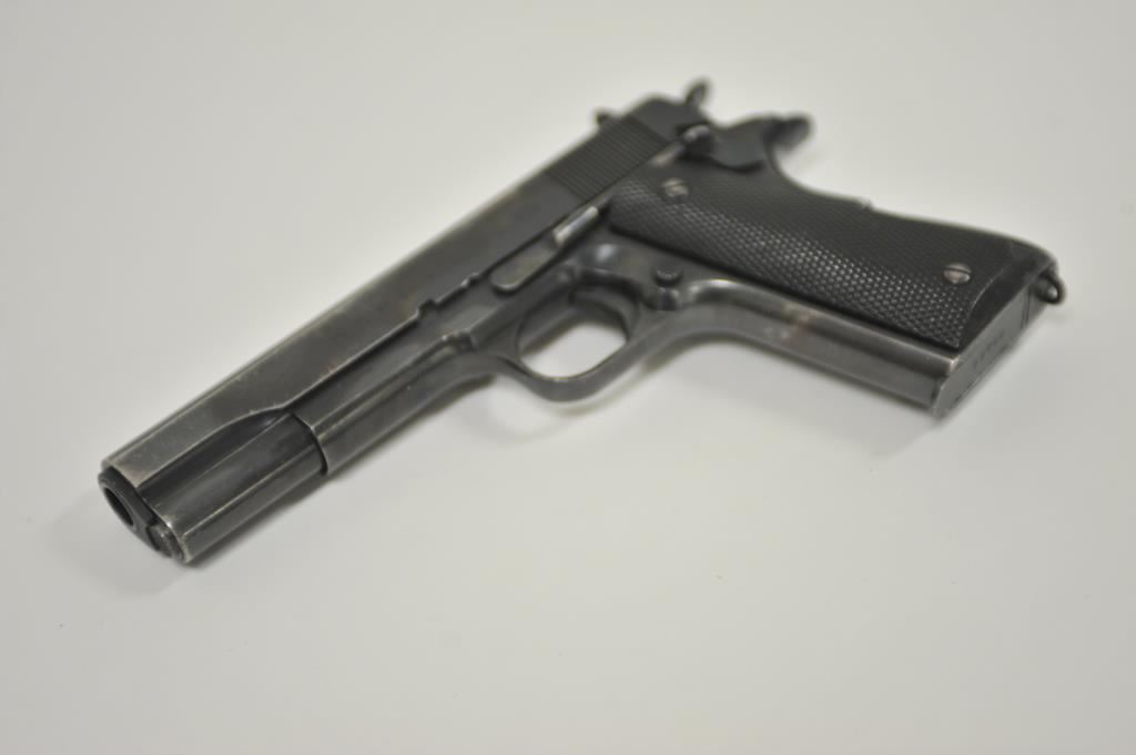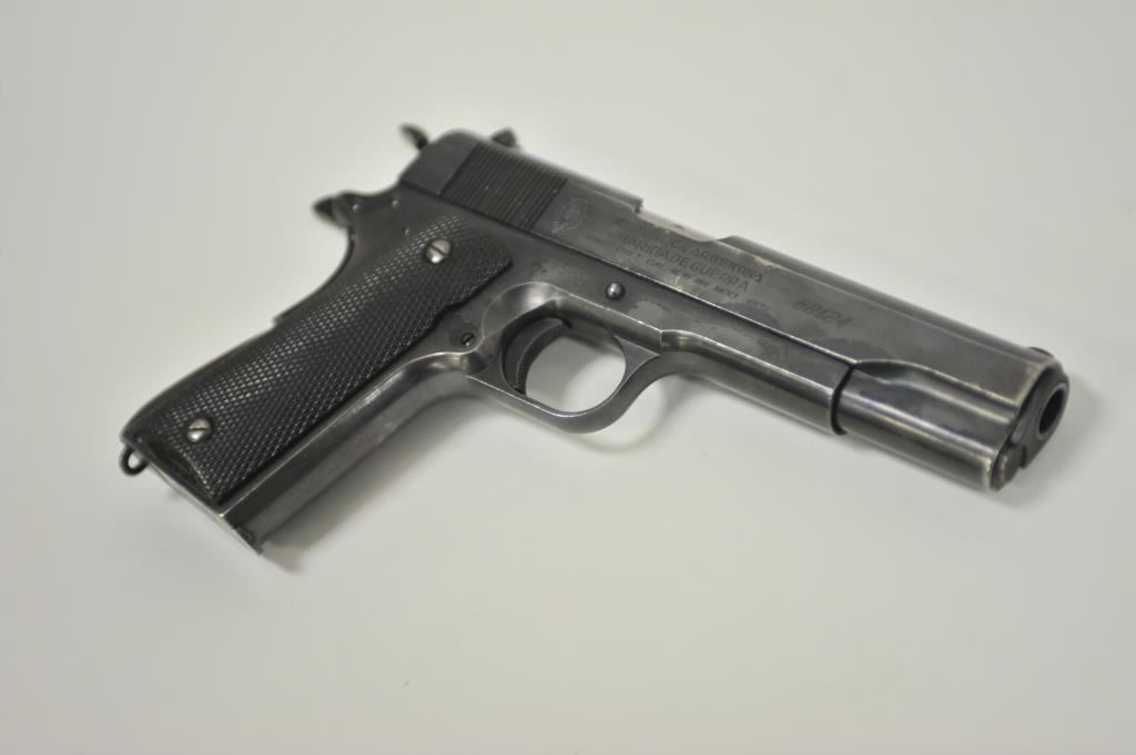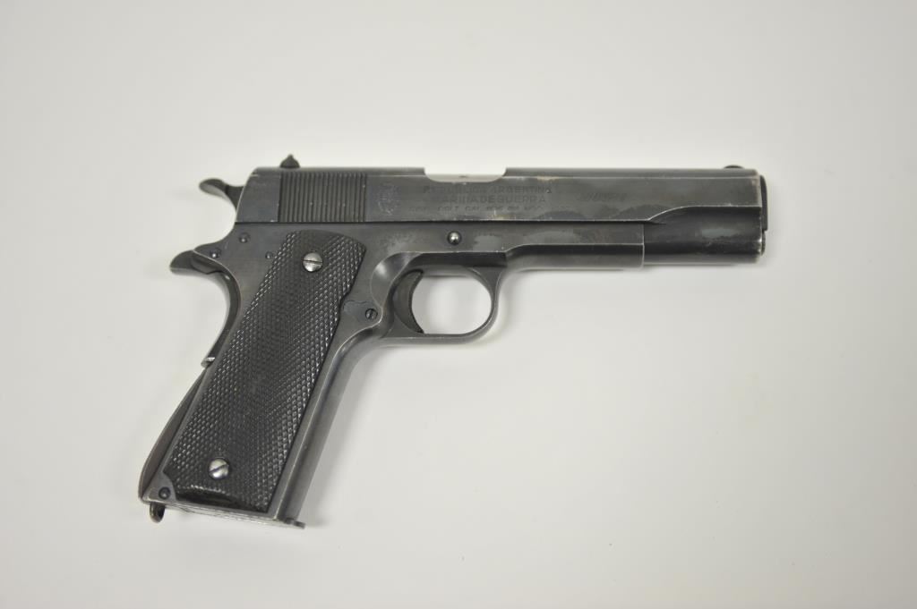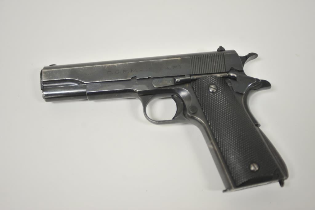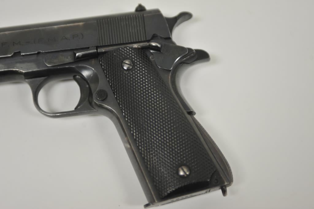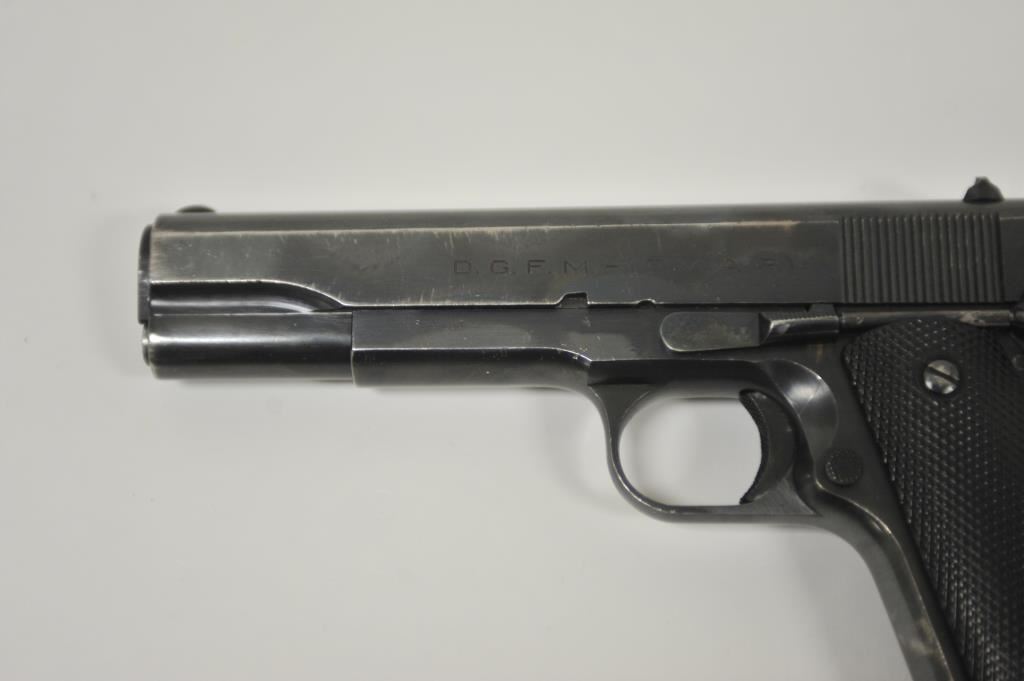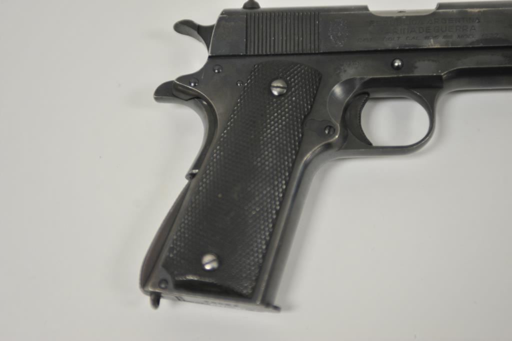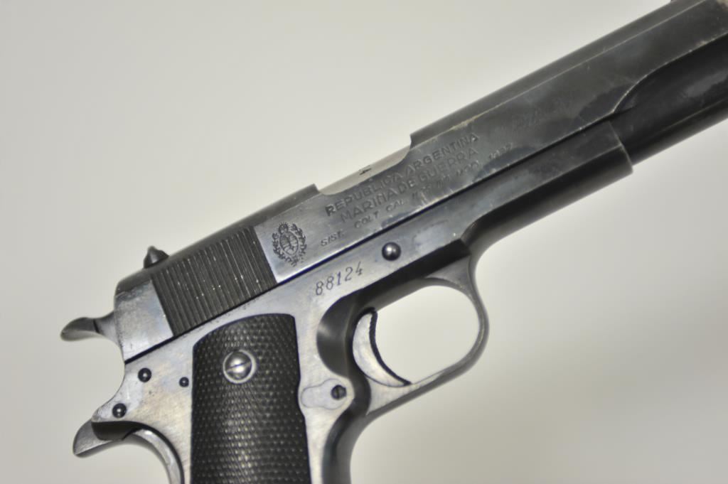 DGFM Argentine Navy 1911 semi-automatic pistol, .45 caliber, Serial #88124. The pistol is in very good overall condition with a 5” barrel. The pistol retains the majority of its blue finish with holster wear at the muzzle and high point edge wear along the slide. The left side of the frame is import marked, while the right side reads, “REPUBLICA ARGENTINA MARINA DE GUERRA”. The checkered plastic grips are in good condition showing moderate wear and there is a lanyard loop at the rear of the magazine well. The pistol includes one correct magazine, which is serialized but not matching. The bore is good, the action is crisp and markings are sharp on this nice Argentine Navy pistol. Est.: $700-$1,400. (C+R).