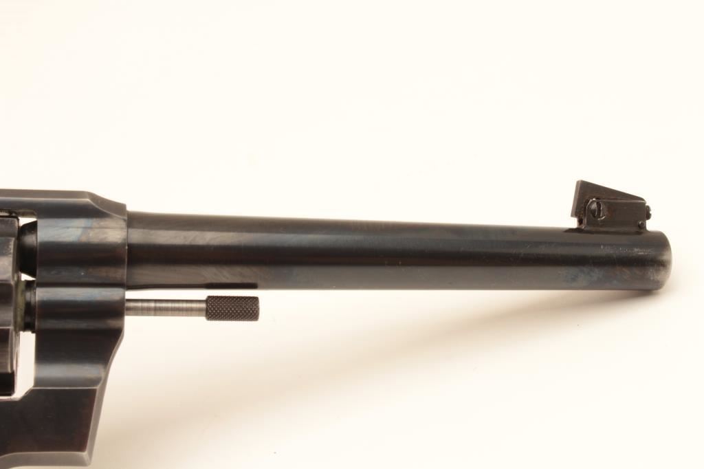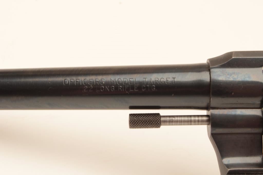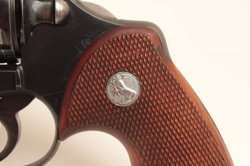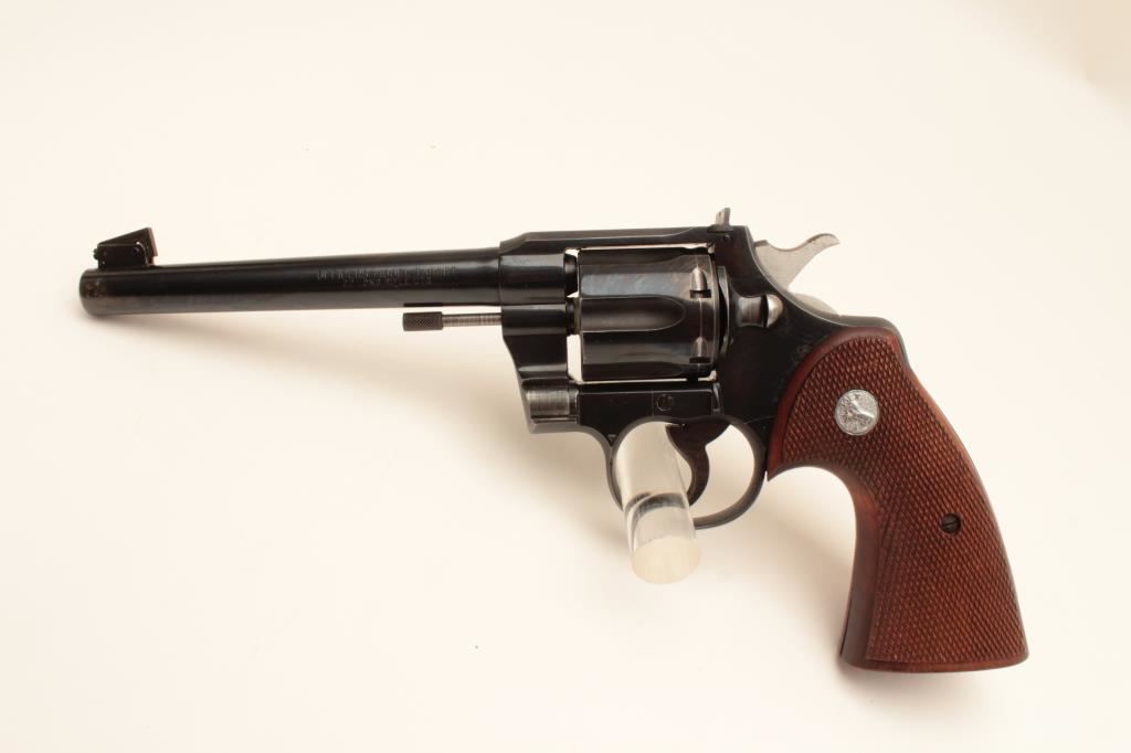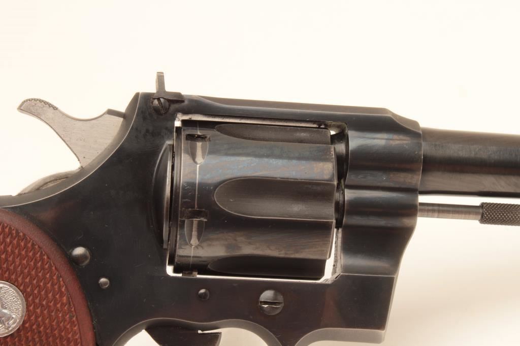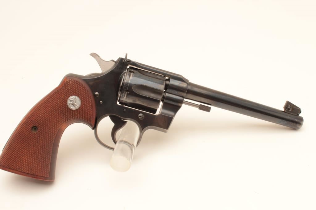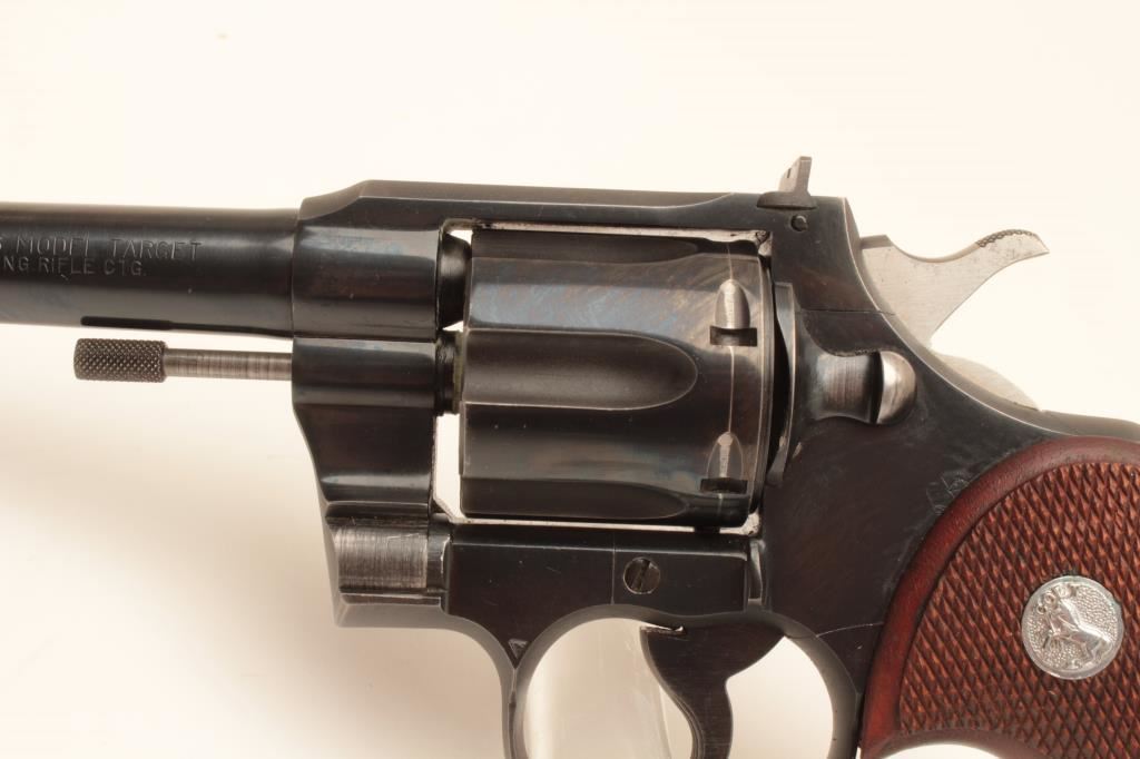 Colt Officers Model Target revolver, .22 Long Rifle caliber, Serial #56830. The pistol is in fine overall condition with a 6” barrel with an adjustable target front sight. The pistol retains the majority of its blue finish with light wear at the muzzle and a drag line on the cylinder. The checkered wood medallion grips are in very good condition with sharp checkering showing little use. The bore is good, the action crisp and markings are sharp on this lightly used Officers Model. Est.: $700-$1,400. (C+R).