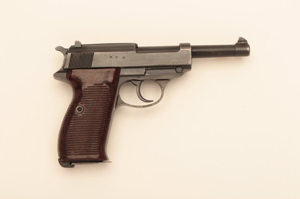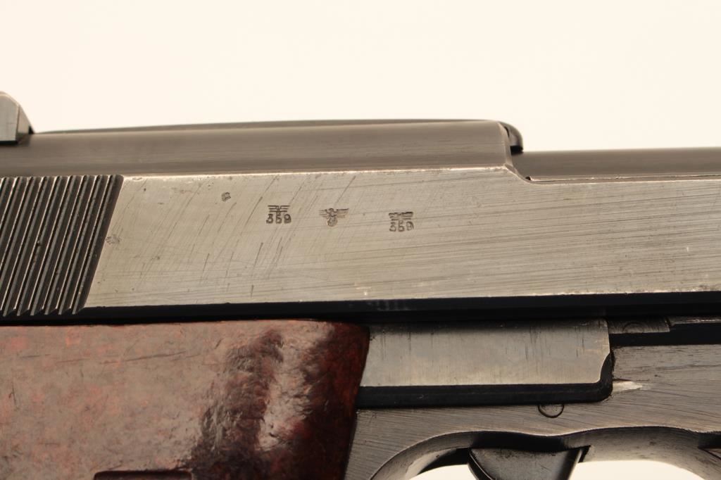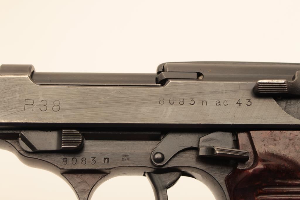 Mauser P-38 semi-automatic pistol, 9mm caliber, Serial #8083N. The pistol is in very good to nearly fine overall condition with 4 ¾” barrel. The pistol retains the majority of its blue finish with light wear at the muzzle. The slide is marked, “ac43” and features eagle proofs on the frame, slide and magazine with a Nazi proof on the slide. The ribbed plastic grips are in very good condition showing little use. The bore is good, the action is crisp and the markings are sharp on this desirable WWII era P-38. Est.: $500-$1,000. (C+R).