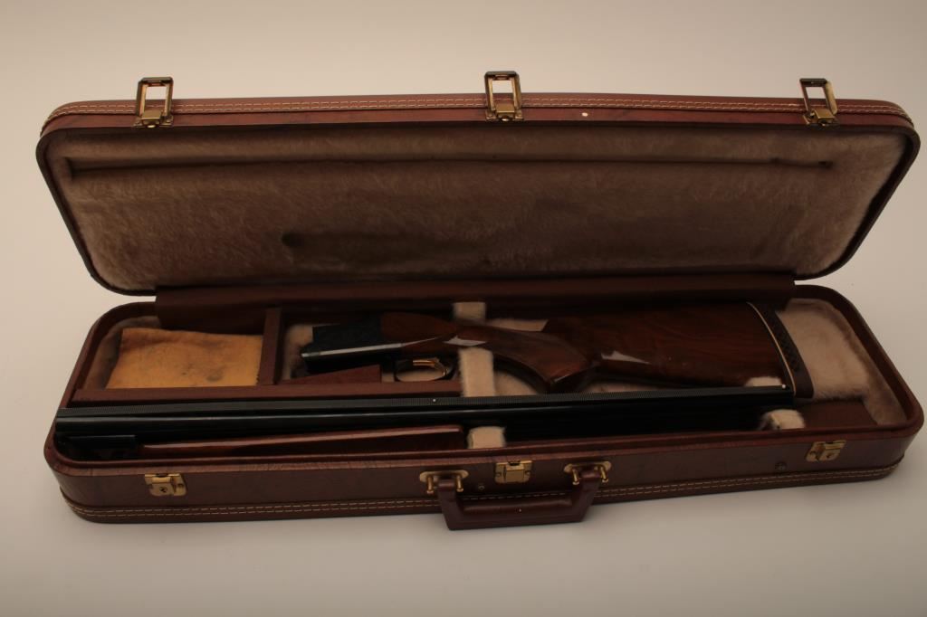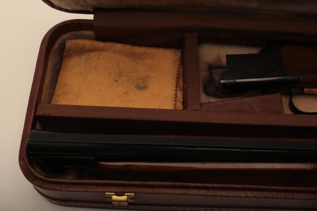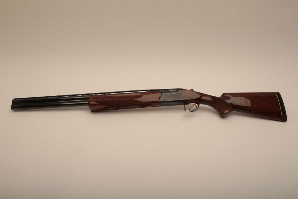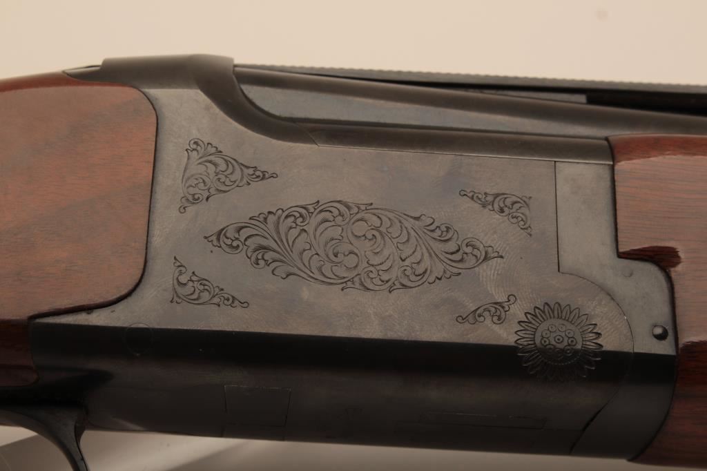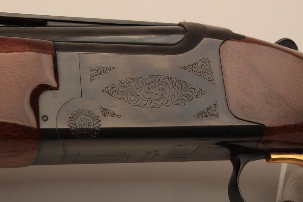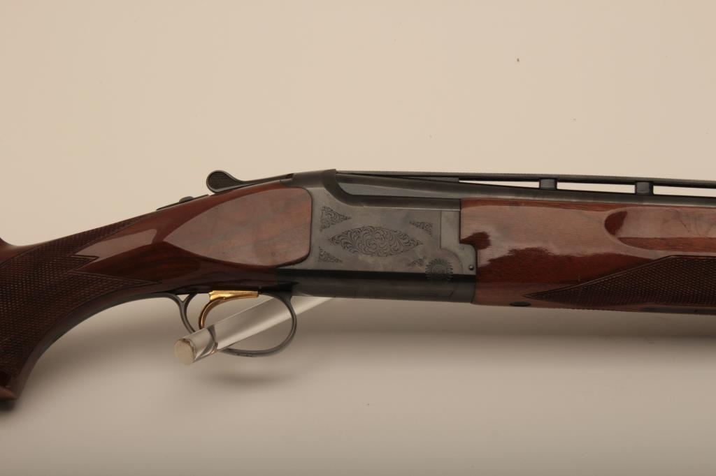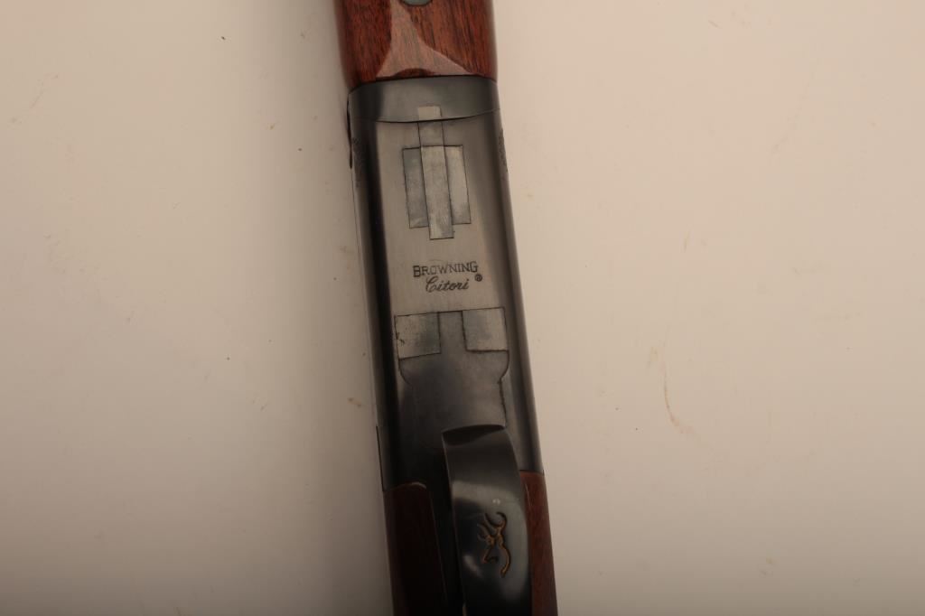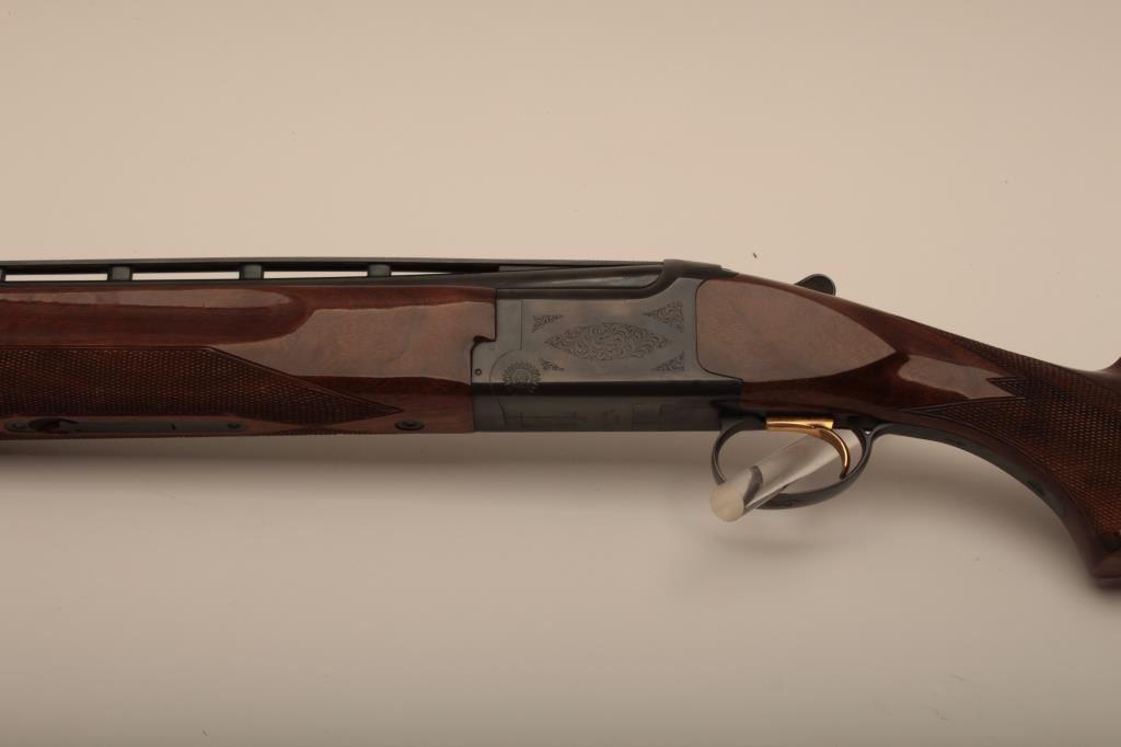 Browning Citori O/U shotgun, 12 gauge, Serial #09571PN1B3. The shotgun is in very good overall condition with 26” barrels with a full-length ventilated rib and ivory bead front sight. The metal surfaces retain the majority of their blue finish with edge wear and small mars from carry and use. The Receiver features tasteful engraving and a single gold trigger. The checkered wood stocks are in very good condition with small mars and compressions consistent with field use. The butt stock ends with a ventilated rubber pad providing a 14 ½” LOP. The bores are good, the action is crisp and the markings are sharp on this desirable Browning. The lot includes a Browning shotgun case. Est.: $800-$1,600. (Modern).
