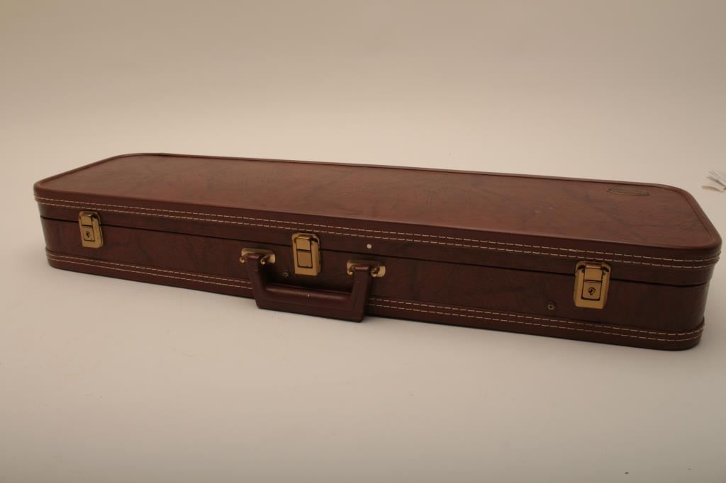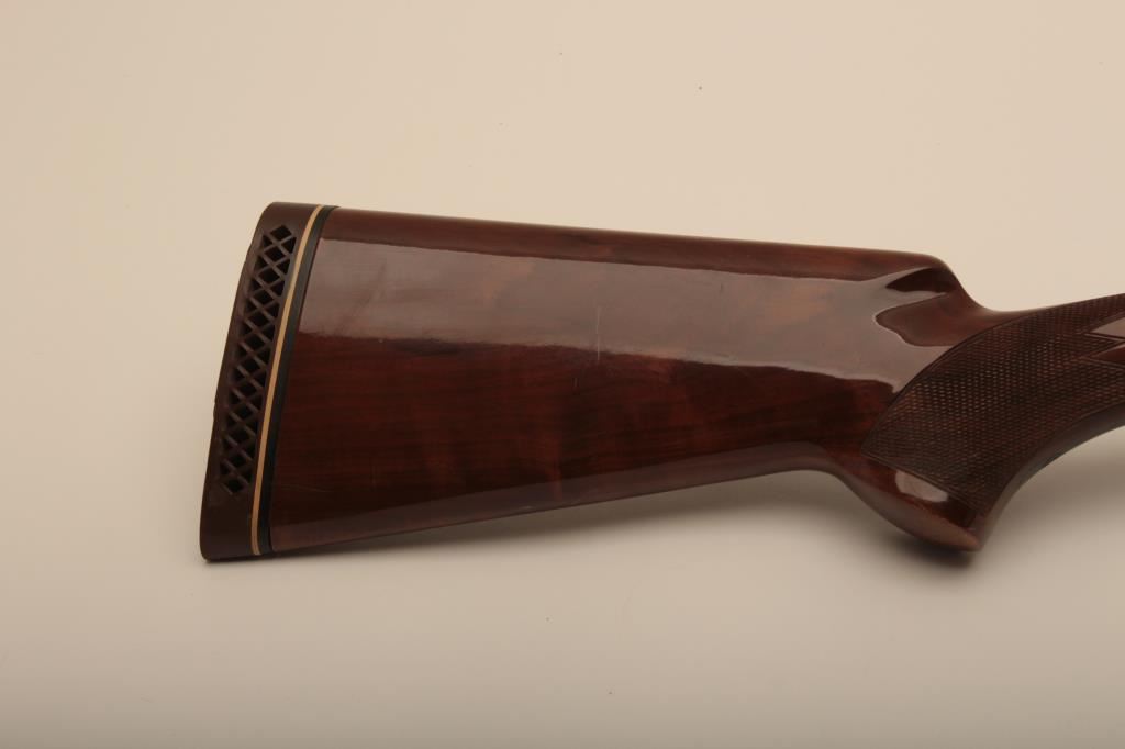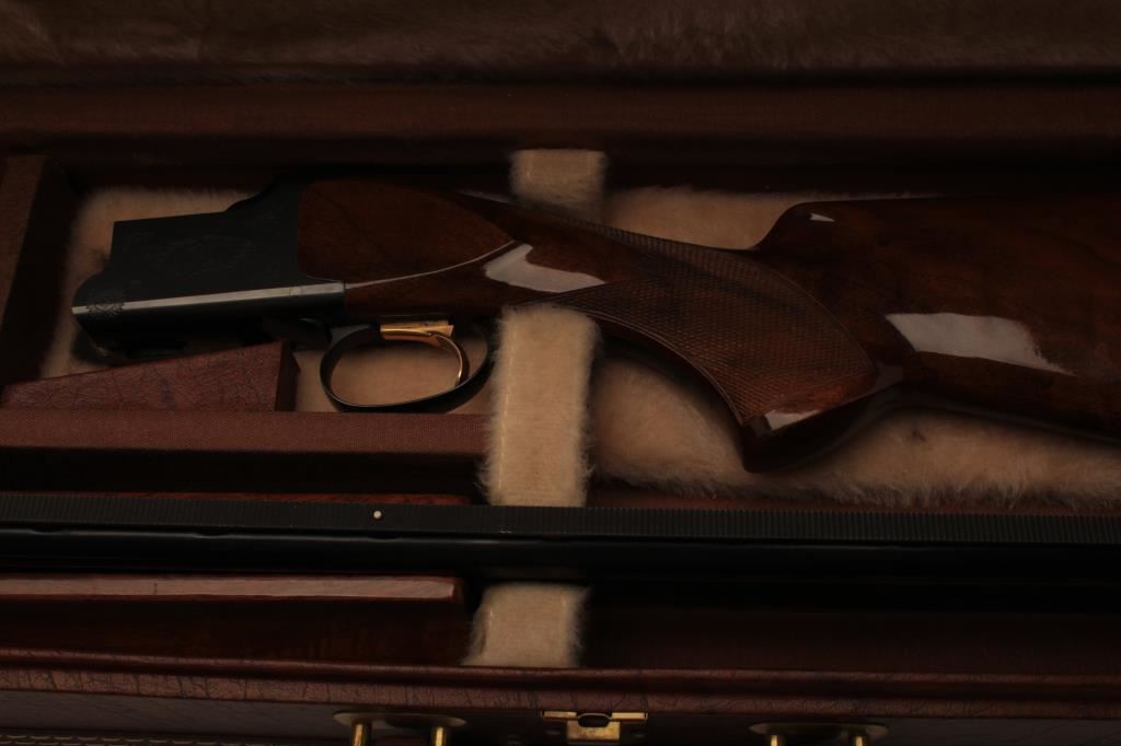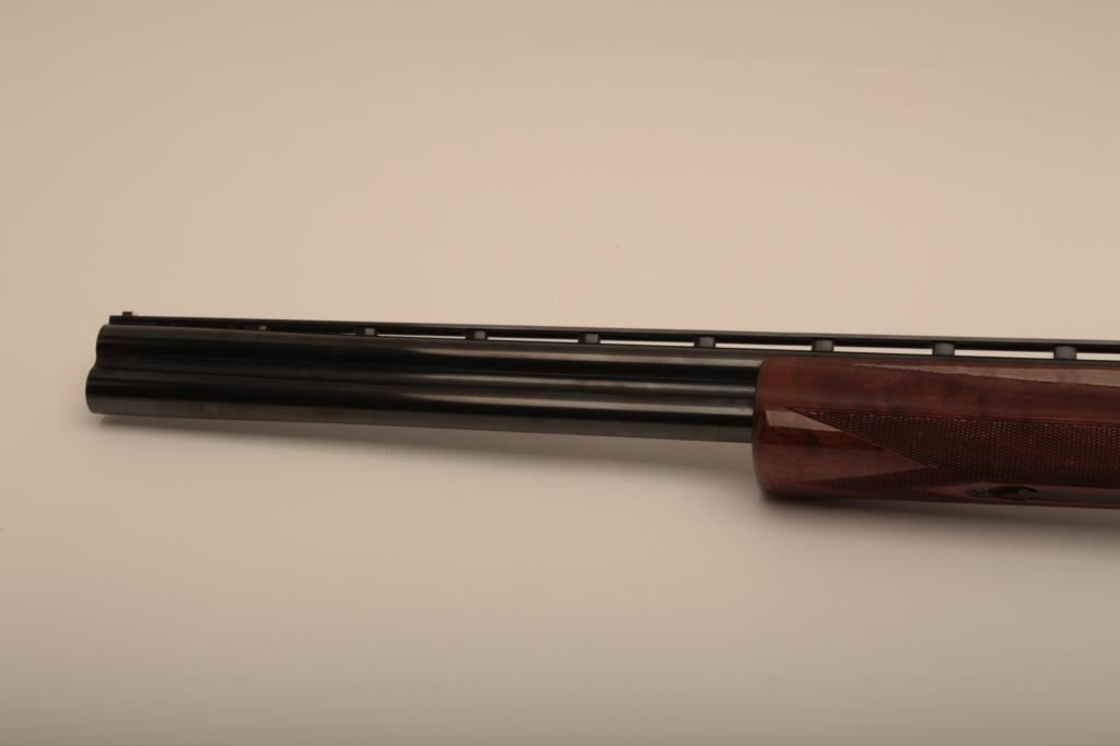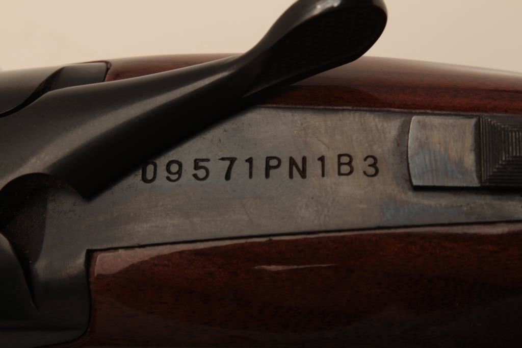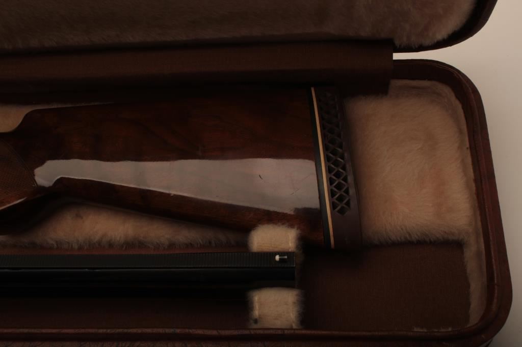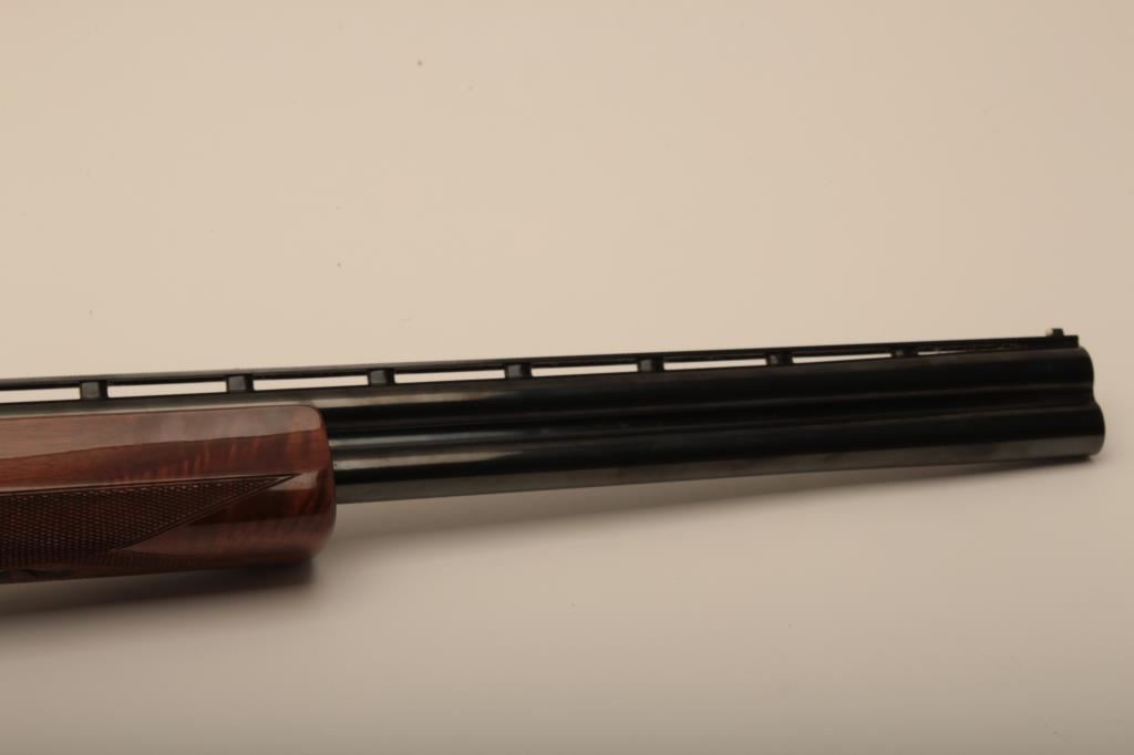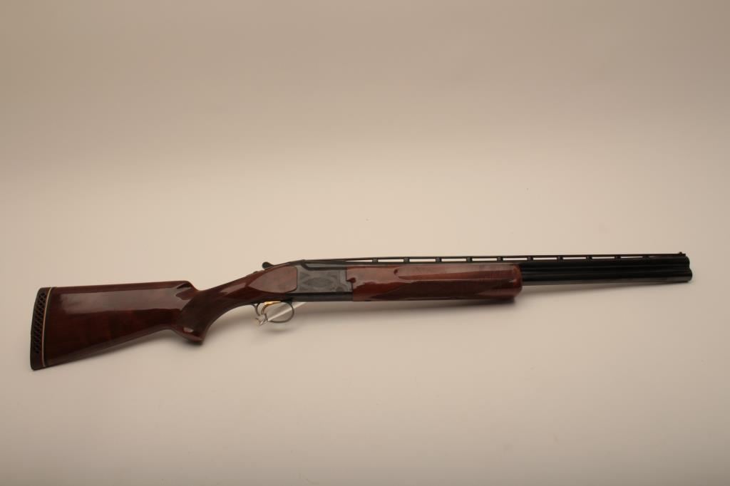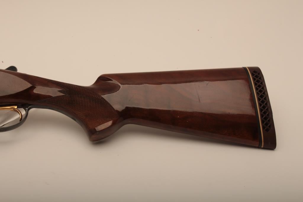 Browning Citori O/U shotgun, 12 gauge, Serial #09571PN1B3. The shotgun is in very good overall condition with 26” barrels with a full-length ventilated rib and ivory bead front sight. The metal surfaces retain the majority of their blue finish with edge wear and small mars from carry and use. The Receiver features tasteful engraving and a single gold trigger. The checkered wood stocks are in very good condition with small mars and compressions consistent with field use. The butt stock ends with a ventilated rubber pad providing a 14 ½” LOP. The bores are good, the action is crisp and the markings are sharp on this desirable Browning. The lot includes a Browning shotgun case. Est.: $800-$1,600. (Modern).