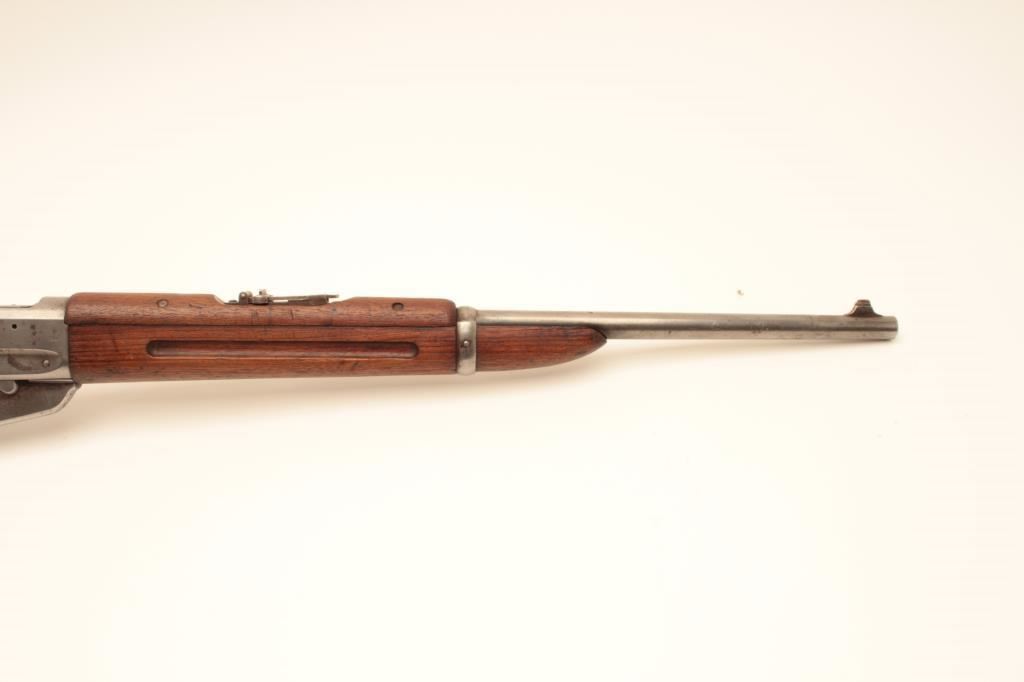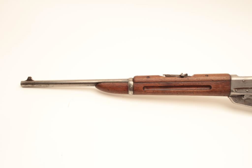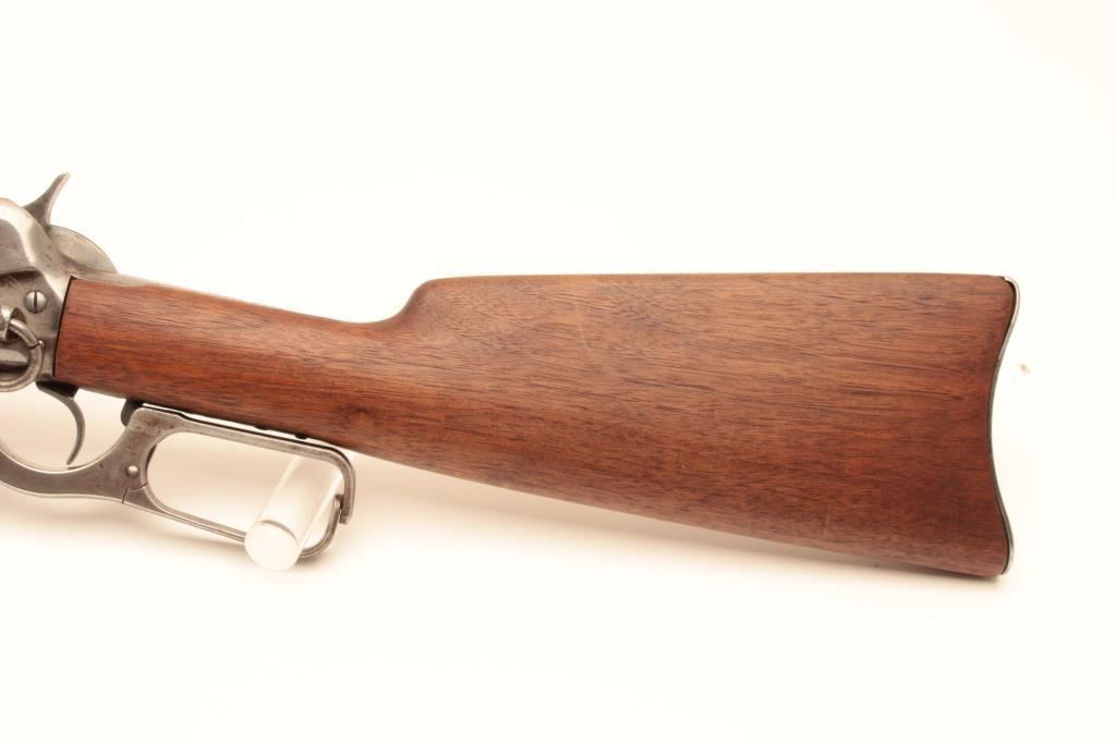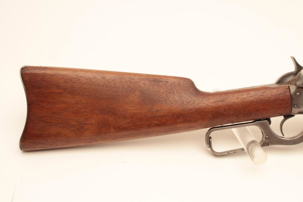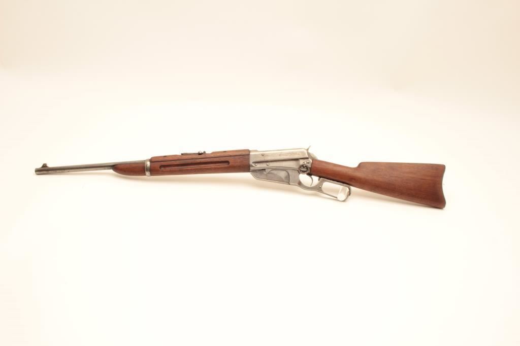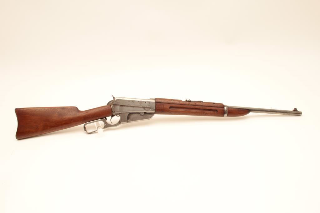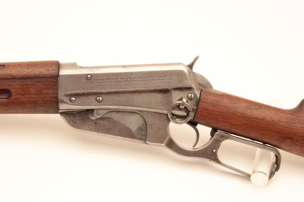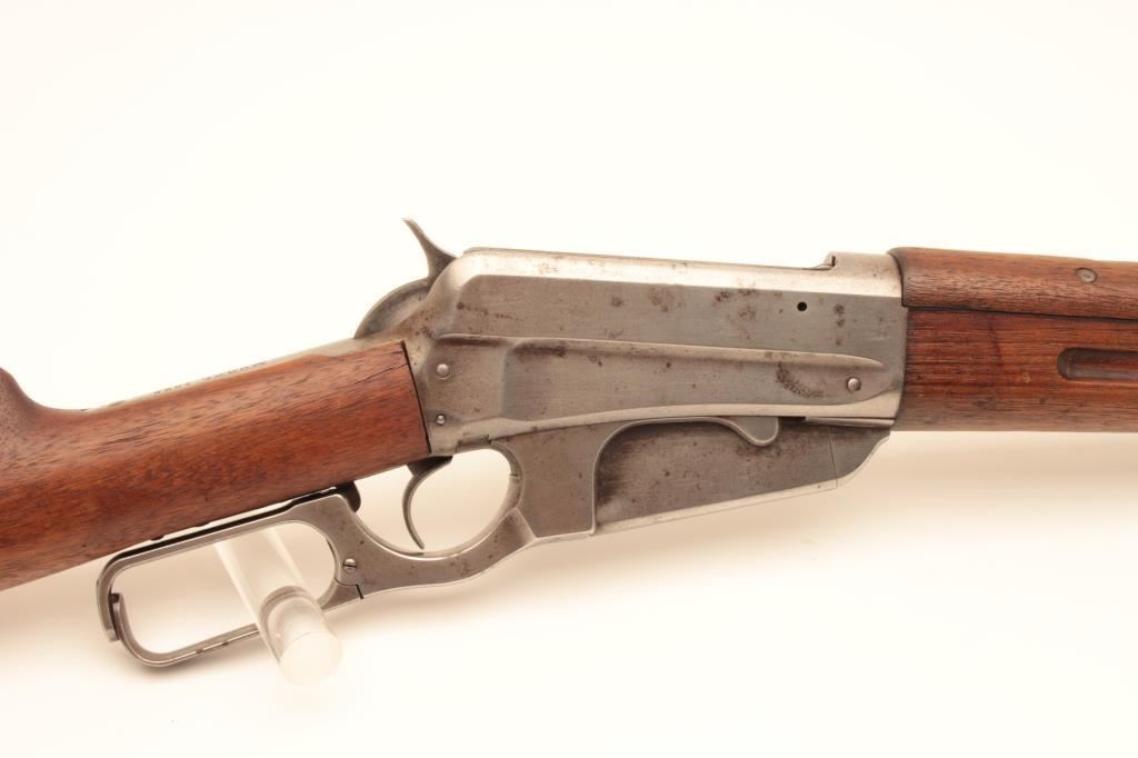Winchester Model 1895 lever action saddle ring carbine, .303 British caliber, Serial #57323. The carbine is in good overall condition with a 22” barrel with a ramped blade front and military style tangent rear sights. The metal surfaces are all a uniform silver patina with some traces of original blue in the protected areas and light surface rust that has been cleaned on the receiver. The hammer and trigger show muted case hardening and the saddle ring is retained. The smooth wood stocks are in good condition with small mars and a 3” lateral crack on top of the fore end. The butt stock ends with a smooth steel butt plate with trap. The bore is only fair, the action crisp and markings are sharp. Est.: $500-$1,000. (C+R).