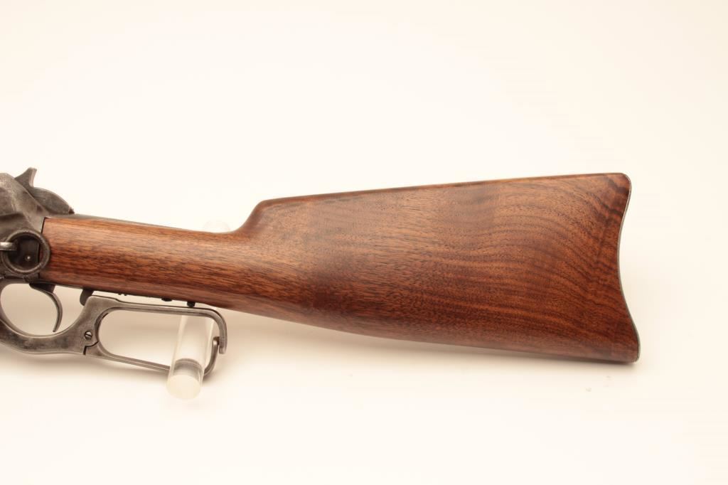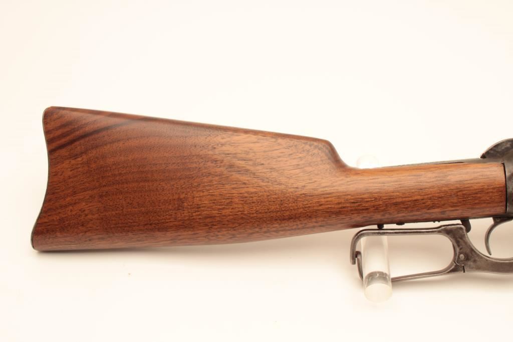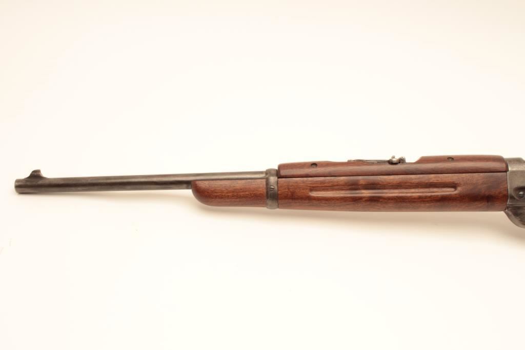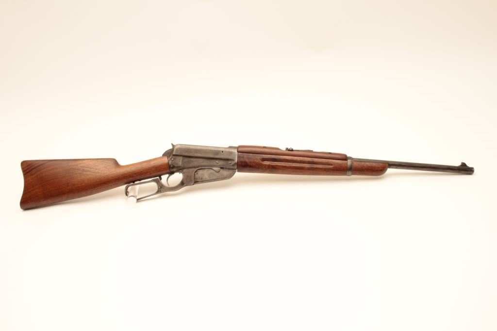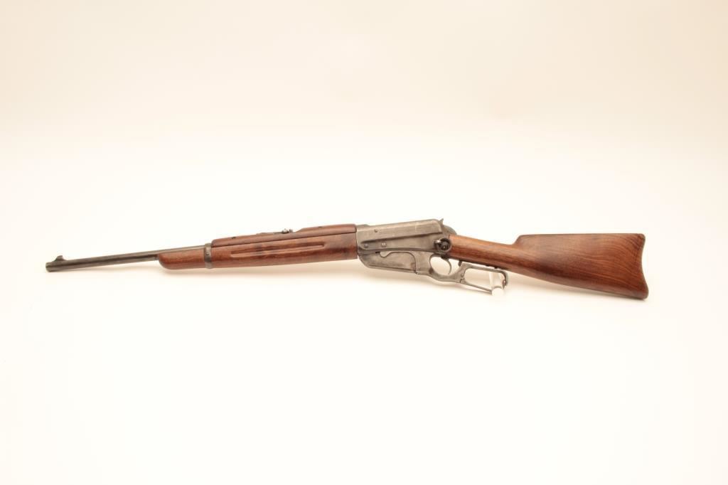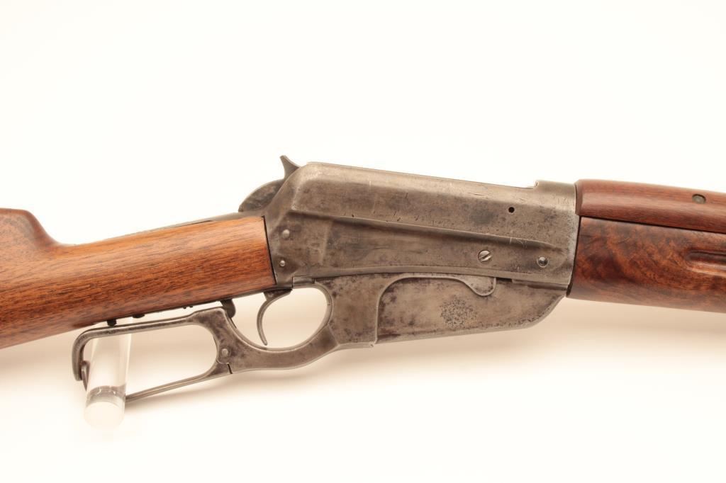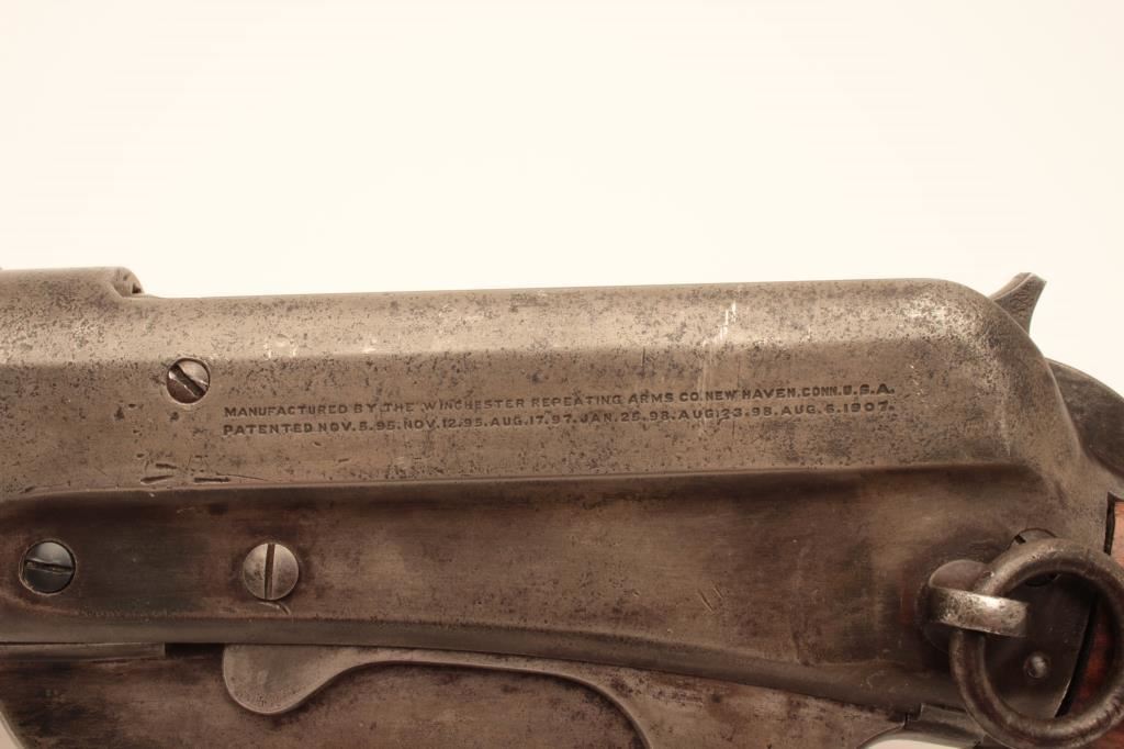 Winchester Model 1895 lever action saddle ring carbine, .30 Army caliber, Serial #89856. The carbine is in good overall condition with a 22” barrel with a ramped blade front and military style tangent rear sights. The barrel retains a significant amount of muted blue finish with the remainder going to a grey patina. The receiver shows traces of blue finish in the protected areas with the majority going to grey patina with some light surface erosion and pinprick pitting evident. The hammer has been bobbed during the period of use and the saddle ring is retained. The smooth wood stocks are in very good condition with small mars and compressions. The butt stock ends with a smooth steel butt plate with trap. The bore is only fair, the action crisp and markings are sharp. Est.: $500-$1,000. (C+R).