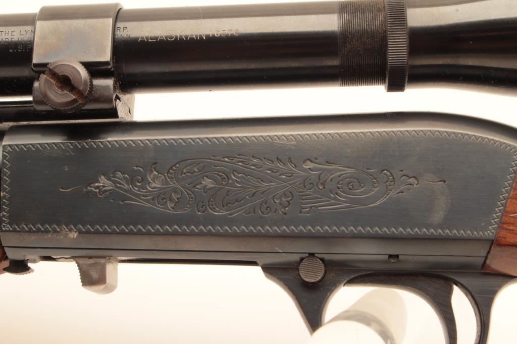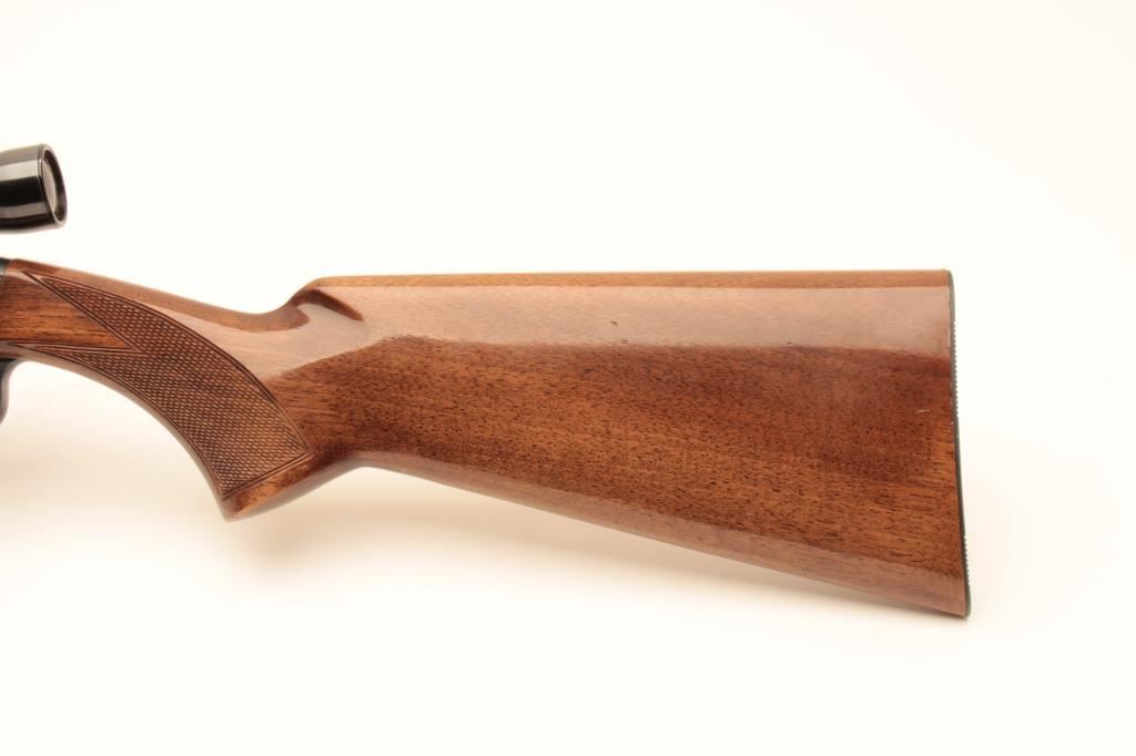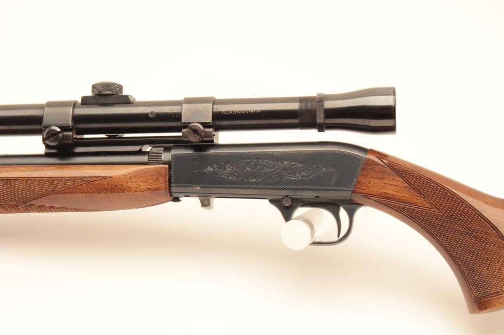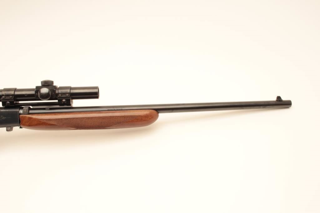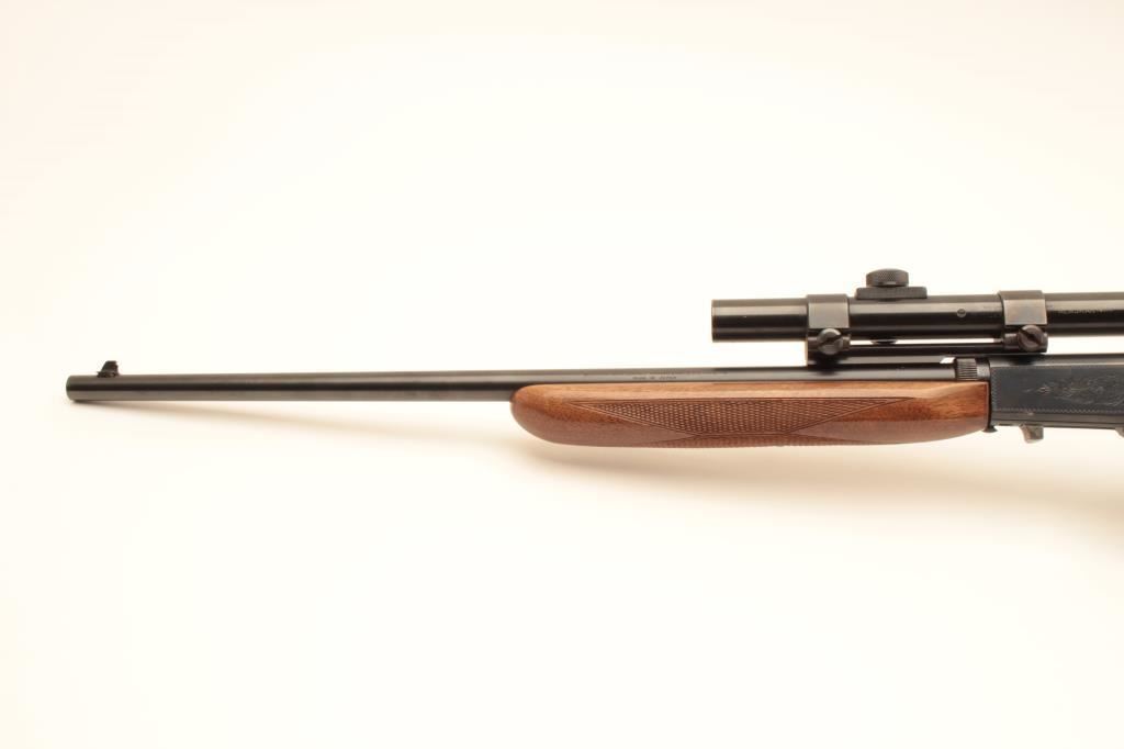 Browning SA-22 Grade 1 semi-automatic rifle, .22 Long Rifle caliber, Serial #11457RP146. The rifle is in very good overall condition with a 19” barrel. The metal surfaces retain the majority of their blue finish with light wear at the muzzle and some high point edge wear. The receiver is lightly engraved as is the trigger guard, while the barrel is marked, “MADE IN JAPAN”. The checkered wood stocks are in very good condition with small mars and compressions consistent with field use. The butt stock ends with a checkered steel butt plate. The rifle is topped with Weaver rings and a Lyman Alaskan fixed 4x rifle scope. The bore is good, the action crisp and markings are sharp. Est.: $250-$500. (Modern).