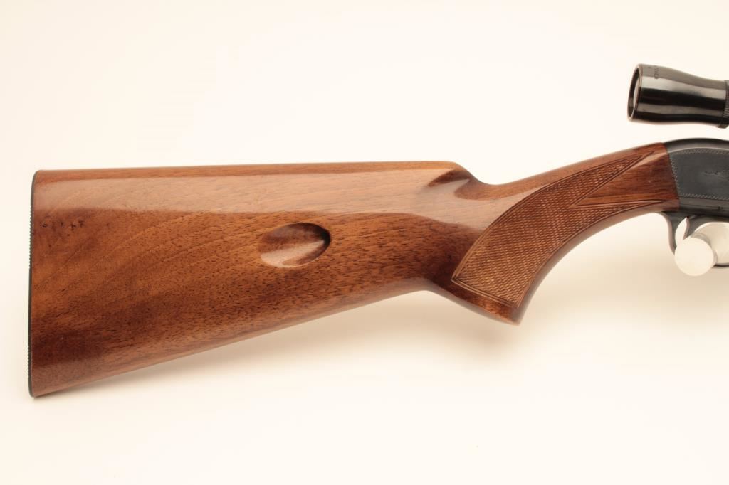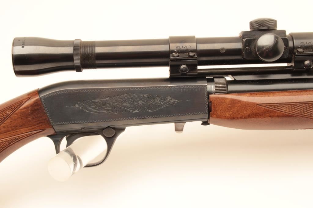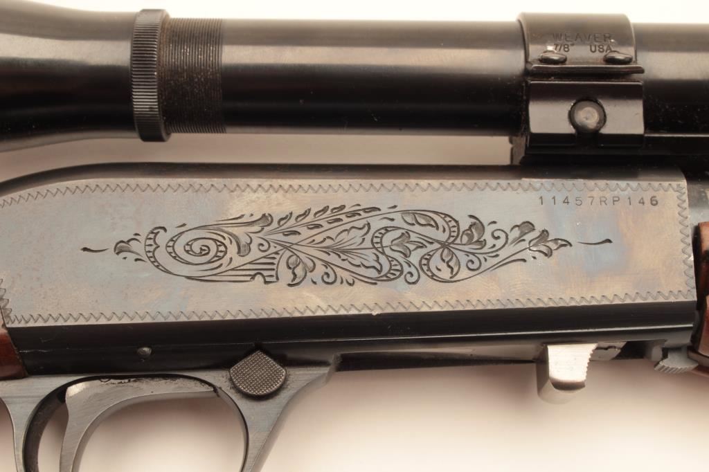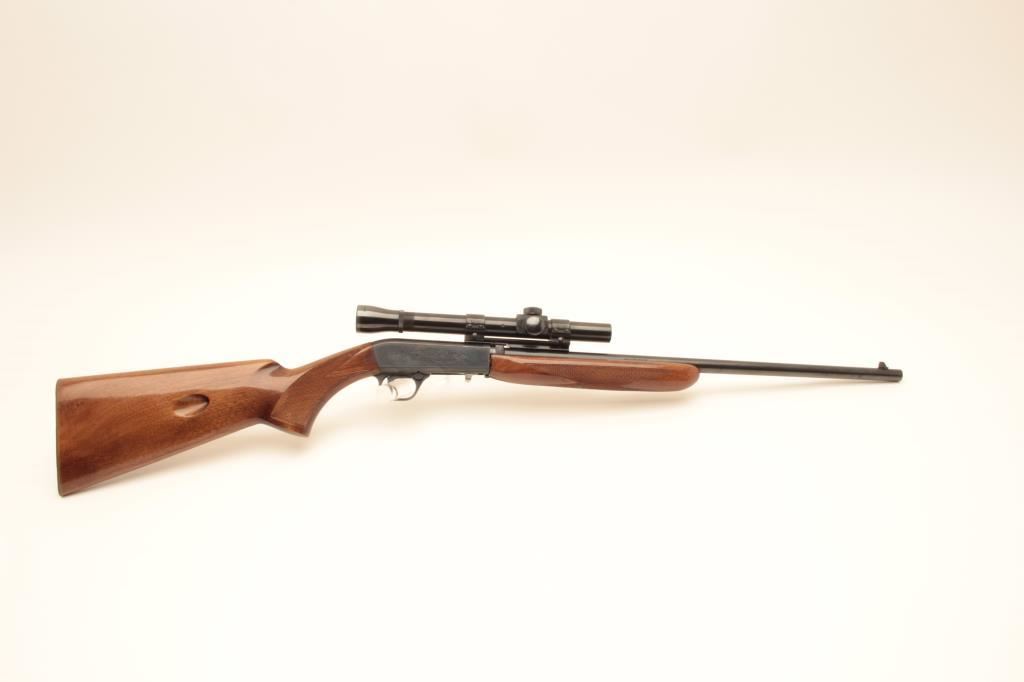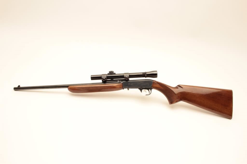 Browning SA-22 Grade 1 semi-automatic rifle, .22 Long Rifle caliber, Serial #11457RP146. The rifle is in very good overall condition with a 19” barrel. The metal surfaces retain the majority of their blue finish with light wear at the muzzle and some high point edge wear. The receiver is lightly engraved as is the trigger guard, while the barrel is marked, “MADE IN JAPAN”. The checkered wood stocks are in very good condition with small mars and compressions consistent with field use. The butt stock ends with a checkered steel butt plate. The rifle is topped with Weaver rings and a Lyman Alaskan fixed 4x rifle scope. The bore is good, the action crisp and markings are sharp. Est.: $250-$500. (Modern).