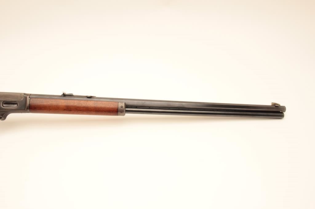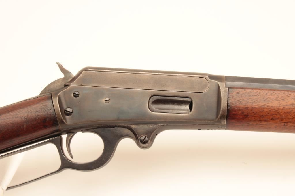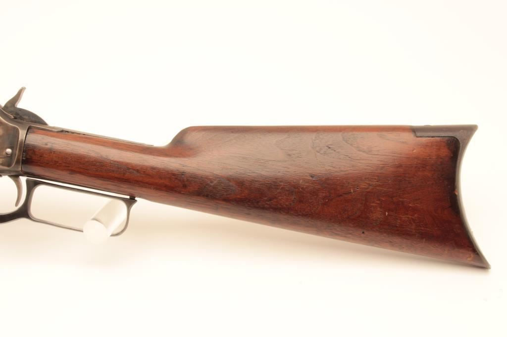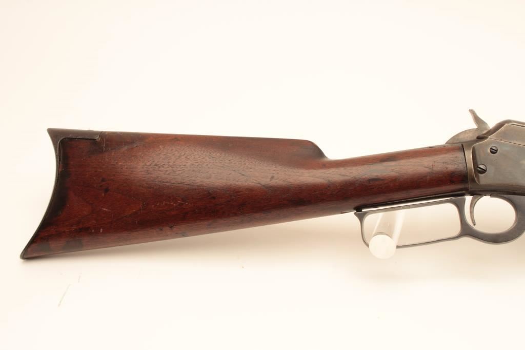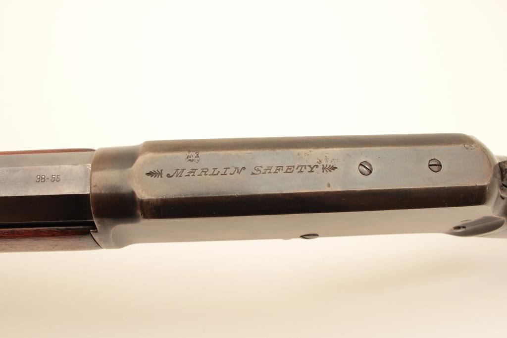 Marlin Model 1893 lever action rifle, .38-55 caliber, Serial #B5464. The rifle is in very good overall condition with a 26” octagon barrel with a silver knife blade front and standard rear sight. The barrel and full-length magazine retain nearly all of their blue finish with the barrel marked, “SPECIAL SMOKELESS STEEL”. The receiver shows toned case hardening on the bolt with the remainder going to grey patina. There is old pinpricking pitting on the tang behind the hammer. The smooth wood stocks are in good condition showing moderate wear and use with mars, compressions and some oil staining. The butt stock ends with a smooth steel crescent butt plate that is slightly proud at the toe, with areas of light pinprick pitting noted. The bore is good, the markings are sharp and the action is crisp. Est.: $600-$1,200. (C+R).