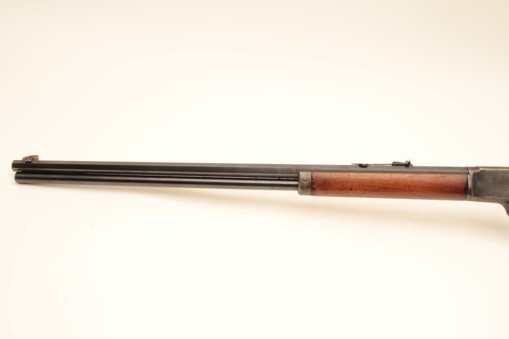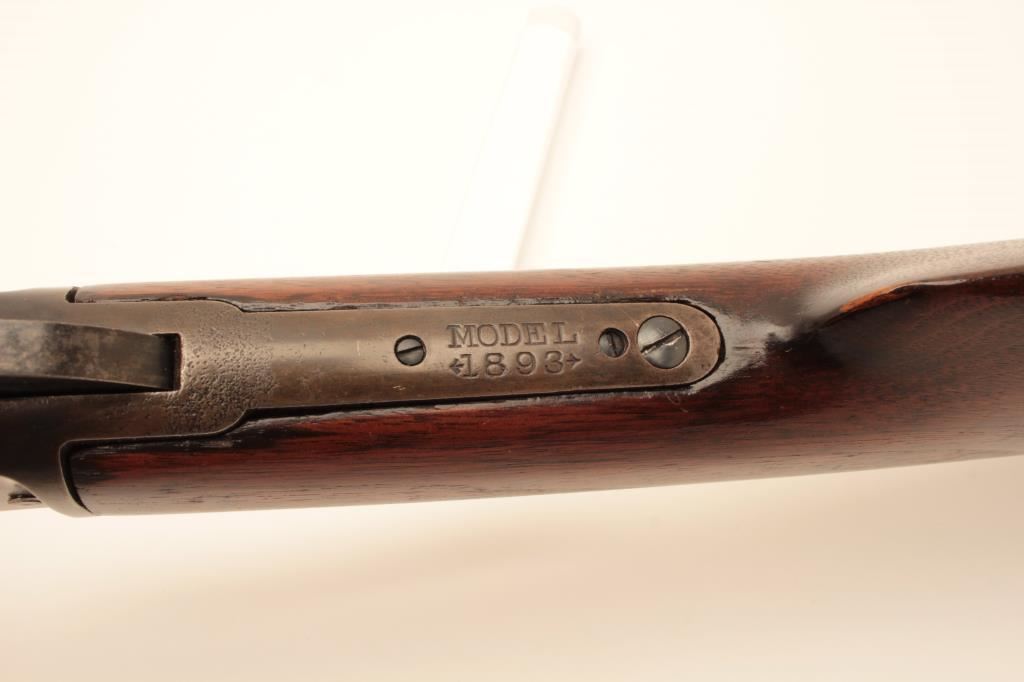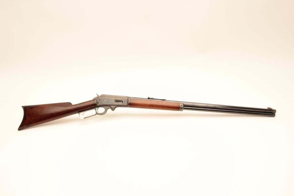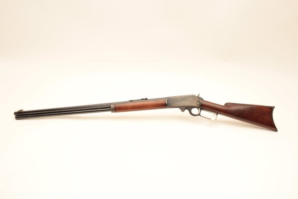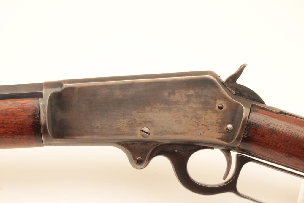 Marlin Model 1893 lever action rifle, .38-55 caliber, Serial #B5464. The rifle is in very good overall condition with a 26” octagon barrel with a silver knife blade front and standard rear sight. The barrel and full-length magazine retain nearly all of their blue finish with the barrel marked, “SPECIAL SMOKELESS STEEL”. The receiver shows toned case hardening on the bolt with the remainder going to grey patina. There is old pinpricking pitting on the tang behind the hammer. The smooth wood stocks are in good condition showing moderate wear and use with mars, compressions and some oil staining. The butt stock ends with a smooth steel crescent butt plate that is slightly proud at the toe, with areas of light pinprick pitting noted. The bore is good, the markings are sharp and the action is crisp. Est.: $600-$1,200. (C+R).