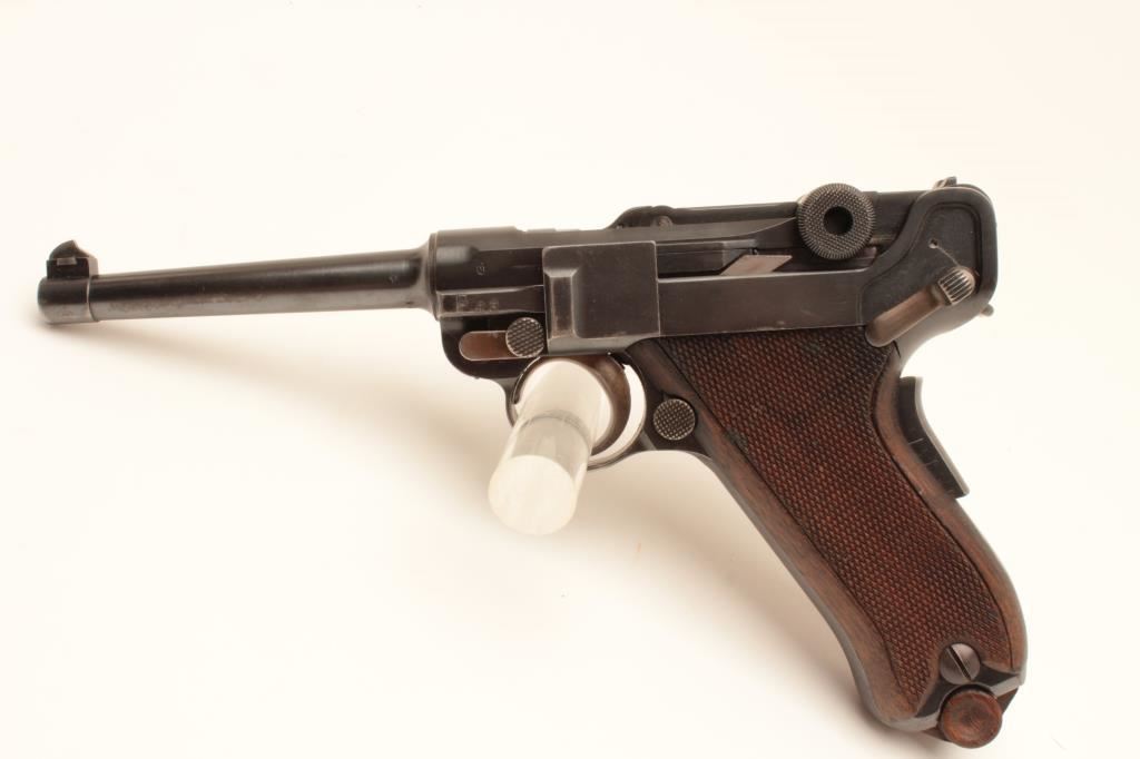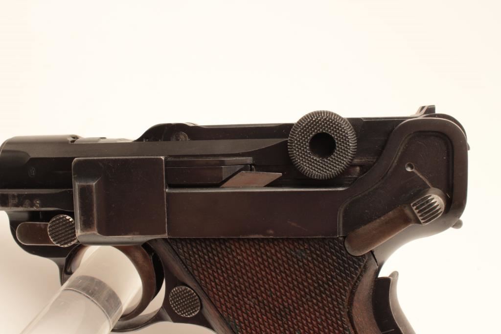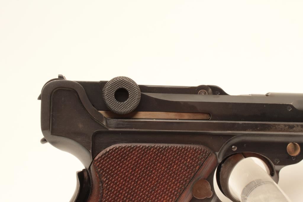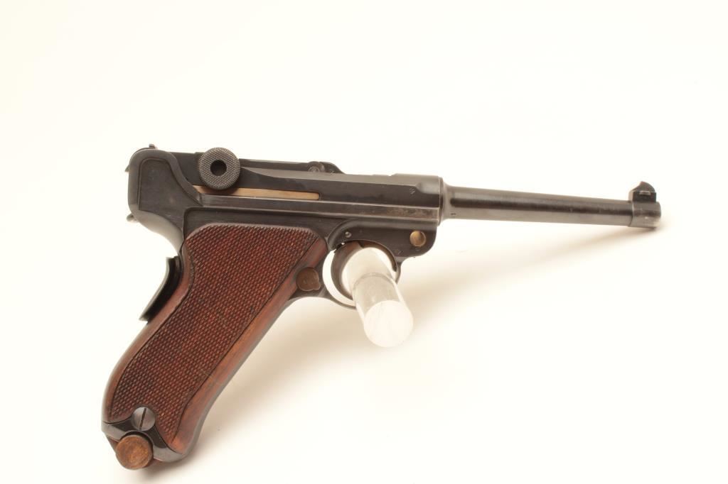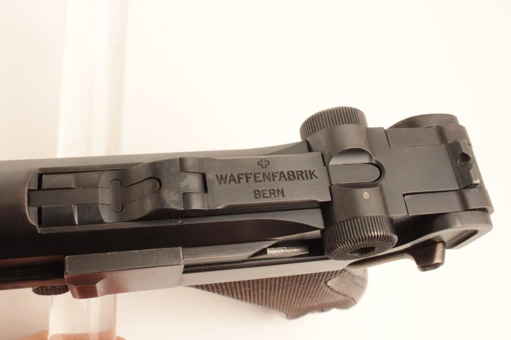 Swiss Bern 1906 Pattern Luger semi-automatic pistol, .30 Luger caliber, Serial #16174. The pistol is in fine overall condition with a 4 ¾” barrel. The pistol retains approximately 90% of its blue finish with wear at the muzzle and high point edge wear. The top of the toggle is marked, “WAFFENFABRIK BERN” with the Swiss cross. The pistol has additional Swiss proofs and is marked, “P43” just above the takedown lever. The takedown lever, trigger and safety all show muted straw finish. The checkered wood grips are in good condition showing small mars and some flattening of checkering. The pistol includes one correct unmarked nickel plated magazine with wood base. The bore is good, the action crisp and markings are sharp on this lightly used Luger. According to the consigner the model is uncommon with less than 18,000 manufactured. Est.: $1,250-$2,500. (C+R).