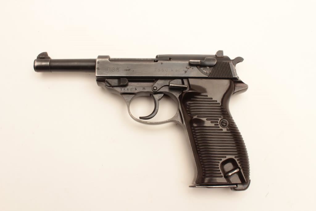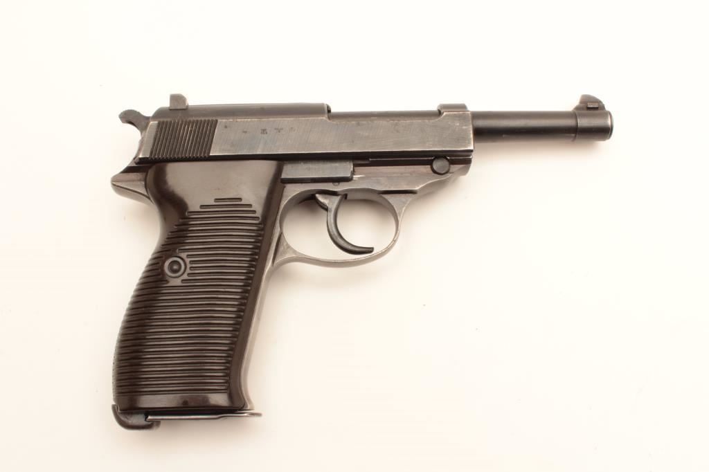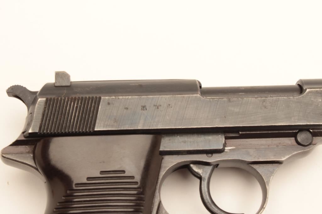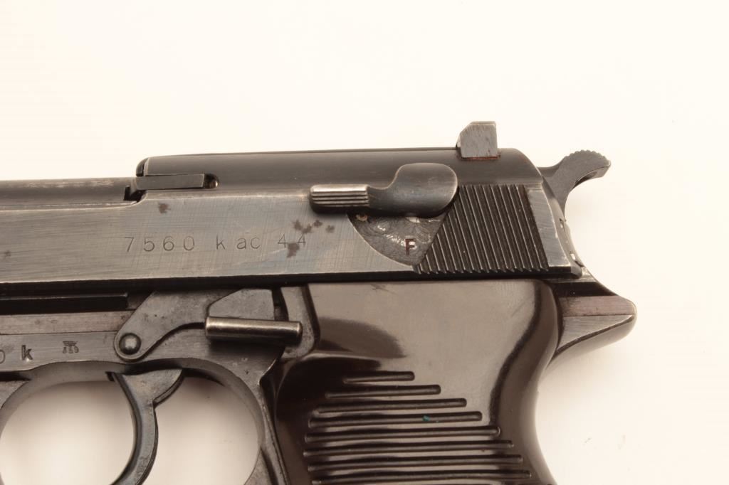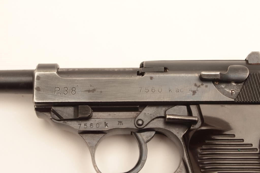 Walther P-38 semi-automatic pistol (ac 44 marked), 9mm caliber, 4.75” barrel, blued finish, brown plastic grips, S/N 7560 k; overall very good condition with 75-85% of military finish remaining, very good bore, crisp action, good markings and very good grips; accompanied by brown leather holster, nazi marked and dated 1942/JOA with one extra magazine. (C&R/PPT). Est.: $400-$800.