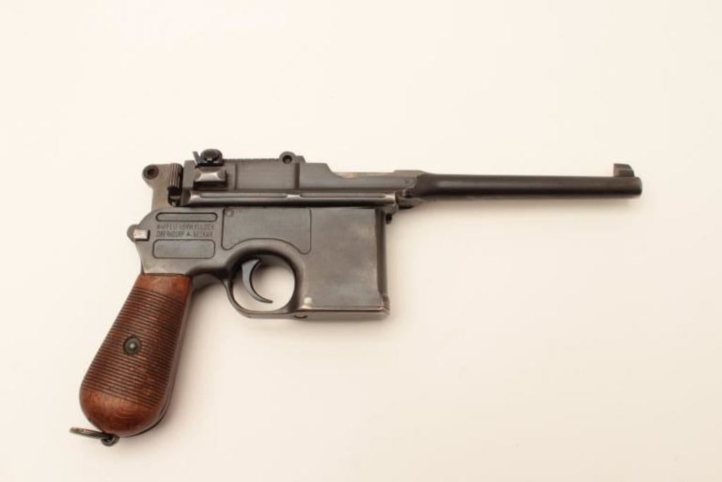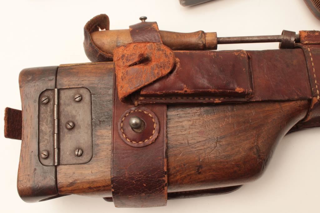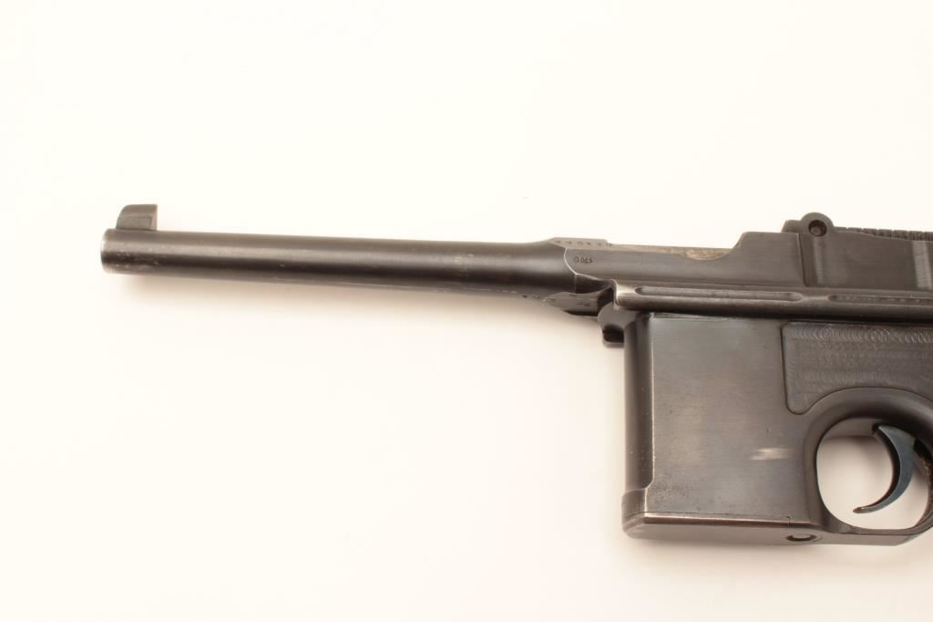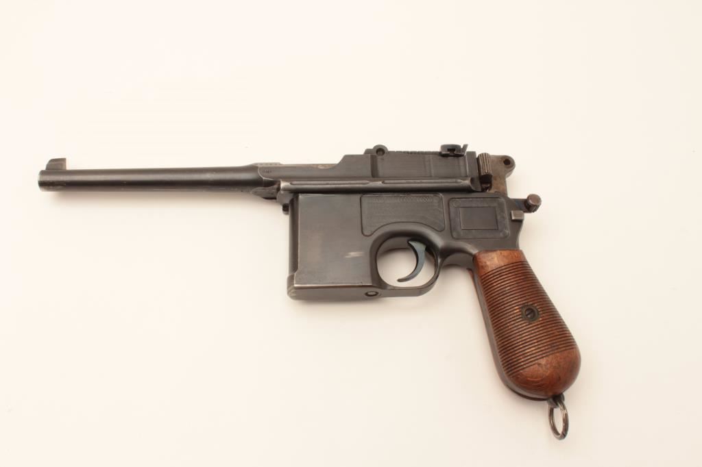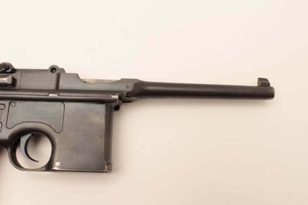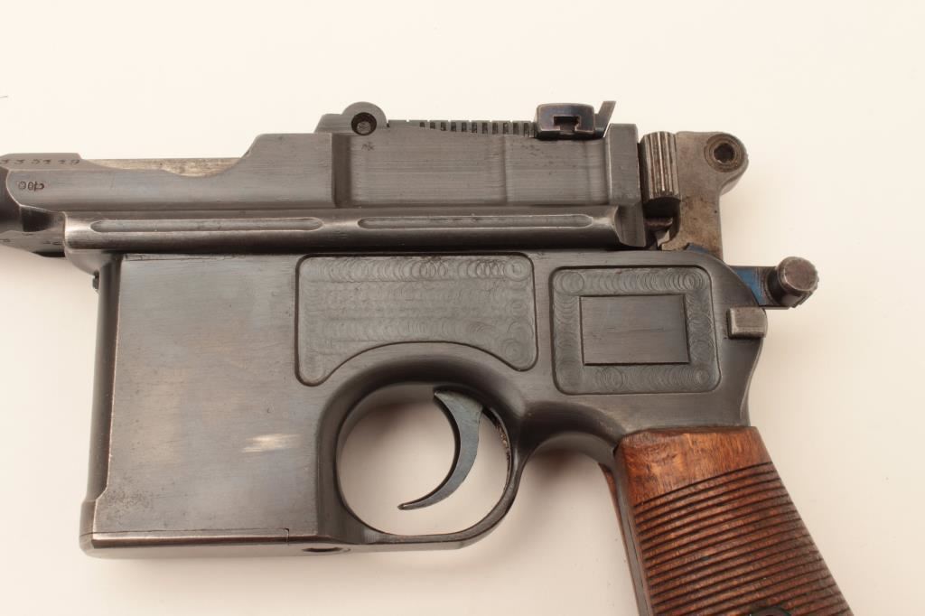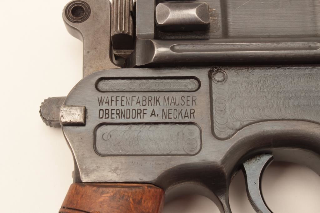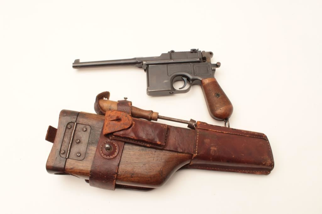 1896 Mauser Broomhandle semi-automatic pistol, .30 caliber, 5.5” barrel, blued finish, wood grips, S/N 335119; very good + to almost fine with 85-95% finish remaining, very good + bore, crisp action, sharp markings and very good + grips; accompanied by a wood shoulder stock/holster with matching S/N and a leather carrier marked and dated 1916 with original cleaning rod; collectors’ grade! (C&R/PPT). Est.: $1,500-$3,000.