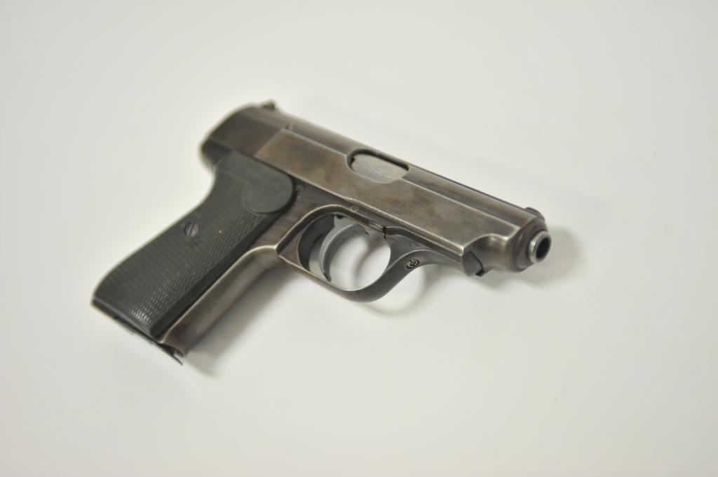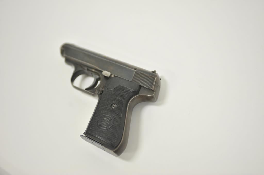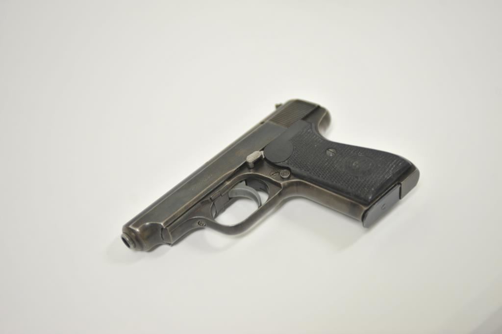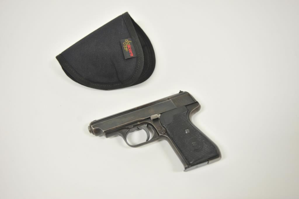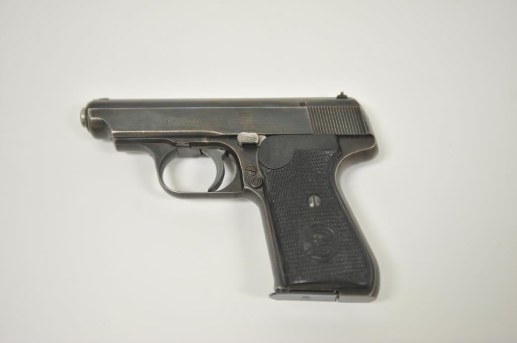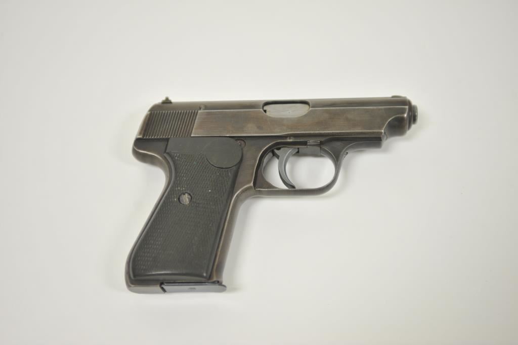 J.P. Sauer semi-automatic pistol, late war, no proofs, 7.65mm caliber, 3.5” barrel, blued finish, checkered plastic grips, S/N 510036; considerable blued finish remaining, good bore, good markings and grips; action needs work; accompanied by a woven fabric safe boot. (C&R/PPT). Est.: $200-$400.