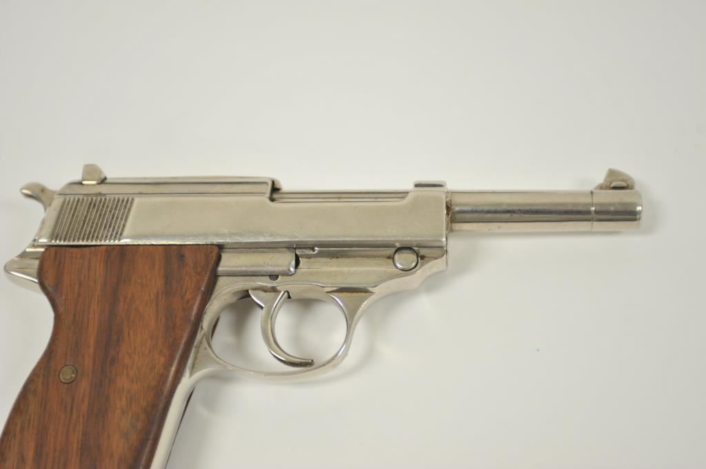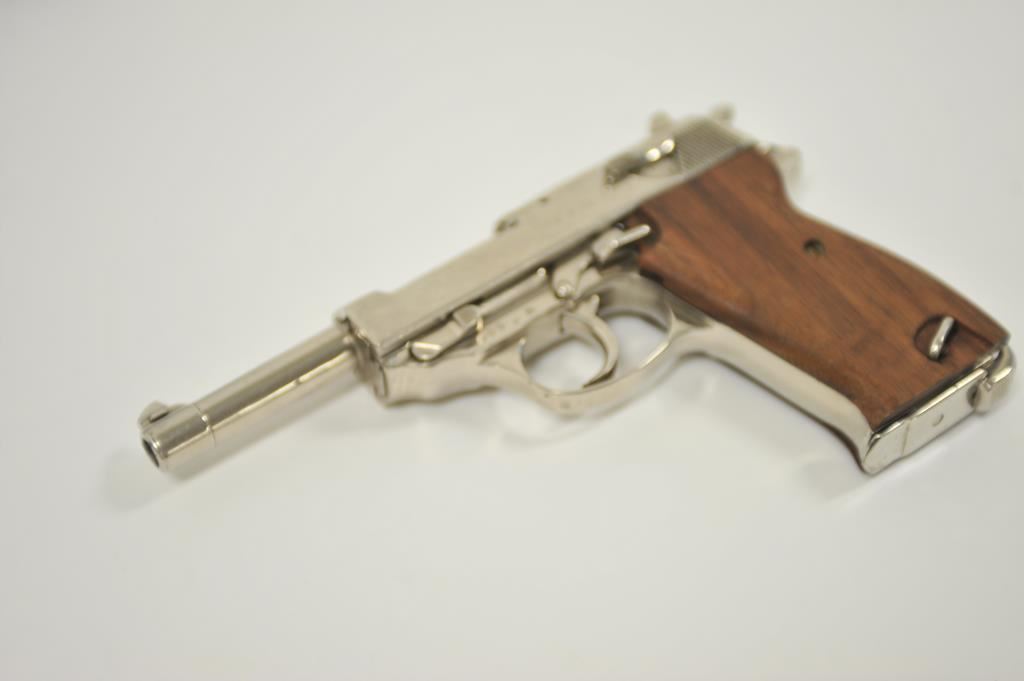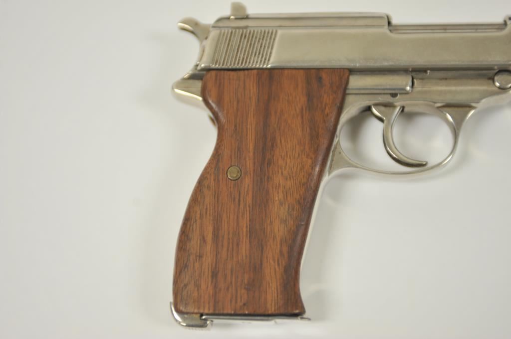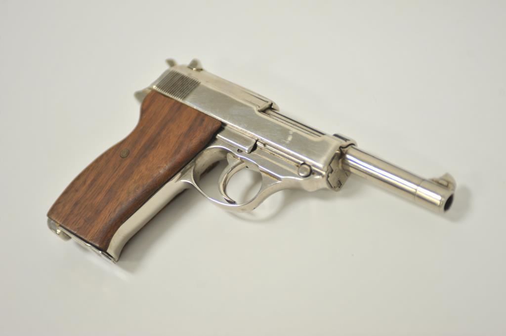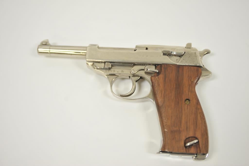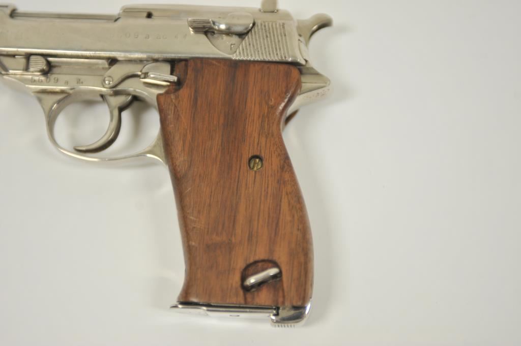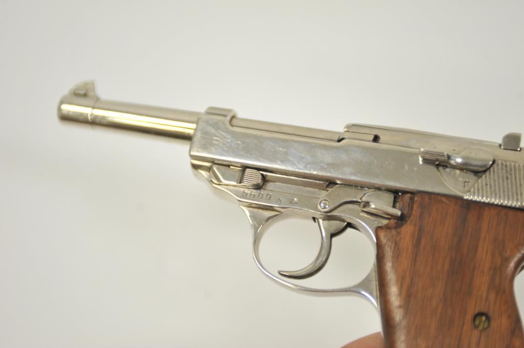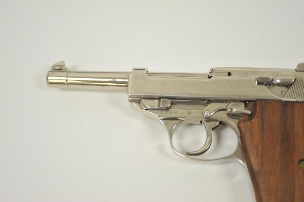 P-38 semi-automatic pistol by Walther, 1944 dated, 9mm caliber, 5” barrel, replaced wood grips, S/N 5609a; overall good condition as re-finished; good bore, good action, good replacement grips; accompanied by a reproduction black military style flap holster with one extra magazine. (C&R/PPT). Est.: $300-$600.