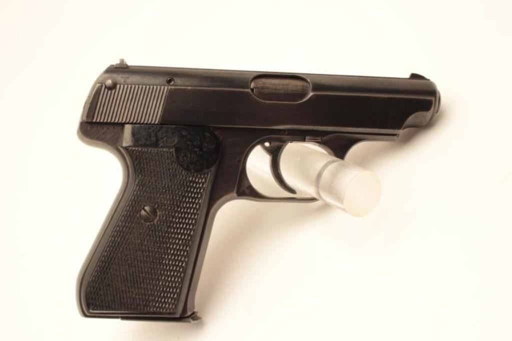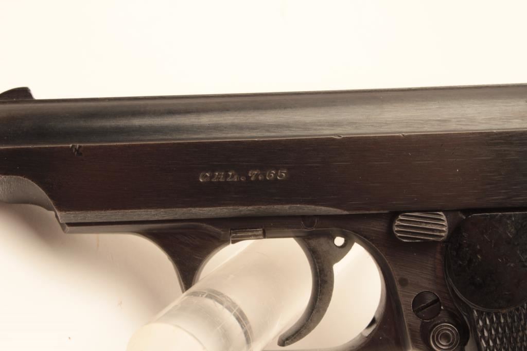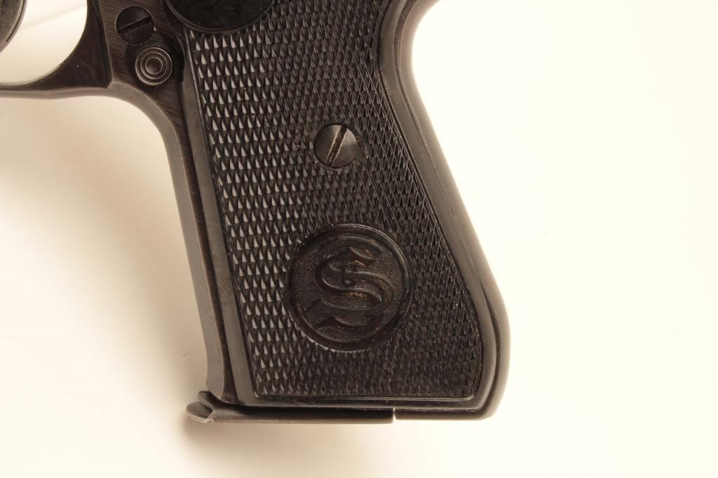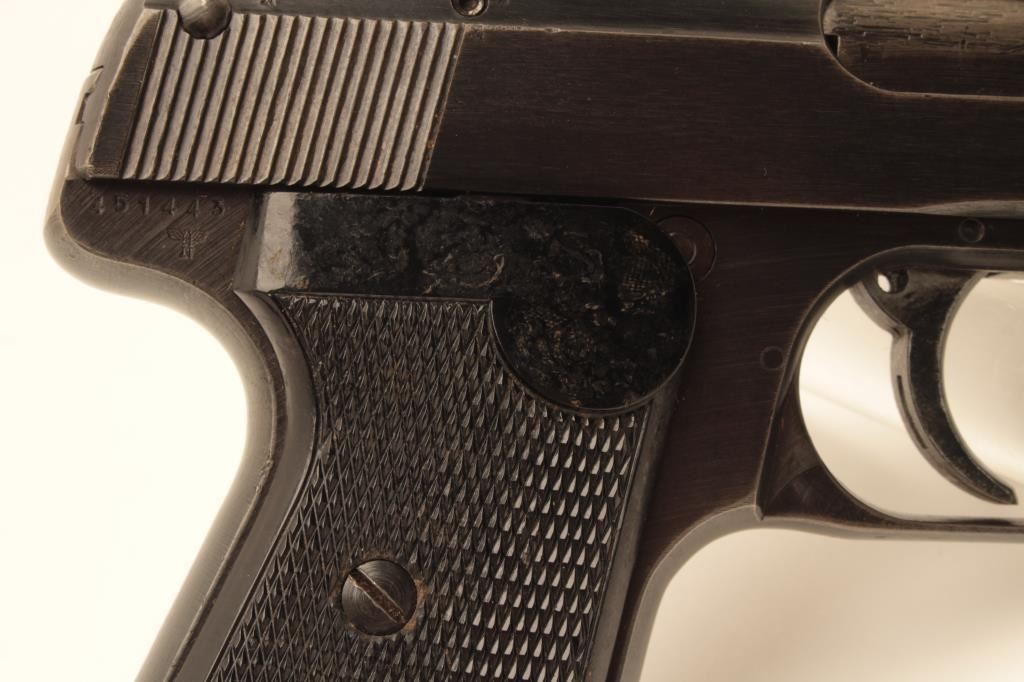J.P. Sauer semi-automatic pistol, 7.65mm caliber, 3.5” barrel, blued finish, nazi era eagle N proof, checkered plastic grips, S/N 451443; overall very good + condition with majority of blued finish remaining, very good bore, crisp action, sharp markings and very good grips; accompanied by a woven fabric safe boot. (C&R/PPT). Est.: $300-$600.