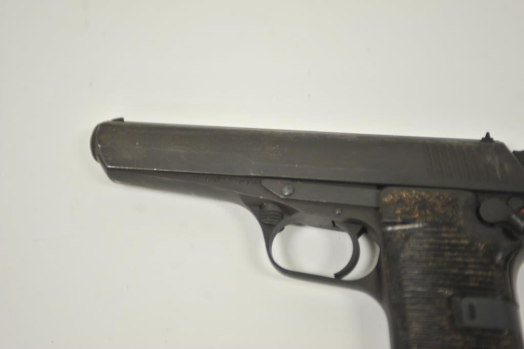 CZ Model 52 semi-automatic pistol, import-marked, 7.62mm caliber, 4.5” barrel, military finish, brown plastic grips, S/N G13089; overall good condition with good bore, action, and grips; with brown leather holster, cleaning rod and one extra magazine. (Modern/PPT). Est.: $250-$500.