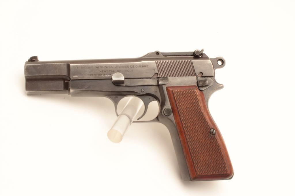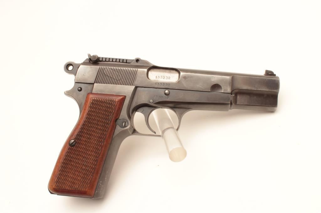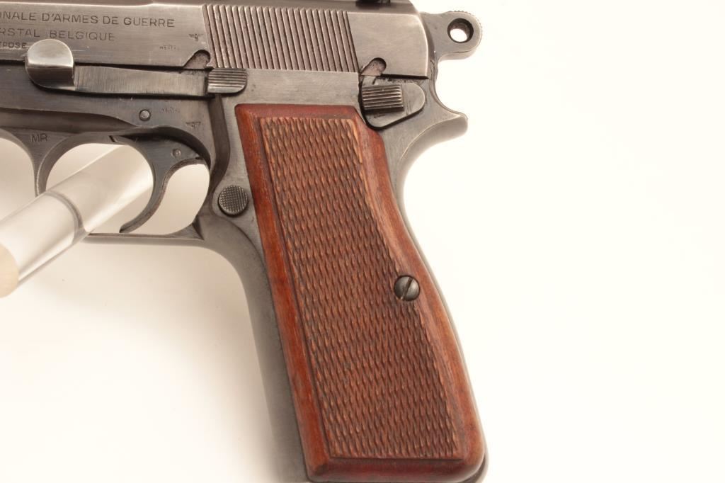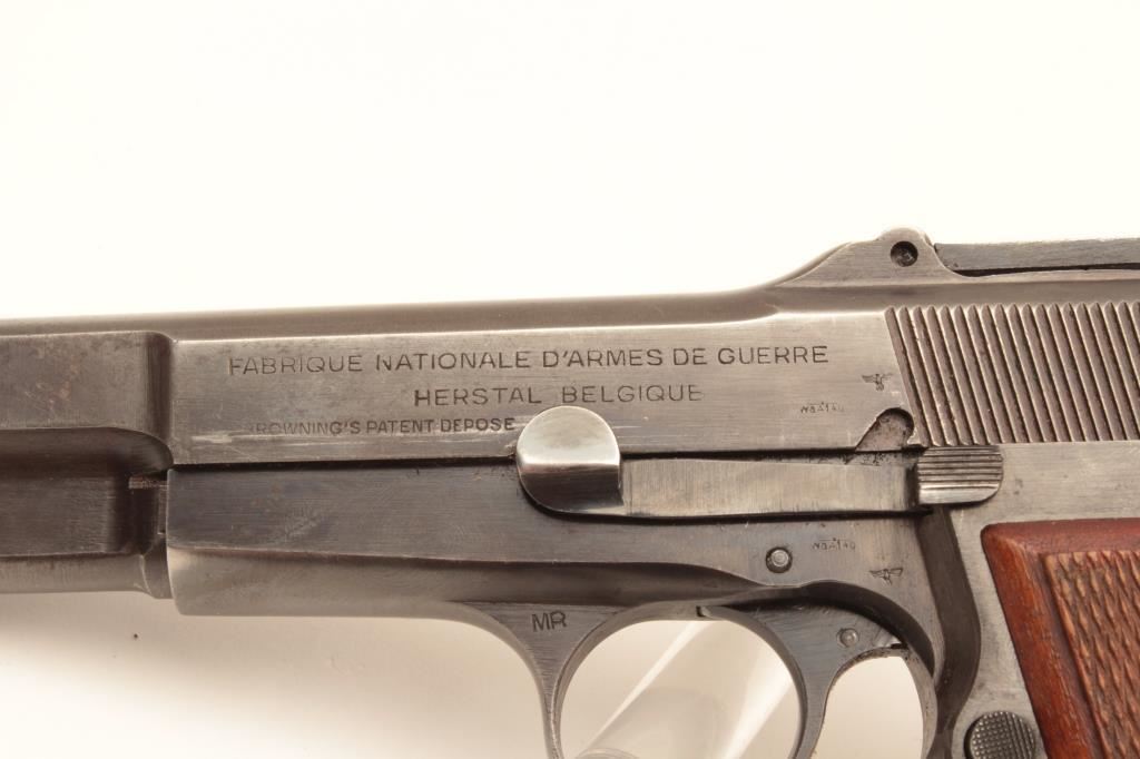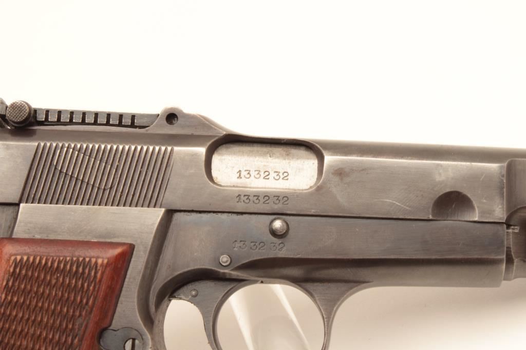 Belgian FN Hi Power semi-automatic pistol, 9mm caliber, 4.5” barrel, tangent sights, nazi proofs, blued finish, checkered wood grips, S/N 133232; overall very good to near fine condition with a crisp action, good bore and markings, very good grips; accompanied by a brown flap leather holster that is nazi proofed and dated 1942; two original high capacity magazines; 85%-95% collectors’ quality. (C&R/PPT/2 HI CAP. MAGS/NO CALIF. SALE). Est.: $1,000-$2,000.