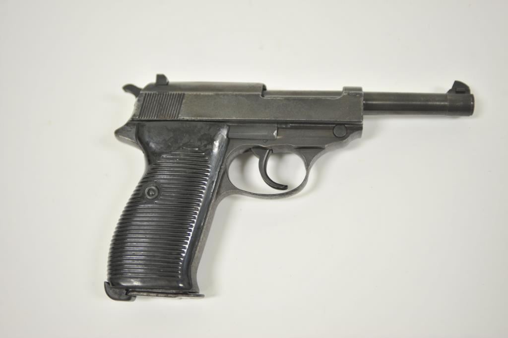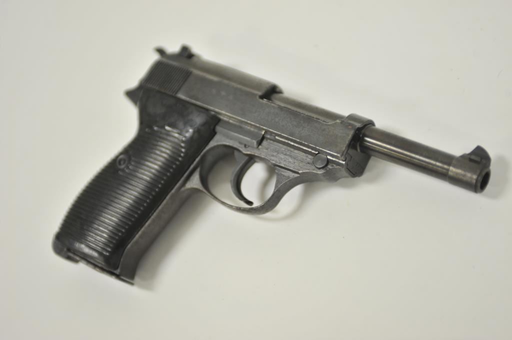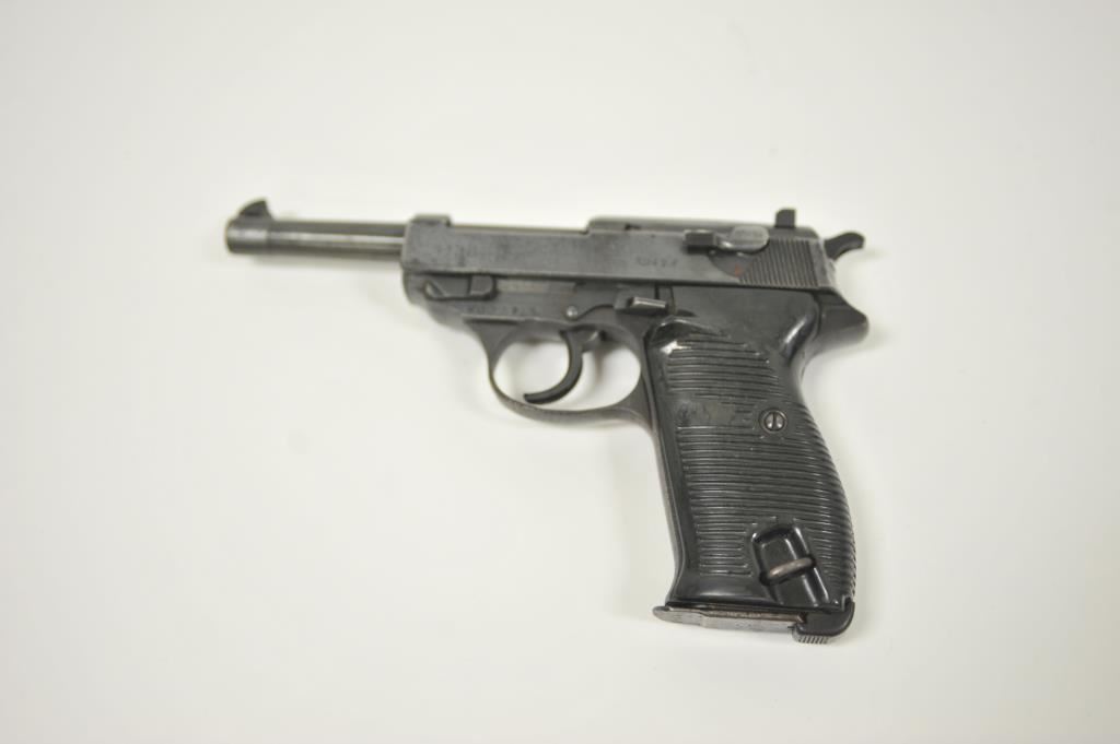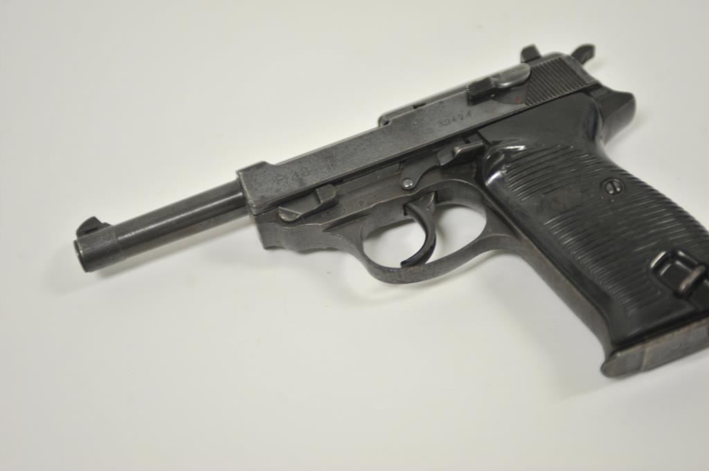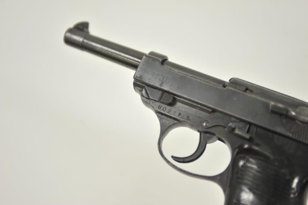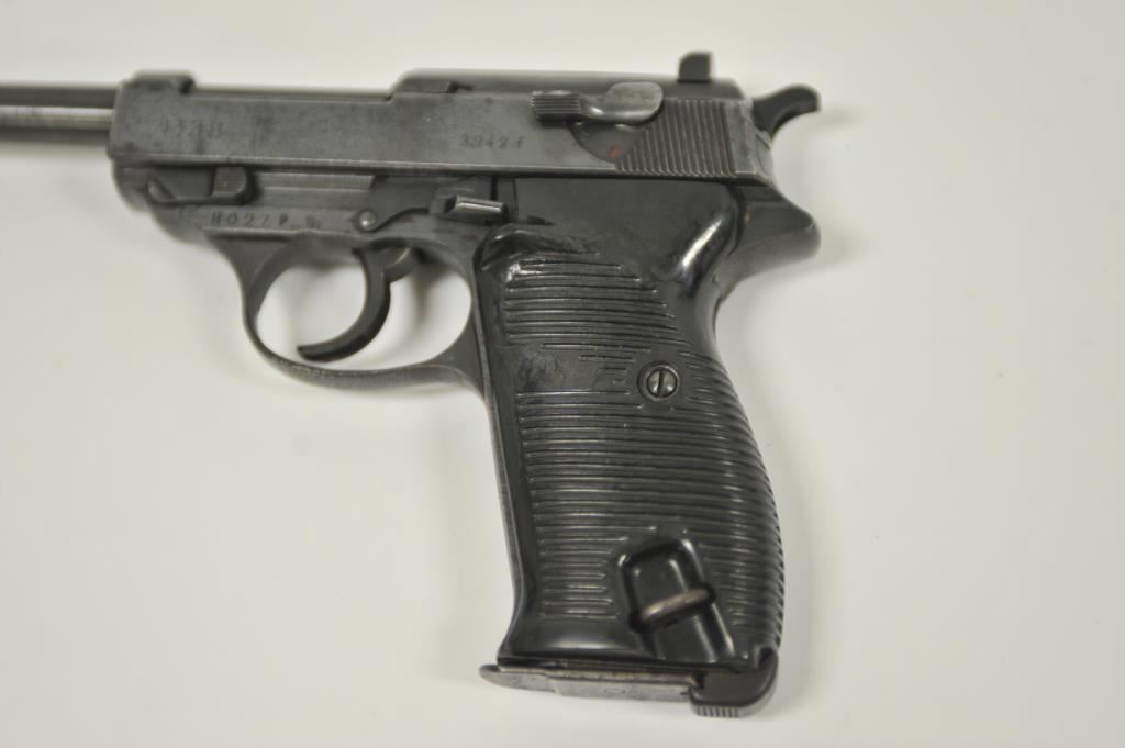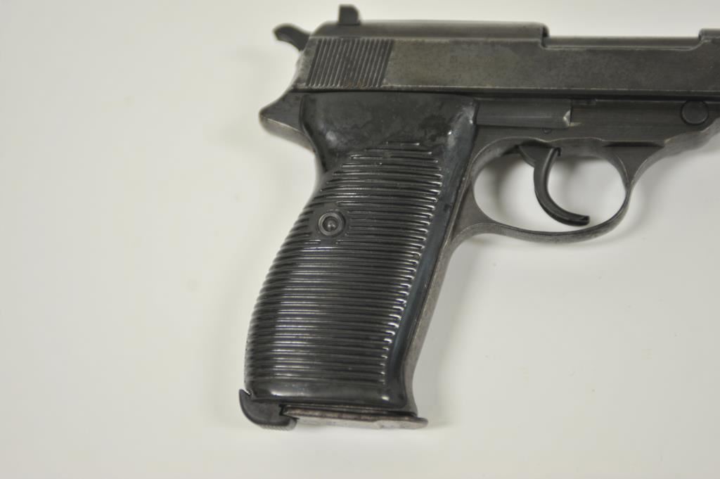 German P-38 semi-automatic pistol, ac 41 marked, 9mm caliber, 5” barrel, blued finish, black plastic grips, S/N 8027P (non-matching slide (3942f) and magazine (524f)); overall good condition with approximately 50-70% finish remaining, good bore, action, markings and grips. (C&R/PPT). Est.: $600-$1,200.