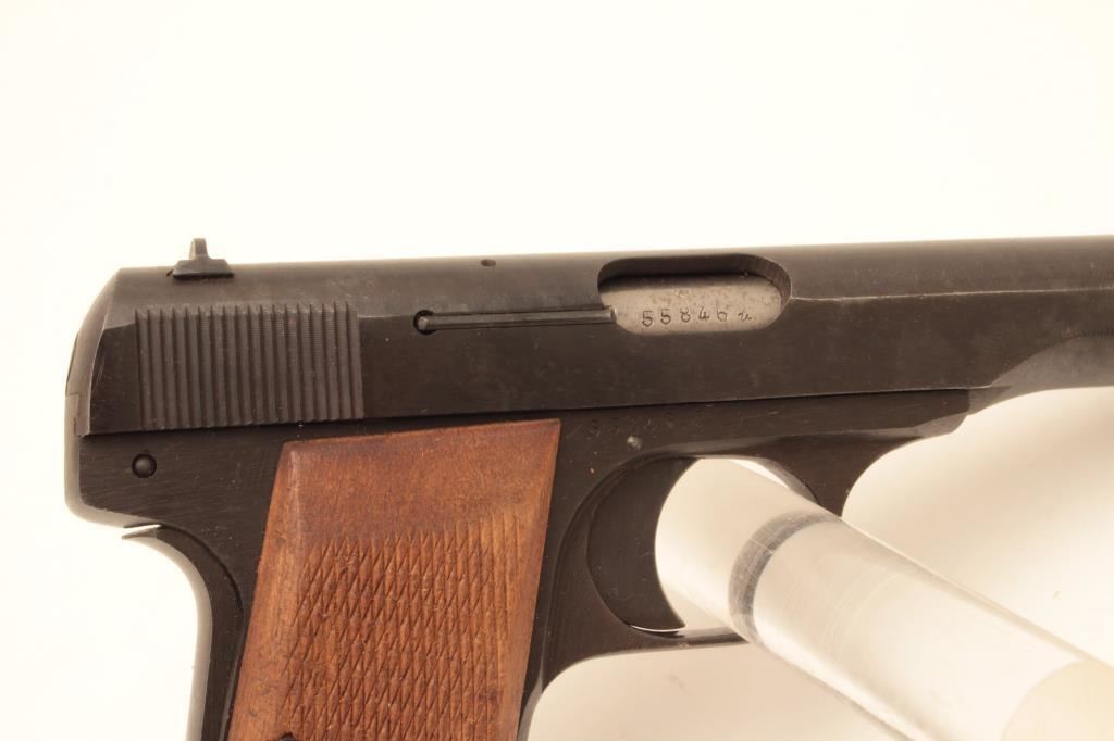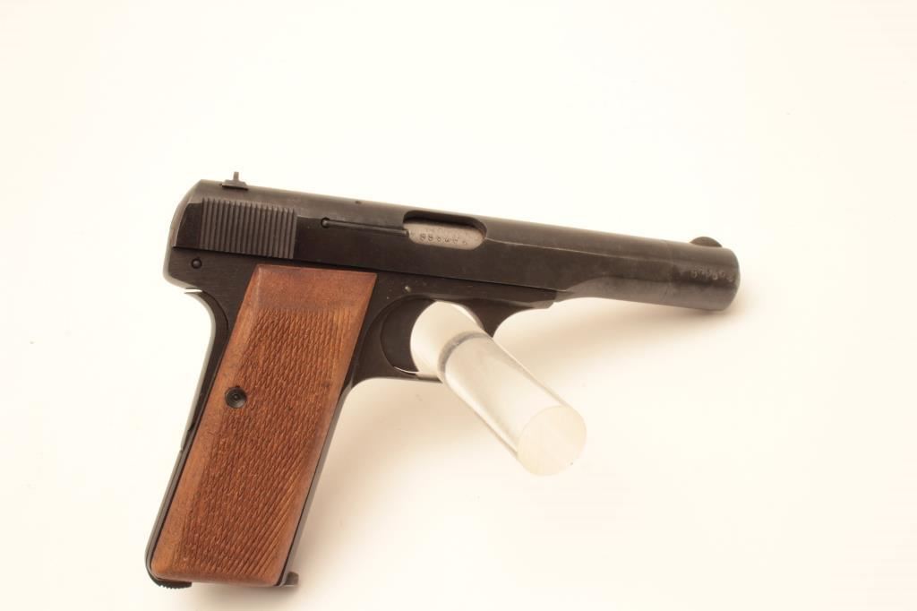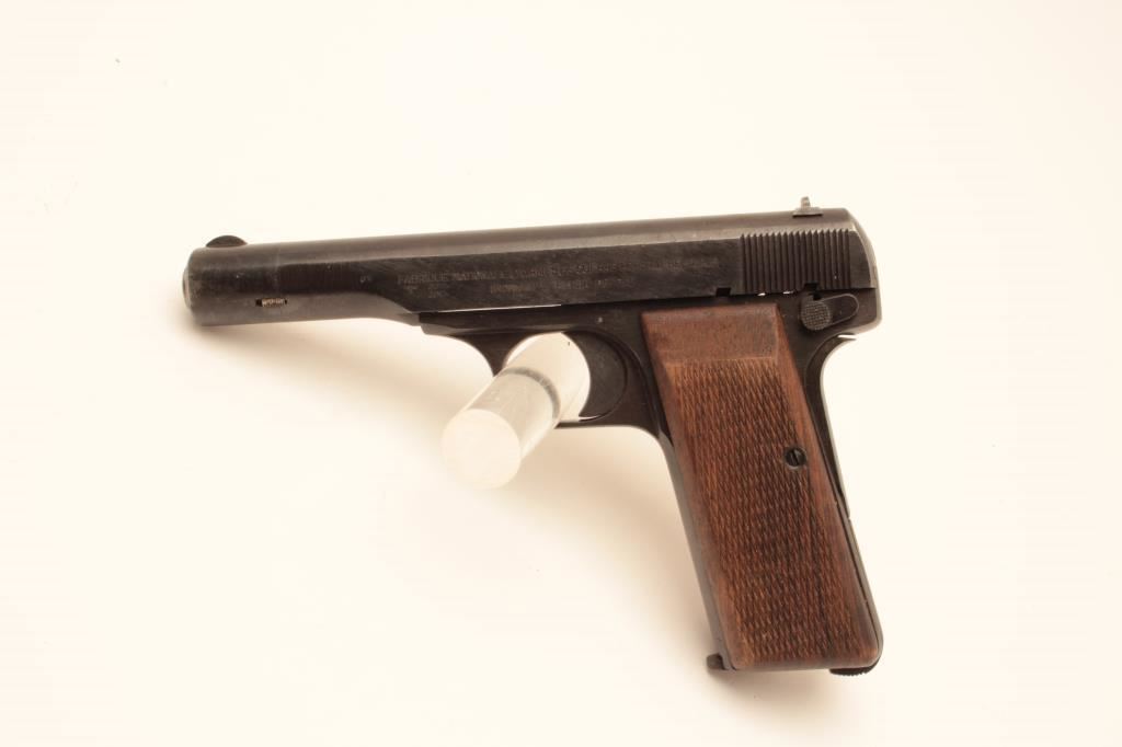 FN Browning 1922 semi-automatic pistol, .32 caliber, nazi proofed, 4.5” barrel, blued finish, checkered wood grips, S/N 55846; overall very good + condition with a crisp action, sharp markings, near fine bore, very good grips; accompanied by a tan leather flap holster and one extra magazine. (C&R/PPT). Est.: $250-$500.