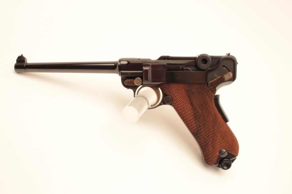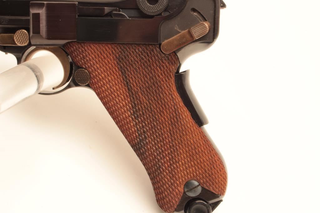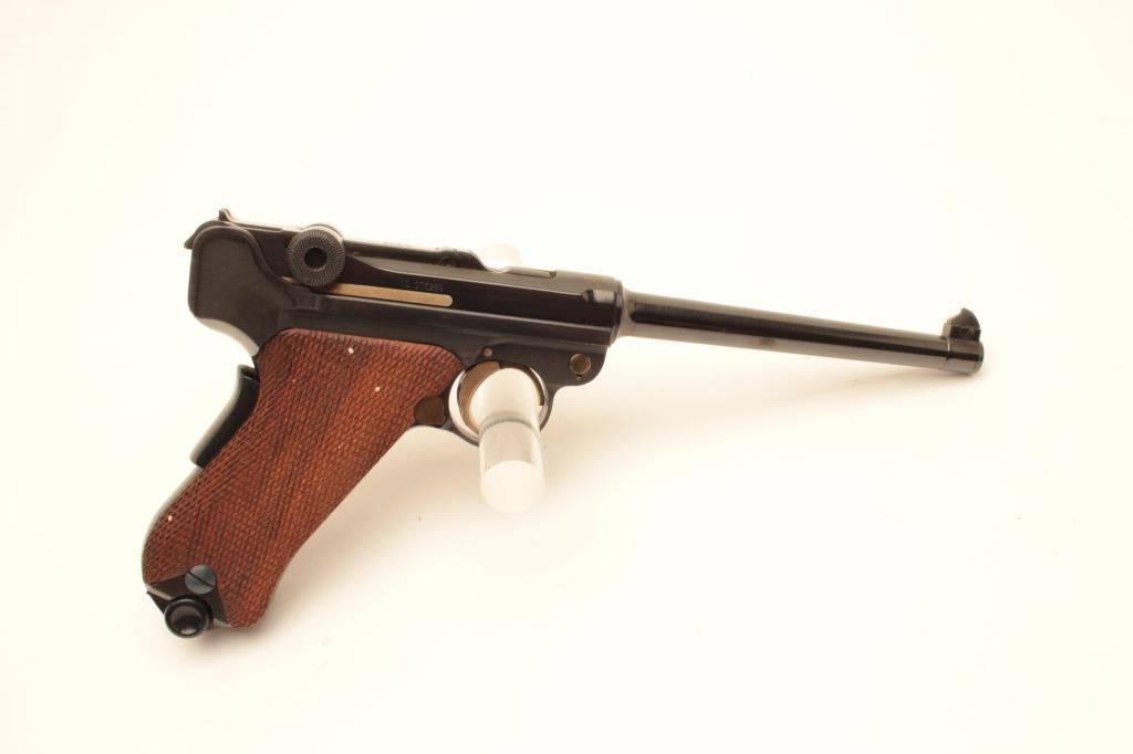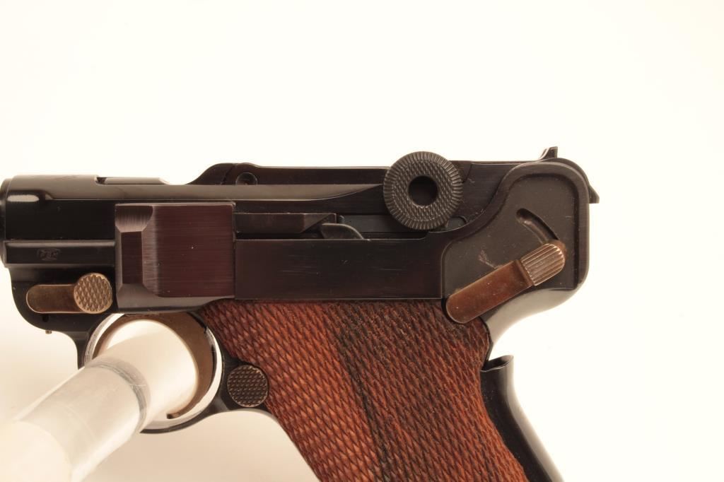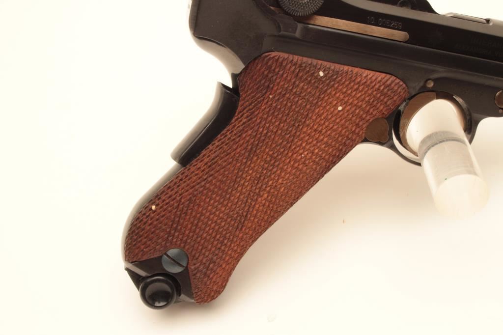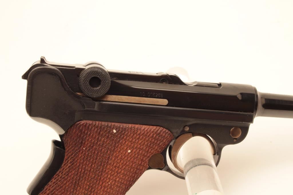 Mauser American Eagle Luger semi-automatic pistol, Interarms marked, .30 Luger caliber, 6” barrel, blued finish, checkered wood grips, S/N 10.005259; overall near new condition with factory cardboard box, instructions, one extra magazine and tools. (Modern/PPT). Est.: $800-$1,600.