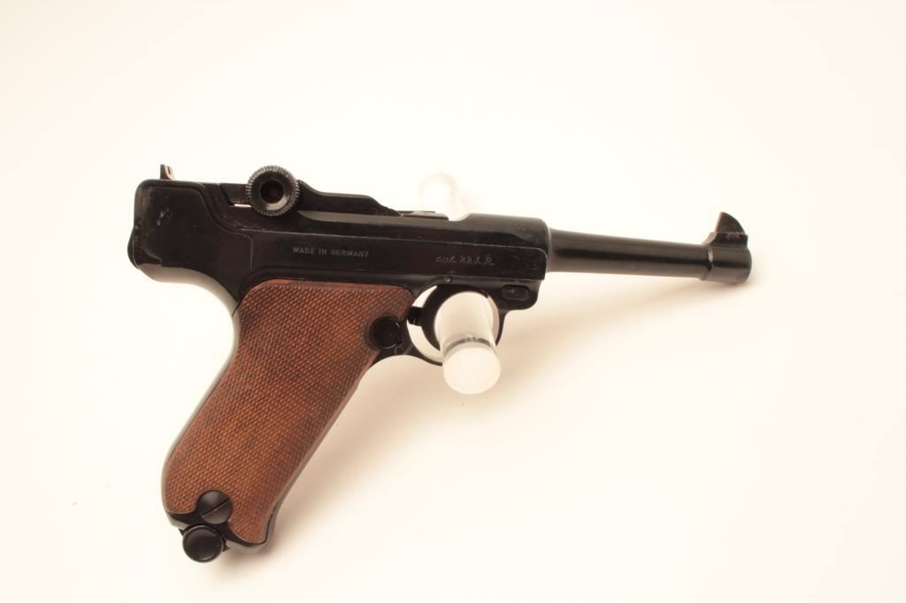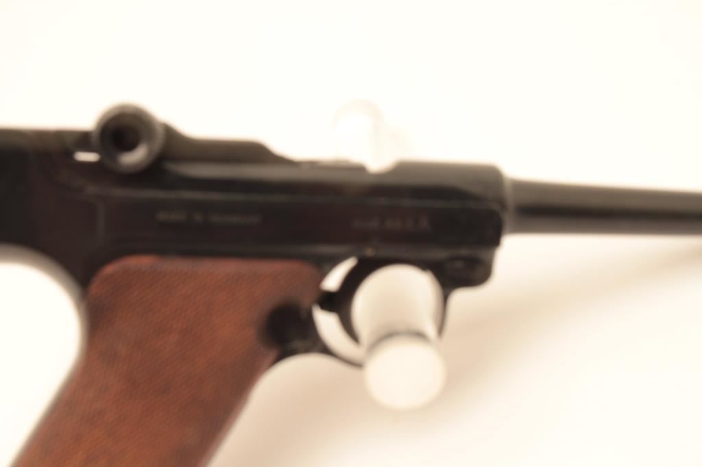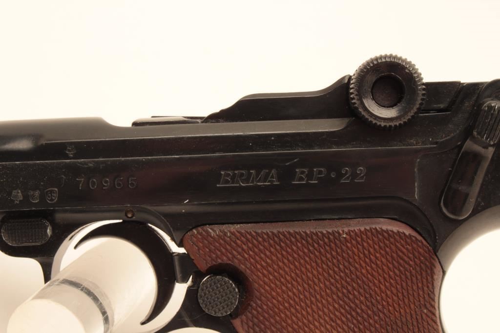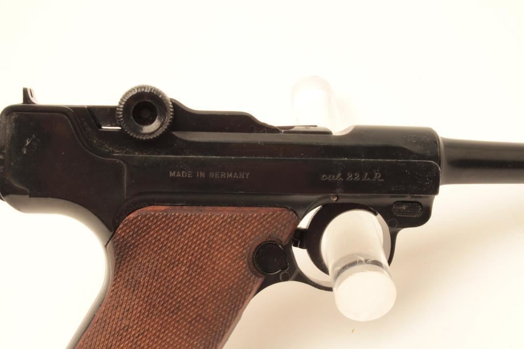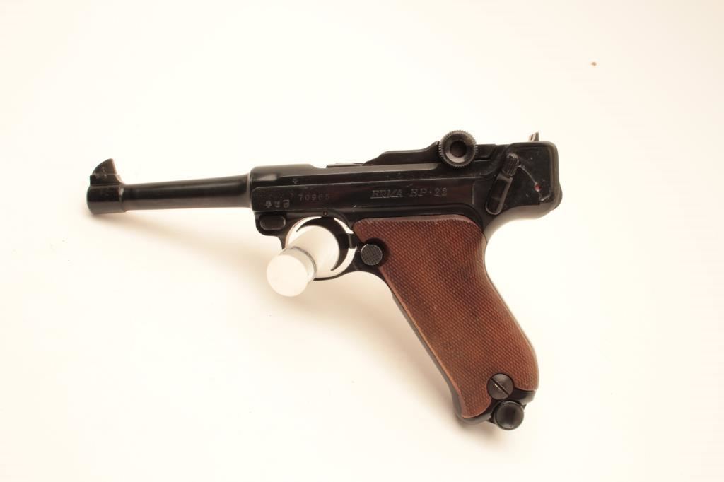Erma Model EP 22 semi-automatic Luger style pistol, .22LR caliber, 4.5” barrel, blued finish, checkered wood grips, S/N 70965; overall good to very good condition with very good bore, good action, good markings and very good grips. (C&R/PPT). Est.: $200-$400.