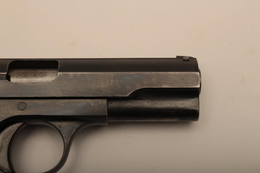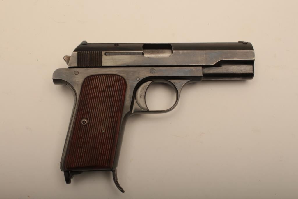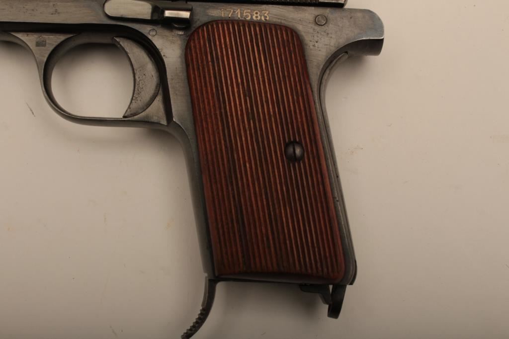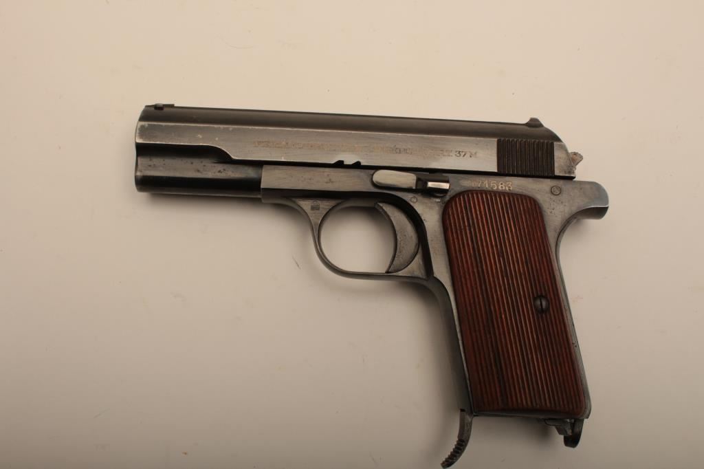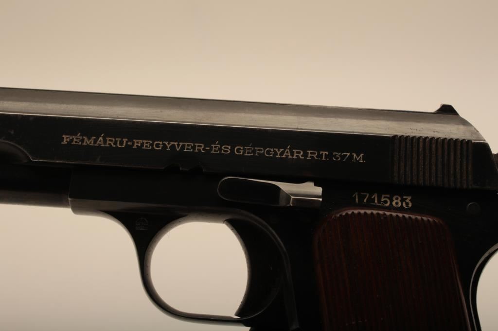 Hungarian Femaru Type 37 semi-automatic pistol, 9mm caliber, 3.75” barrel, blued finish, no nazi proofs, brown grips, S/N 171583; overall very good condition with majority of finish remaining, some holster and high point wear; very good bore, crisp action and markings, very good grips. (C&R/PPT). Est.: $250-$500.