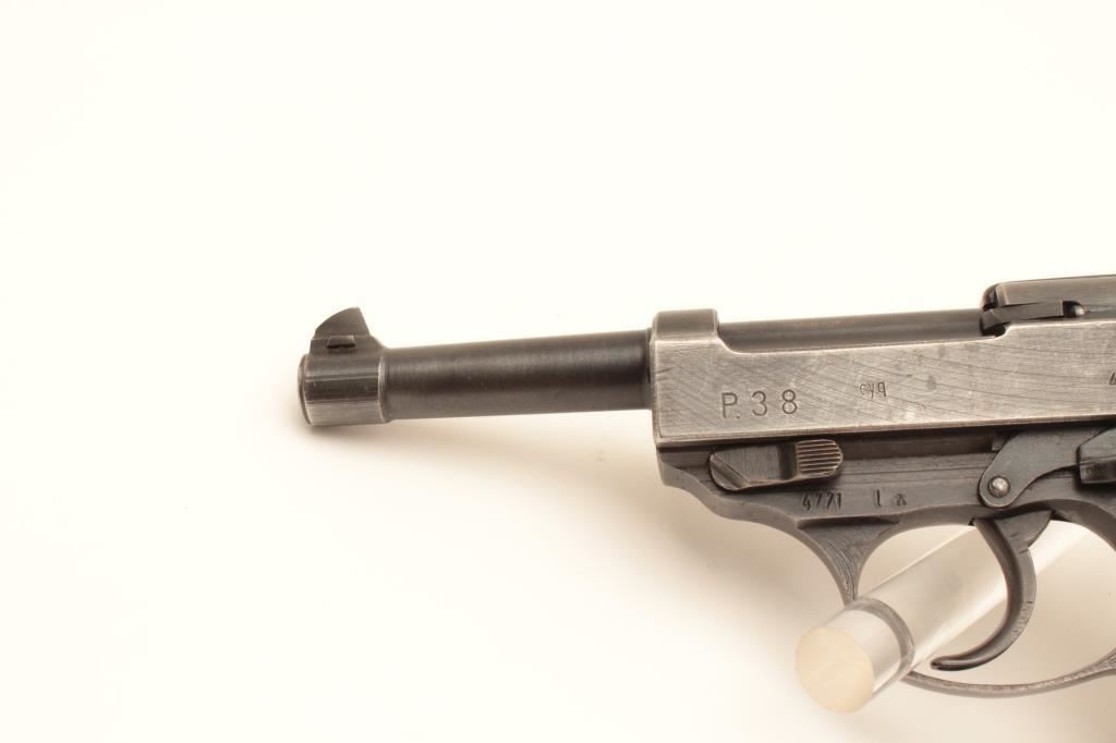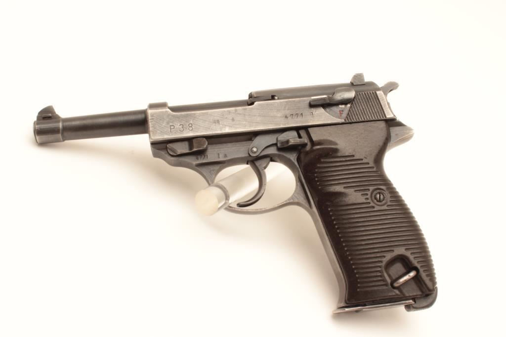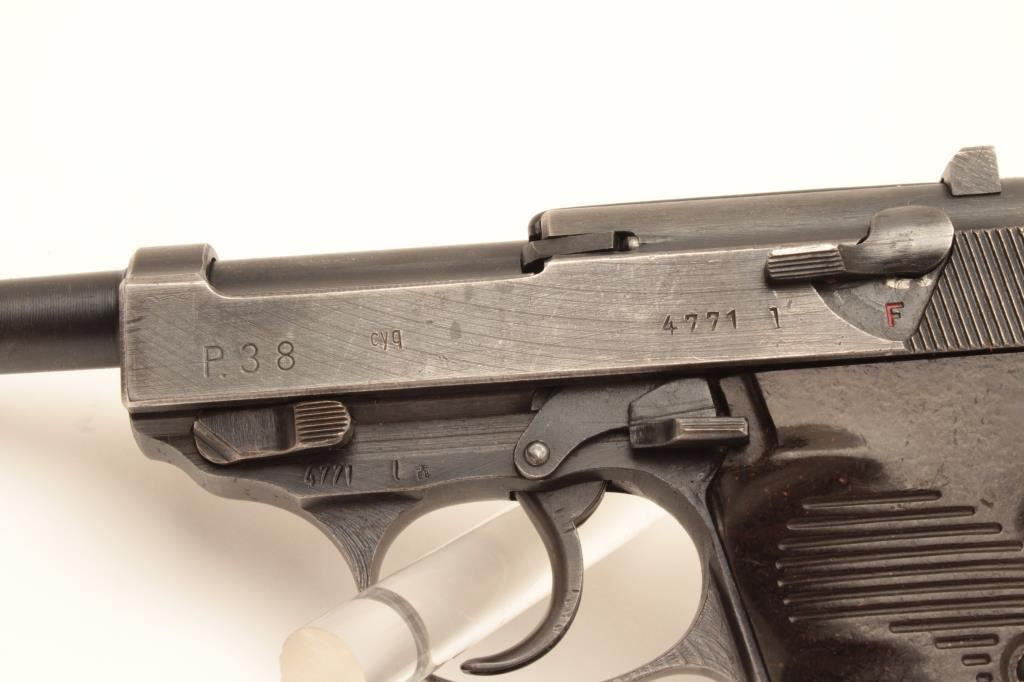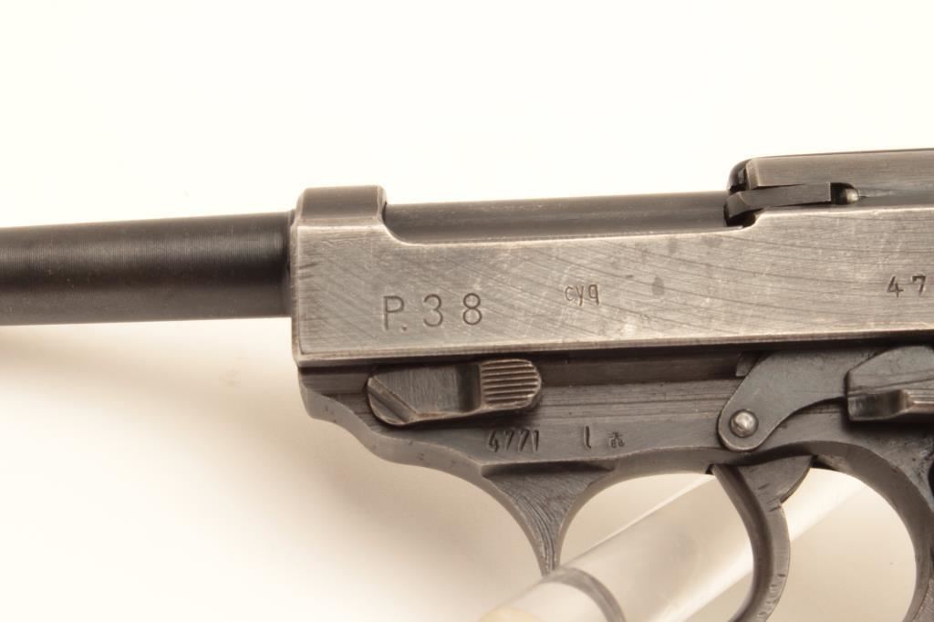 P-38 by cyq semi-automatic pistol, no import marks, 9mm caliber, 3.75” barrel, blued finish, maroon grips, S/N 4771 l (magazine #9418); overall good to very good condition with majority of military finish remaining, good bore, crisp action, good markings and very good grips. (C&R/PPT). Est.: $400-$800.