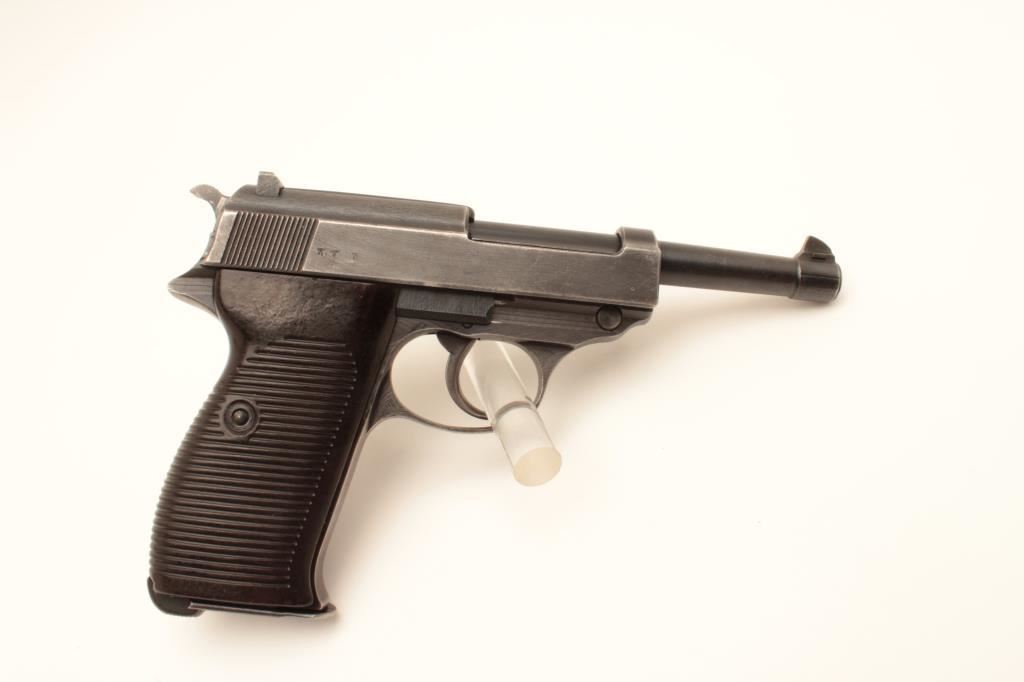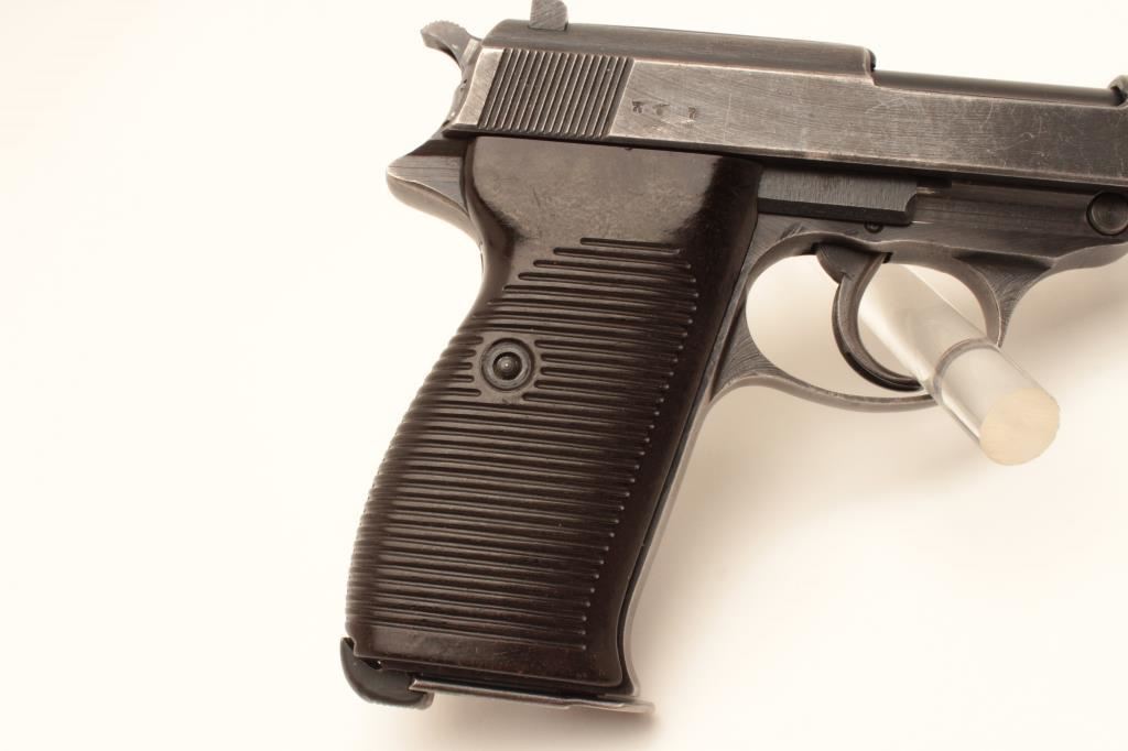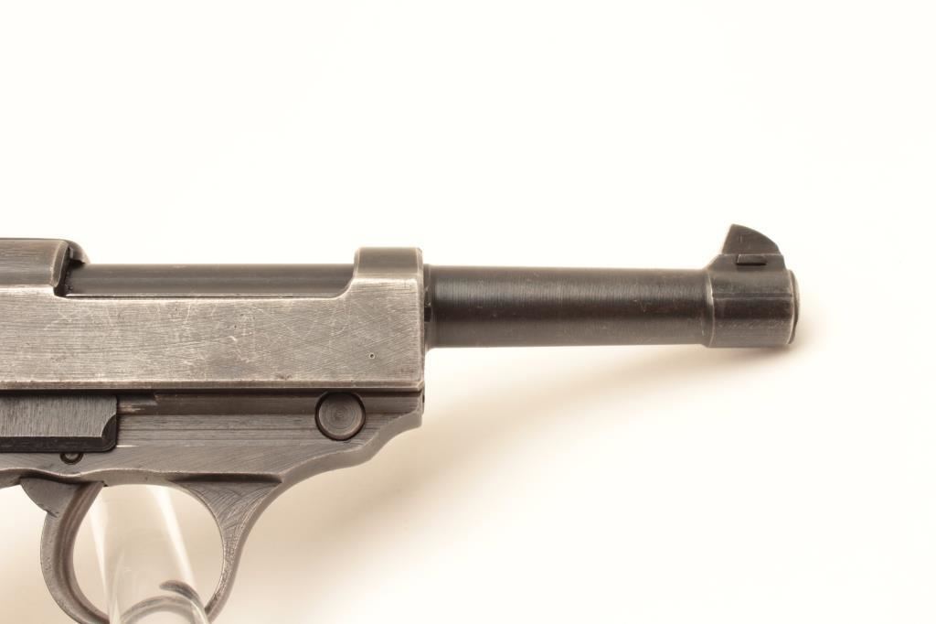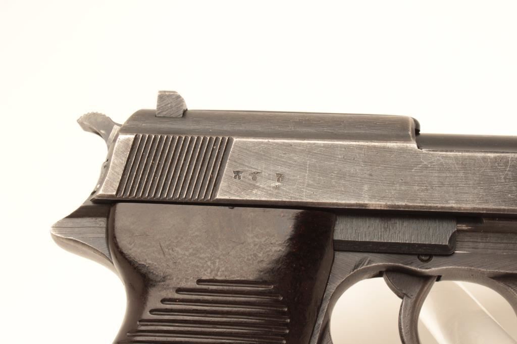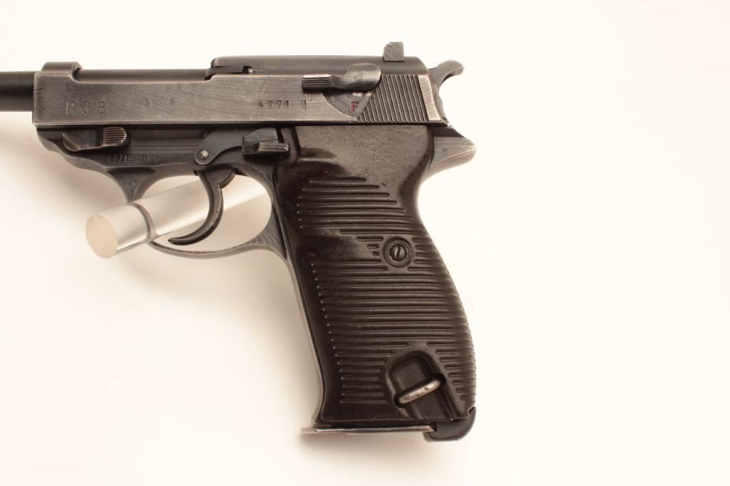 P-38 by cyq semi-automatic pistol, no import marks, 9mm caliber, 3.75” barrel, blued finish, maroon grips, S/N 4771 l (magazine #9418); overall good to very good condition with majority of military finish remaining, good bore, crisp action, good markings and very good grips. (C&R/PPT). Est.: $400-$800.