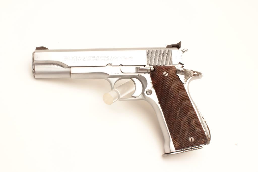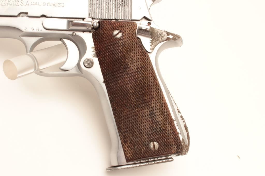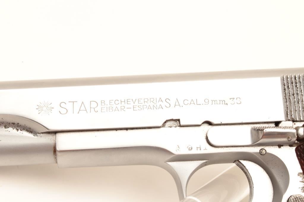 Star semi-automatic pistol, 9mm caliber, 5” barrel, hard chrome re-finish, checkered brown plastic grips, S/N M 767675; pistol shows areas of moderate to heavy pitting confined primarily to the rear portion of the gun; action is crisp, bore is fair, markings are overall good; grips are good; accompanied by a leather Bianchi holster, shoulder straps and dual magazine holder with one extra magazine. (Modern/PPT). Est.: $175-$350.