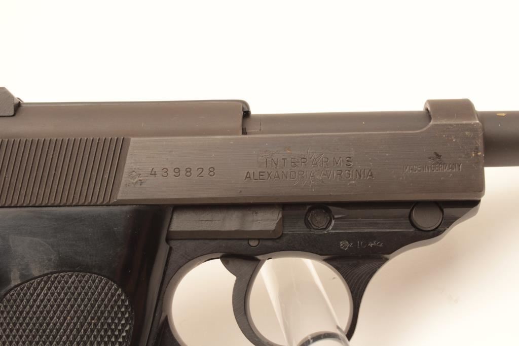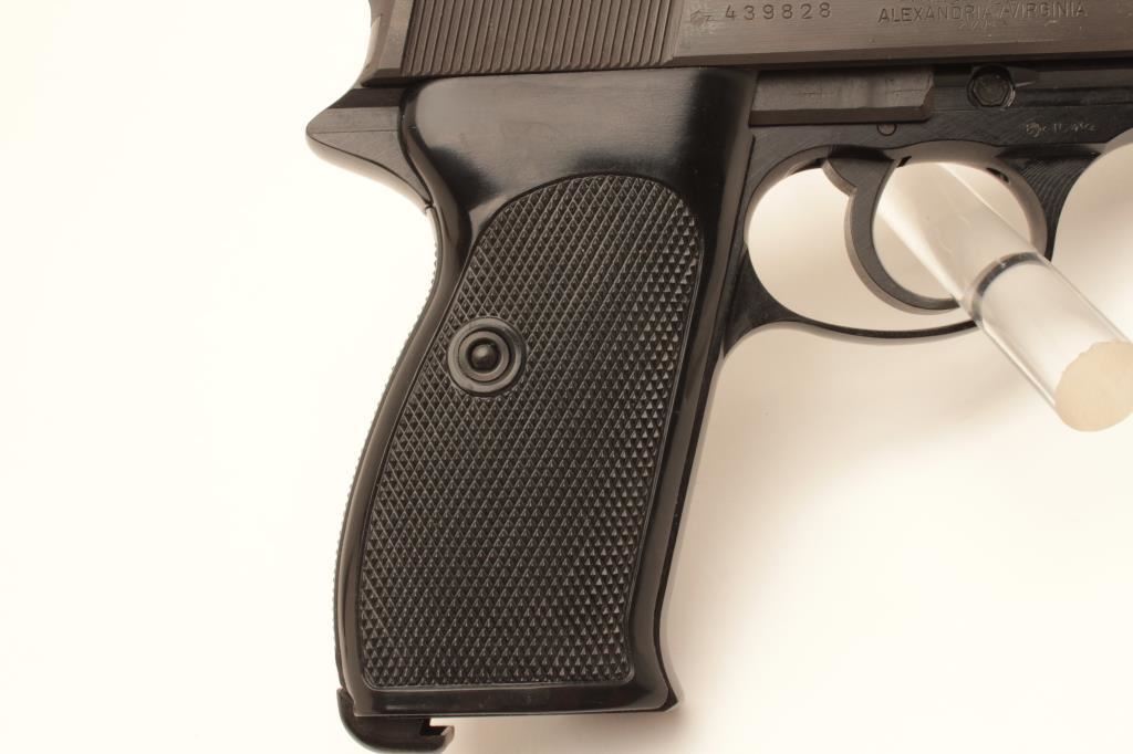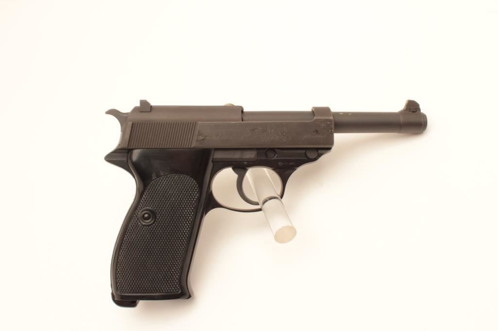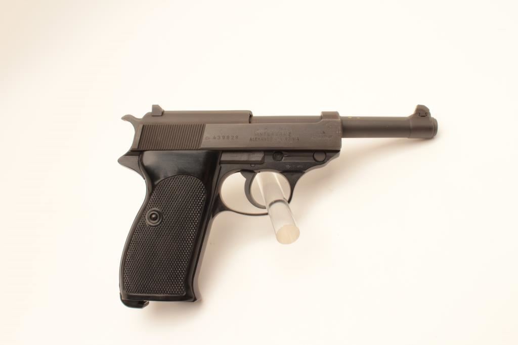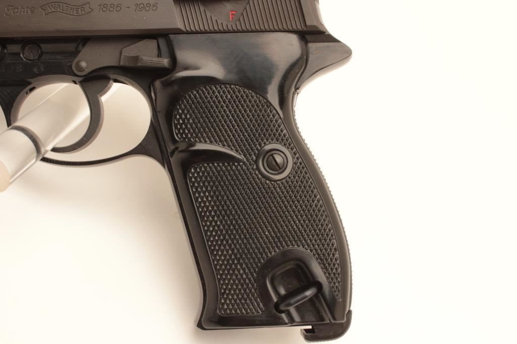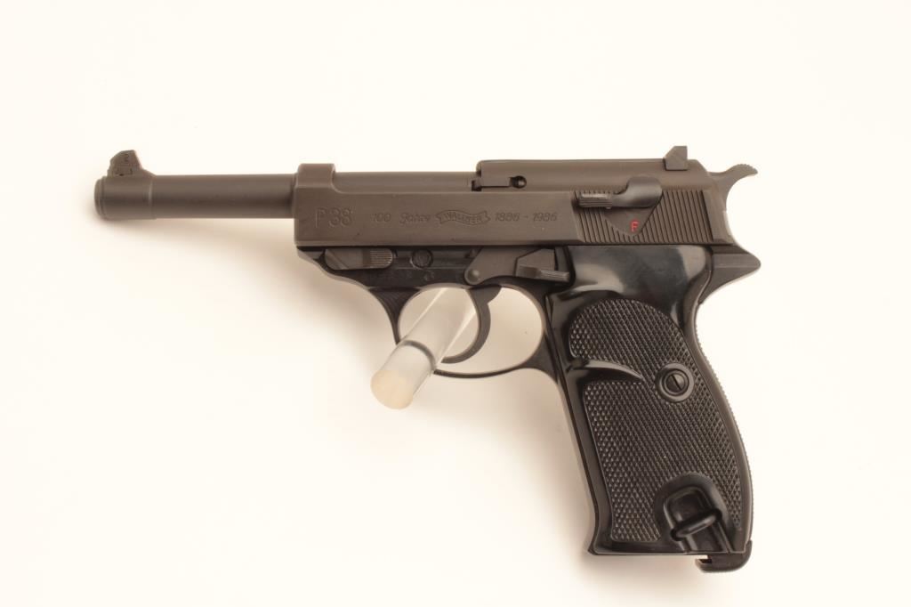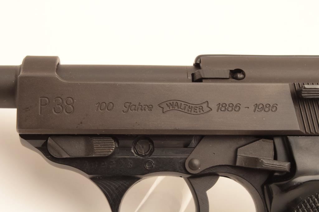 100 year (1886-1986) Commemorative P-38 semi-automatic pistol by Walther, 9mm caliber, 5” barrel, mat black finish, checkered plastic grips, S/N 439828, near mint condition in factory wood grain cardboard box with end label numbered to this gun, instructions, other factory paperwork, two extra magazines and a cleaning rod. (Modern/PPT). Est.: $500-$1,000.