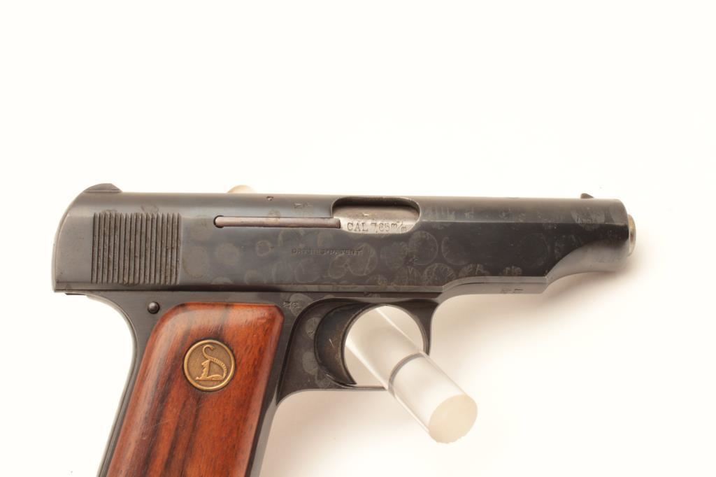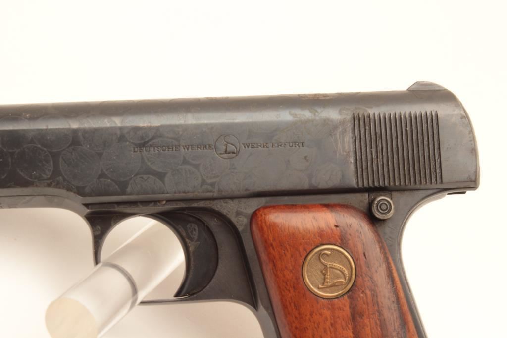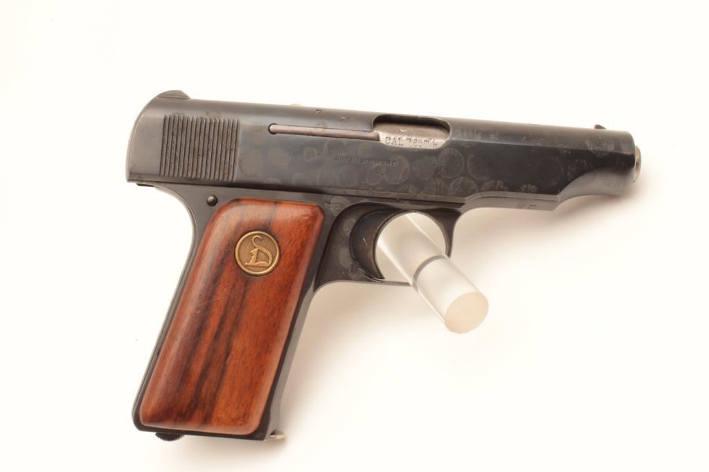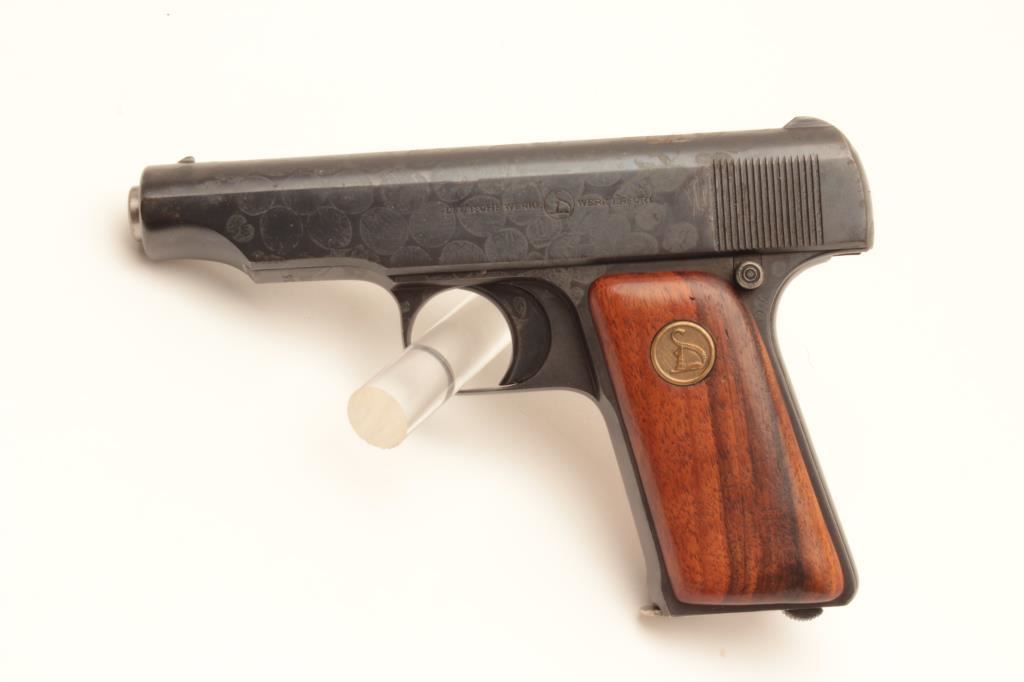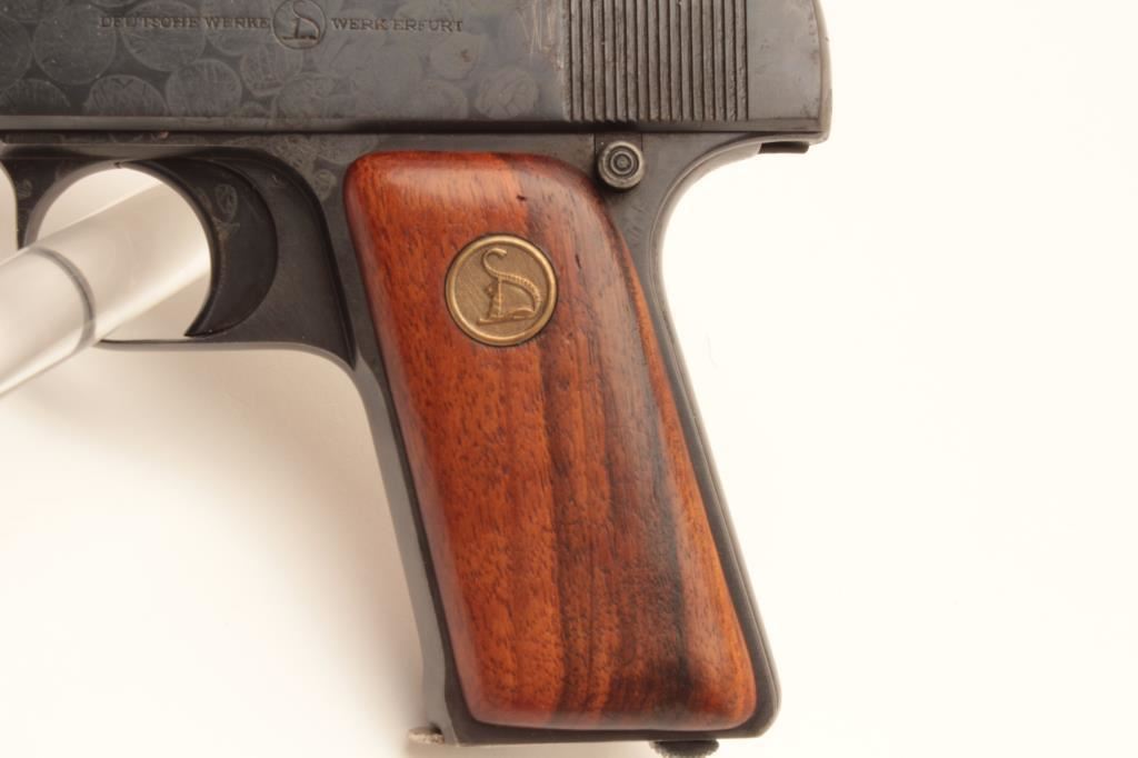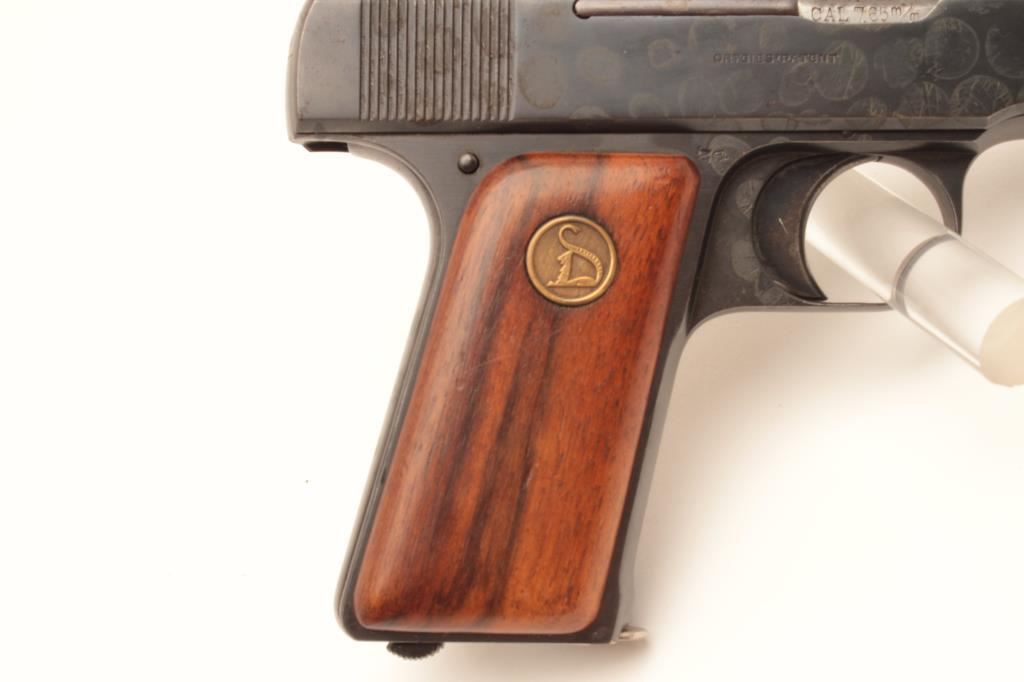 DWM Ortgies semi-automatic pocket pistol, 7.65mm caliber, 3.25” barrel, blued finish, smooth wood medallion grips, S/N 118756; overall good to very good condition with majority of blued finish remaining; surface finish shows coverage of what appears to be remnants of having been wrapped at one time in bubble wrap; very good bore, crisp action, sharp markings and very good grips; with cardboard box. (C&R/PPT). Est.: $175-$350.