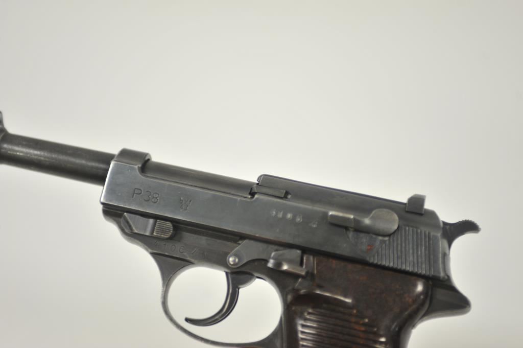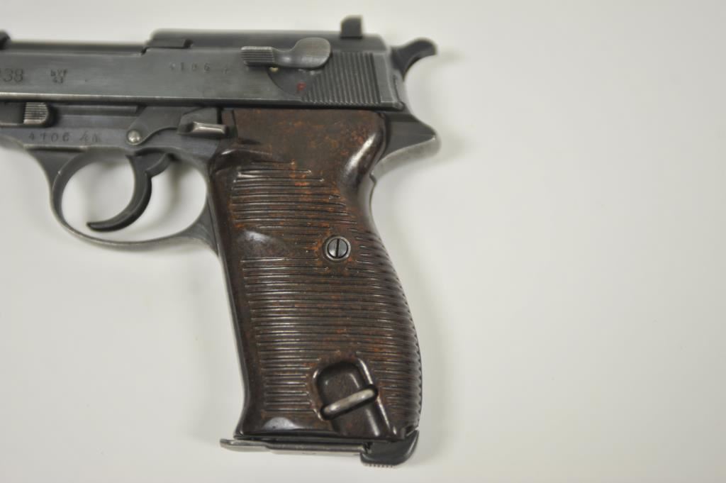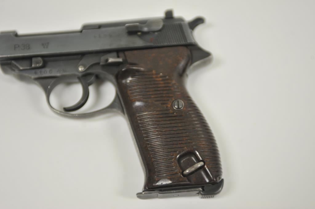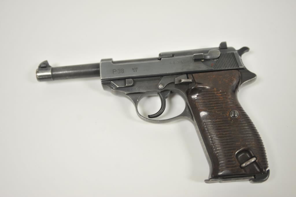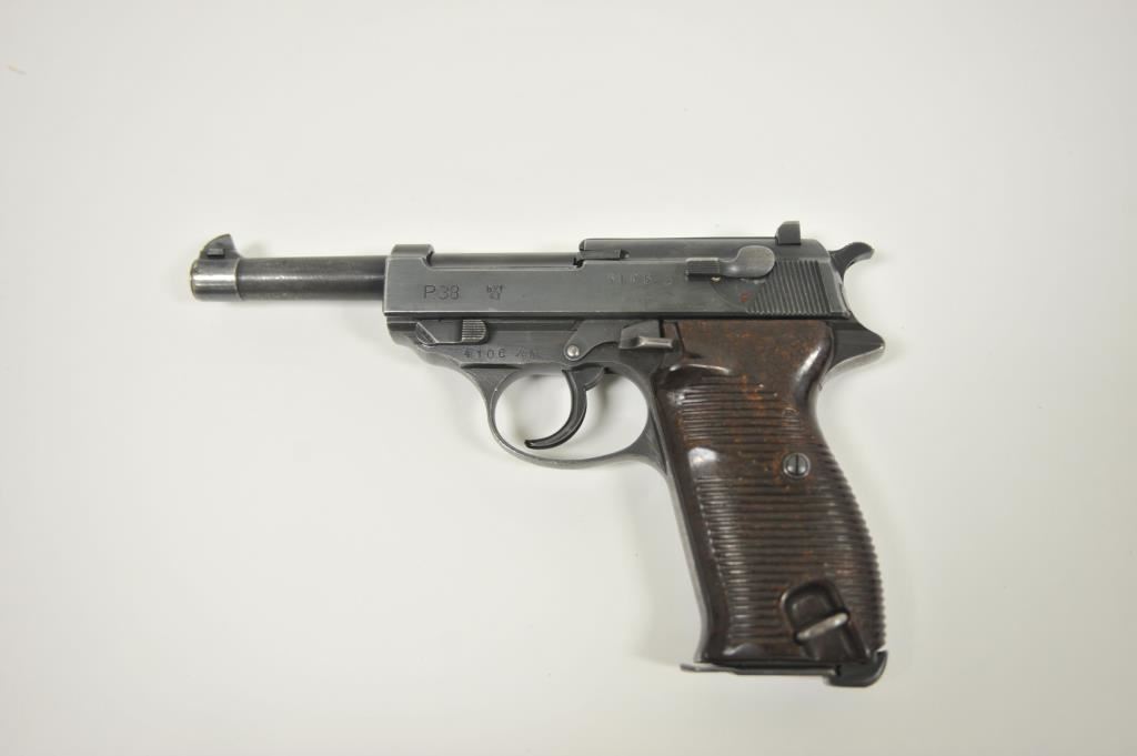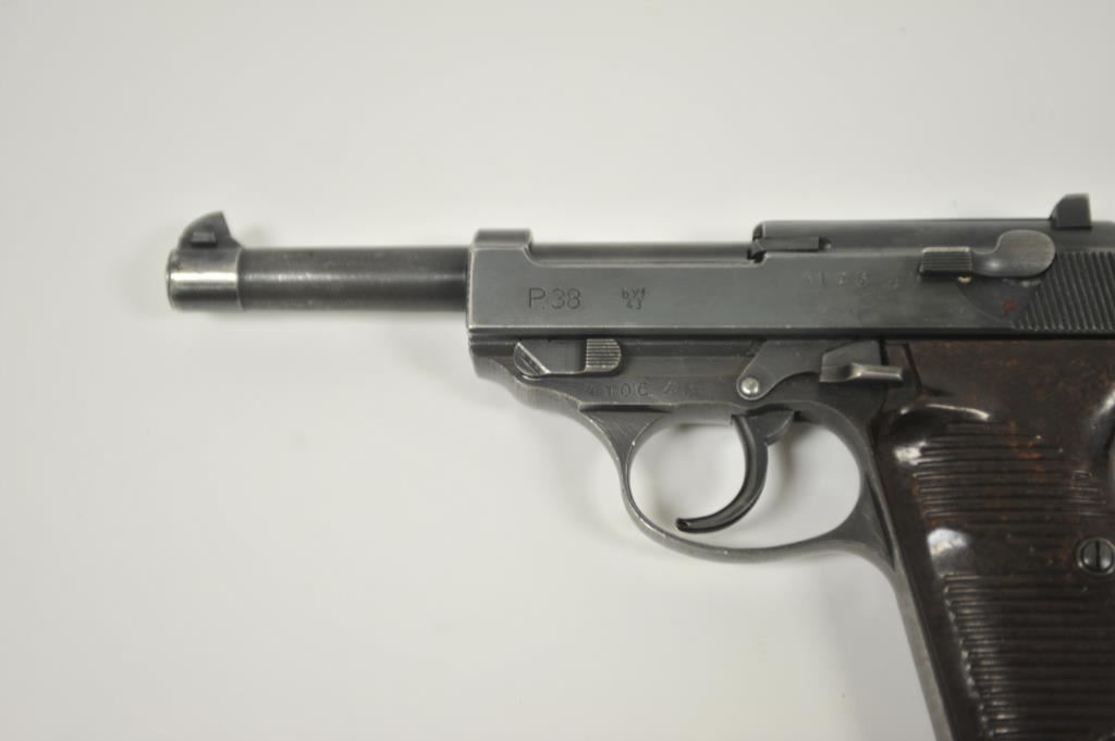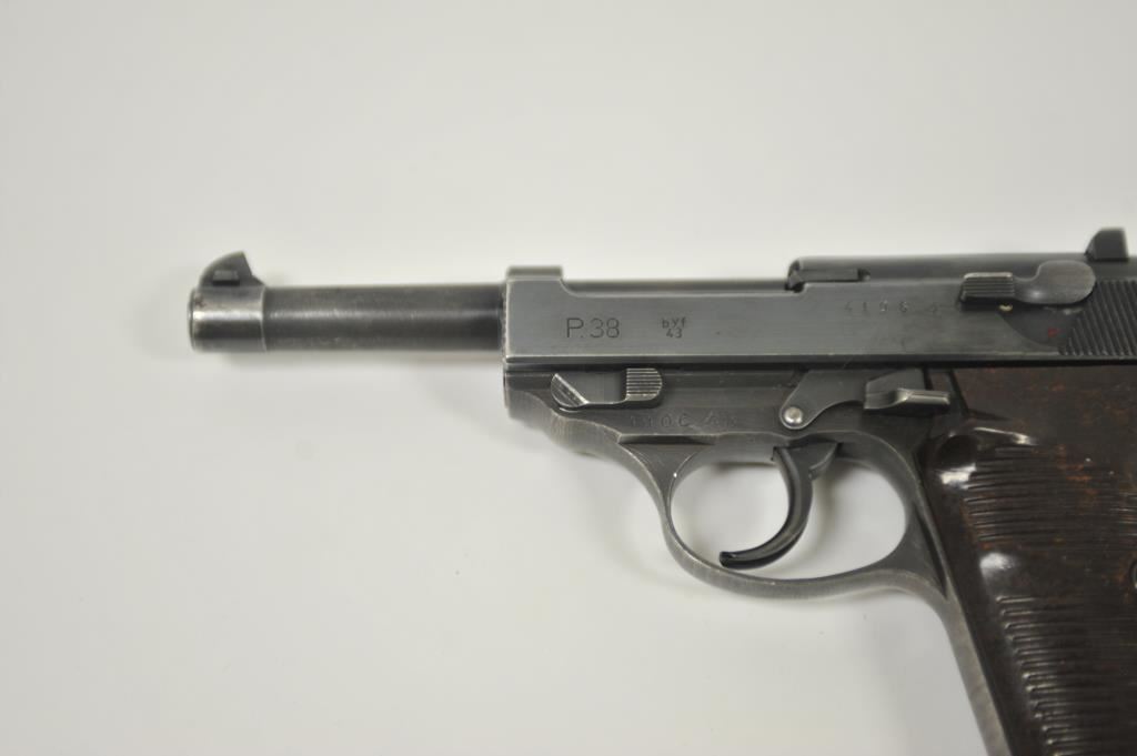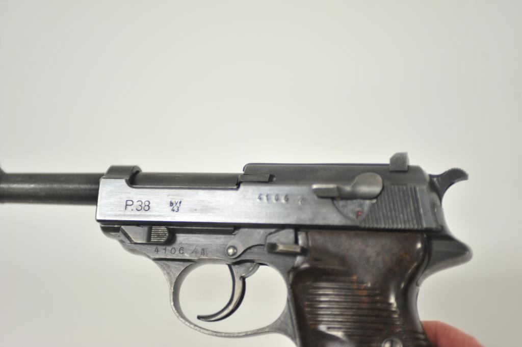 P-38 semi-automatic pistol, byf 43-marked, 9mm caliber, 5” barrel, blued finish, maroon plastic grips, S/N 4106k; overall very good + with 80-90% finish, crisp action, sharp markings, good bore, very good grips; a collectors’ quality pistol. (C&R/PPT). Est.: $500-$1,000.