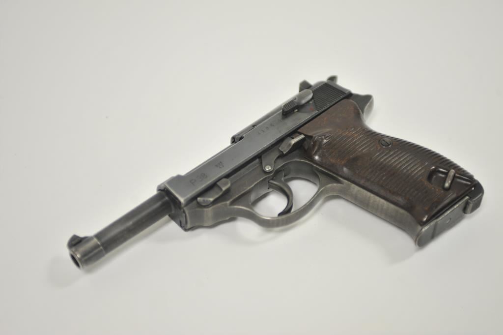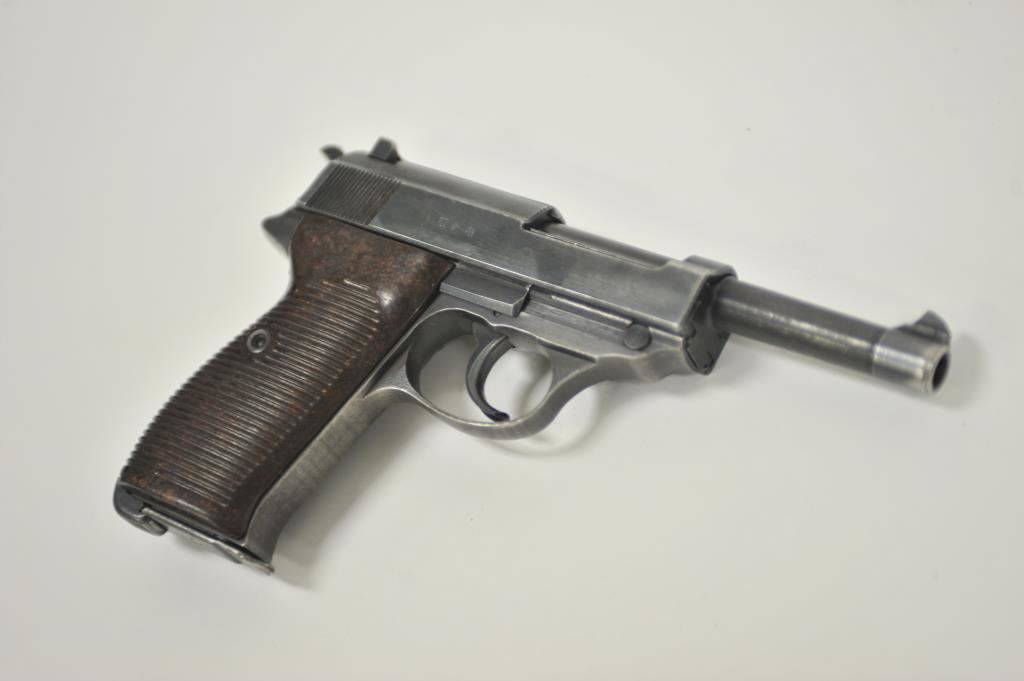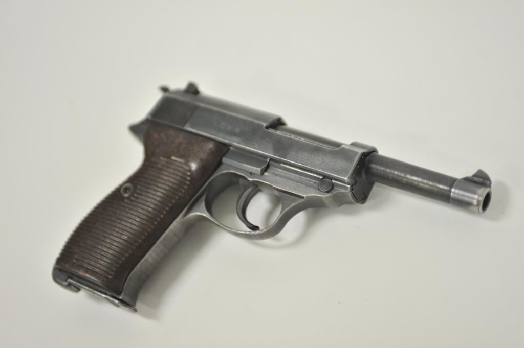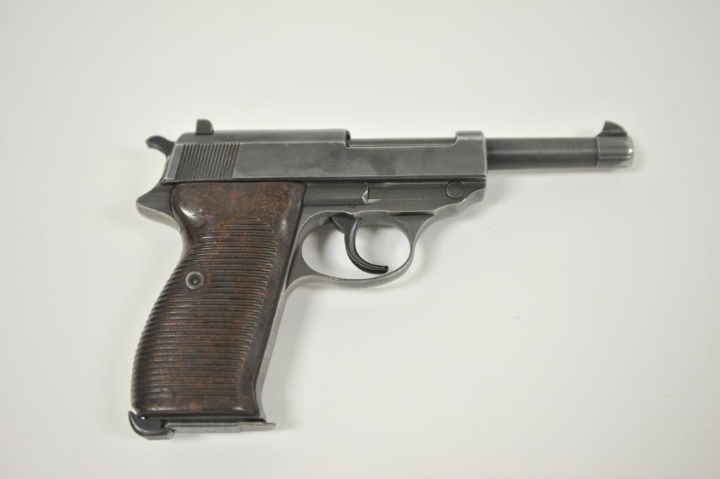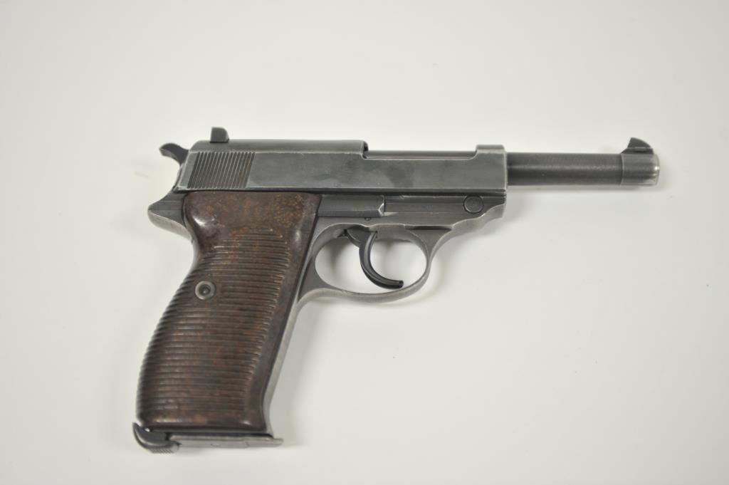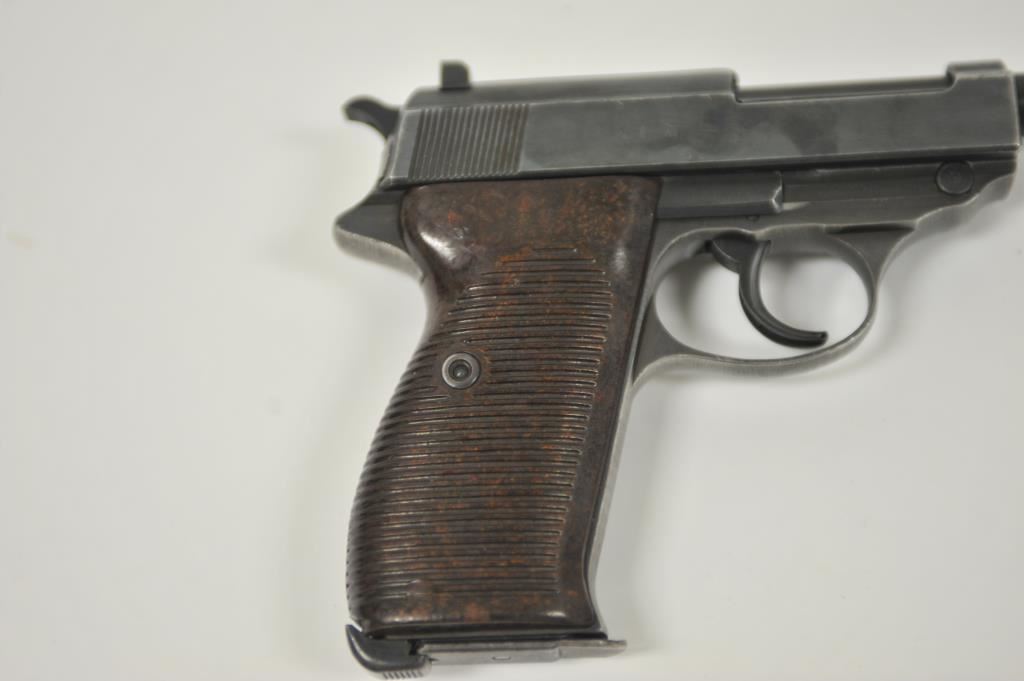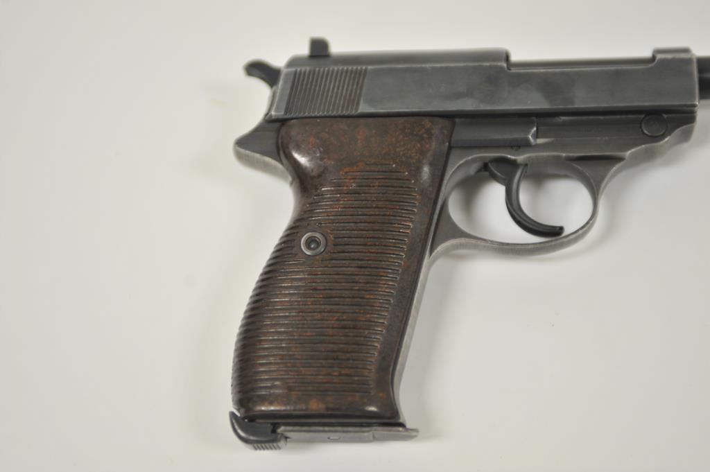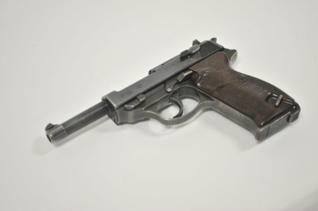 P-38 semi-automatic pistol, byf 43-marked, 9mm caliber, 5” barrel, blued finish, maroon plastic grips, S/N 4106k; overall very good + with 80-90% finish, crisp action, sharp markings, good bore, very good grips; a collectors’ quality pistol. (C&R/PPT). Est.: $500-$1,000.