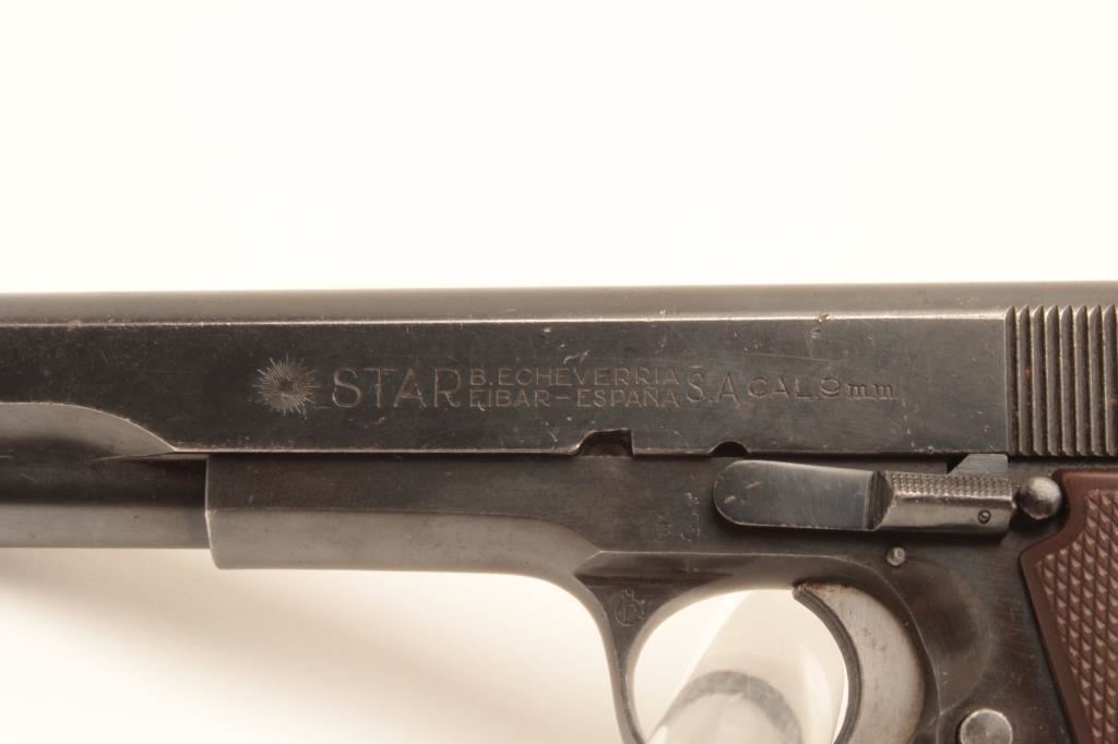 Star Model B semi-automatic pistol, 9mm caliber, 5” barrel, blued finish, checkered brown hard rubber grips, import-marked, S/N 272756; overall good to very good condition with crisp action, good bore, good markings and very good grips. (C&R/PPT). Est.: $250-$500.
