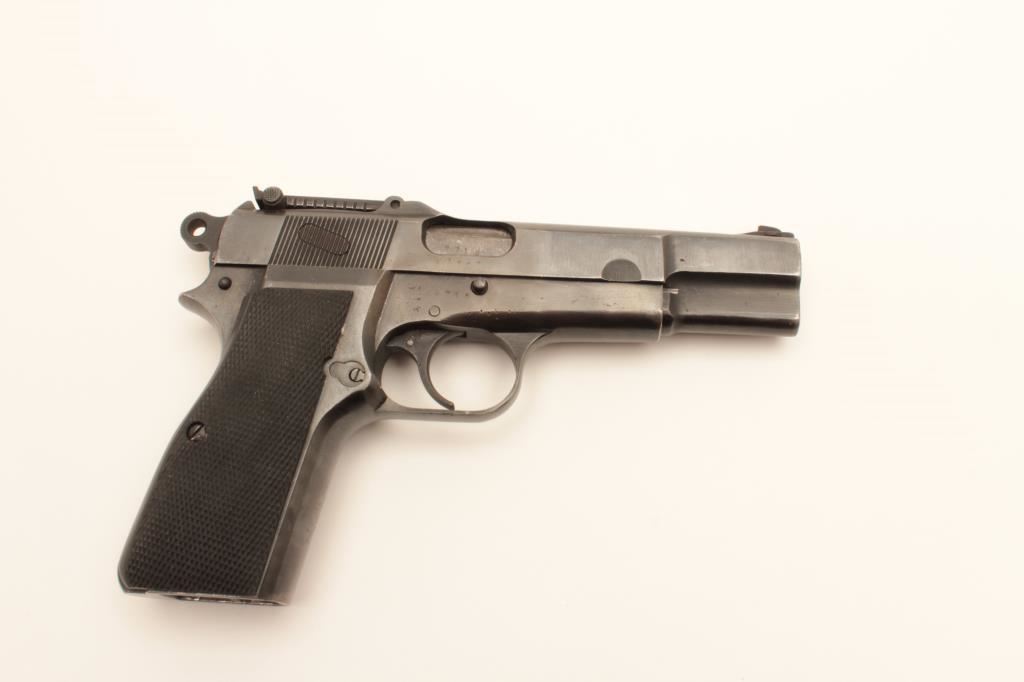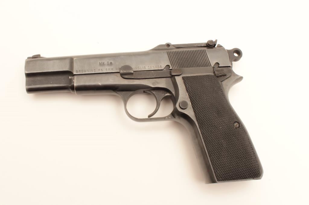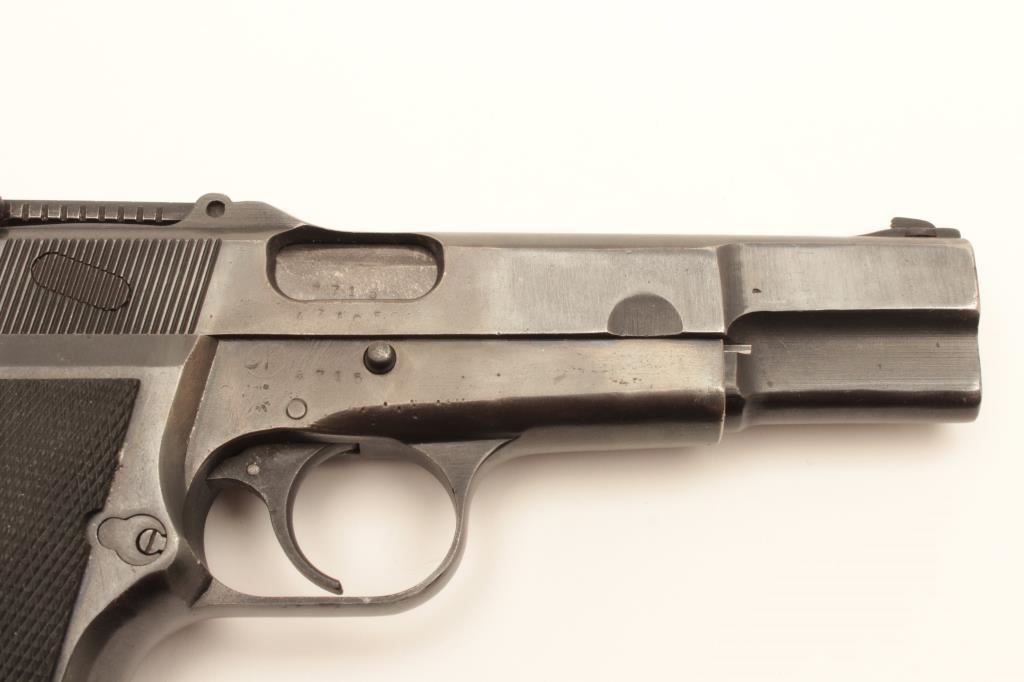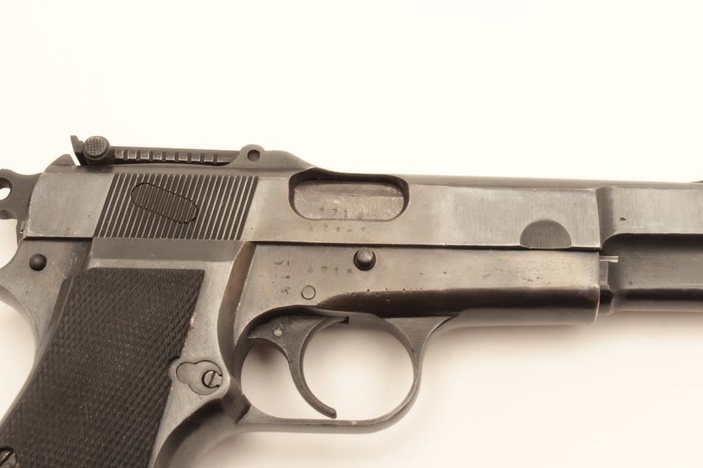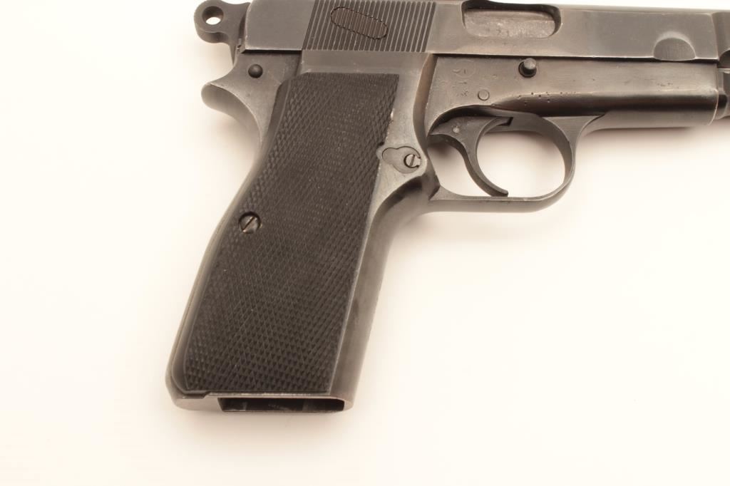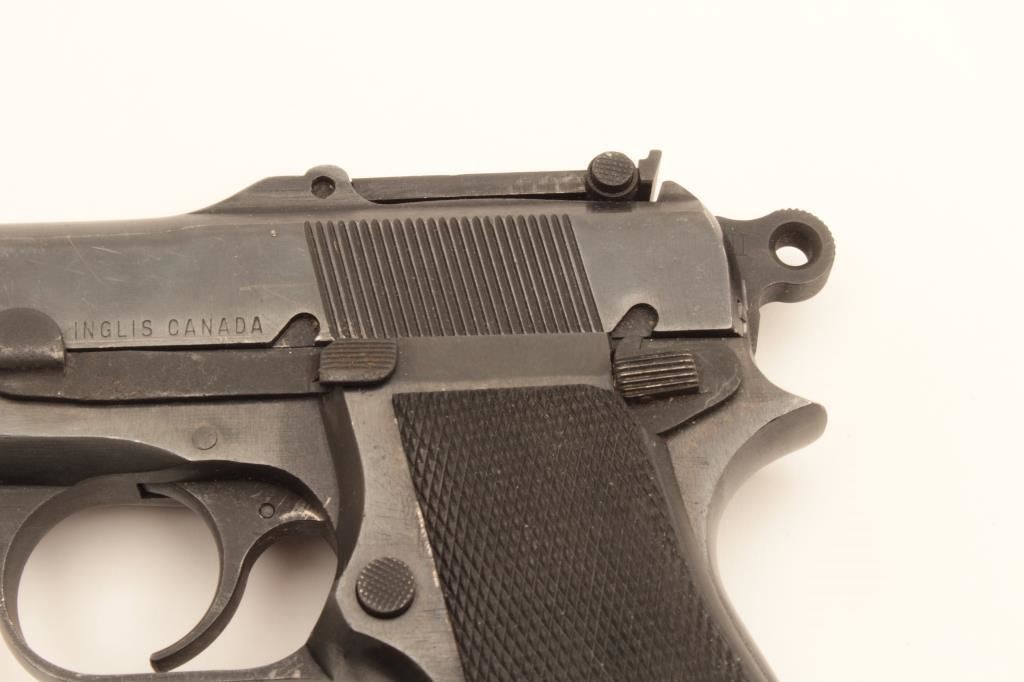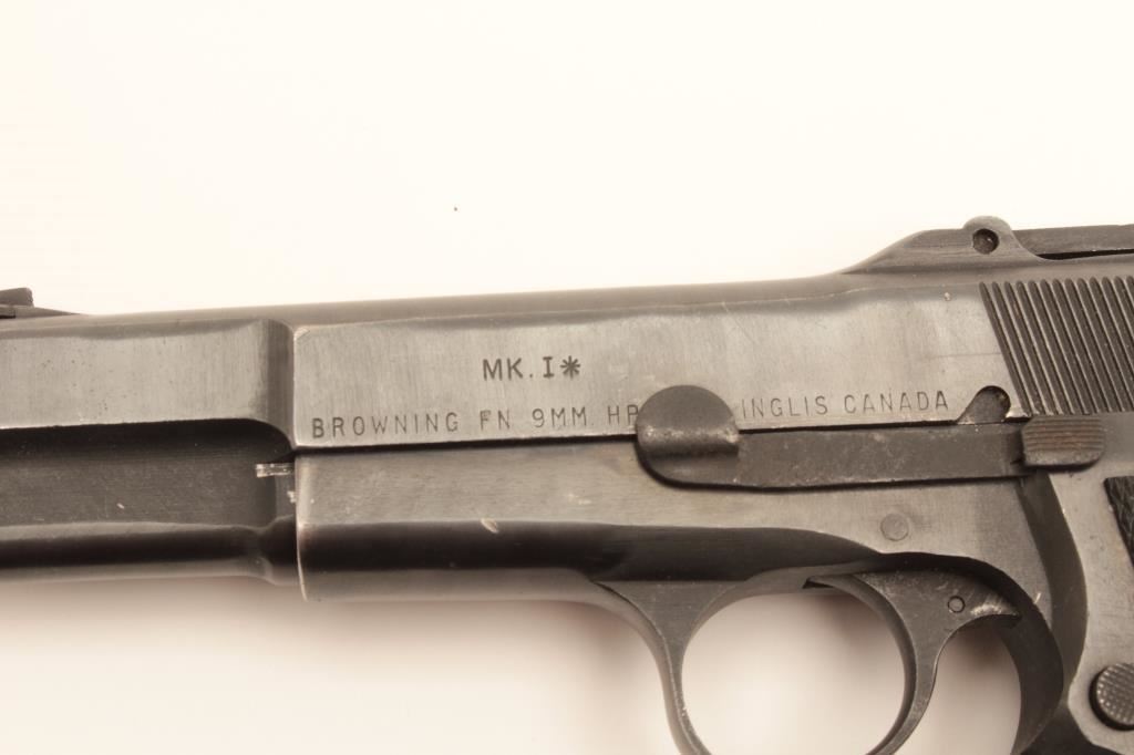 Browning Hi Power FN MK I Inglis semi-automatic pistol, cut for stock, no magazine, tangent sight, 9mm caliber,4.5” barrel, post-war re-numbered/re-issued (Israel?), blued finish, S/N 4715; overall fair to good condition as re-finished and reworked; good bore, good action, good checkered rubber grips. (C&R/PPT). Est.: $400-$800.