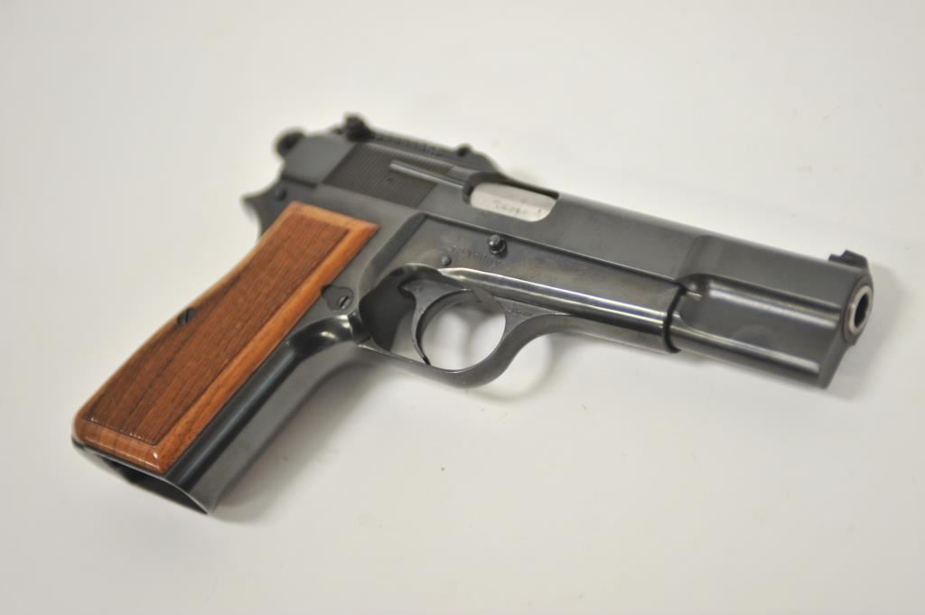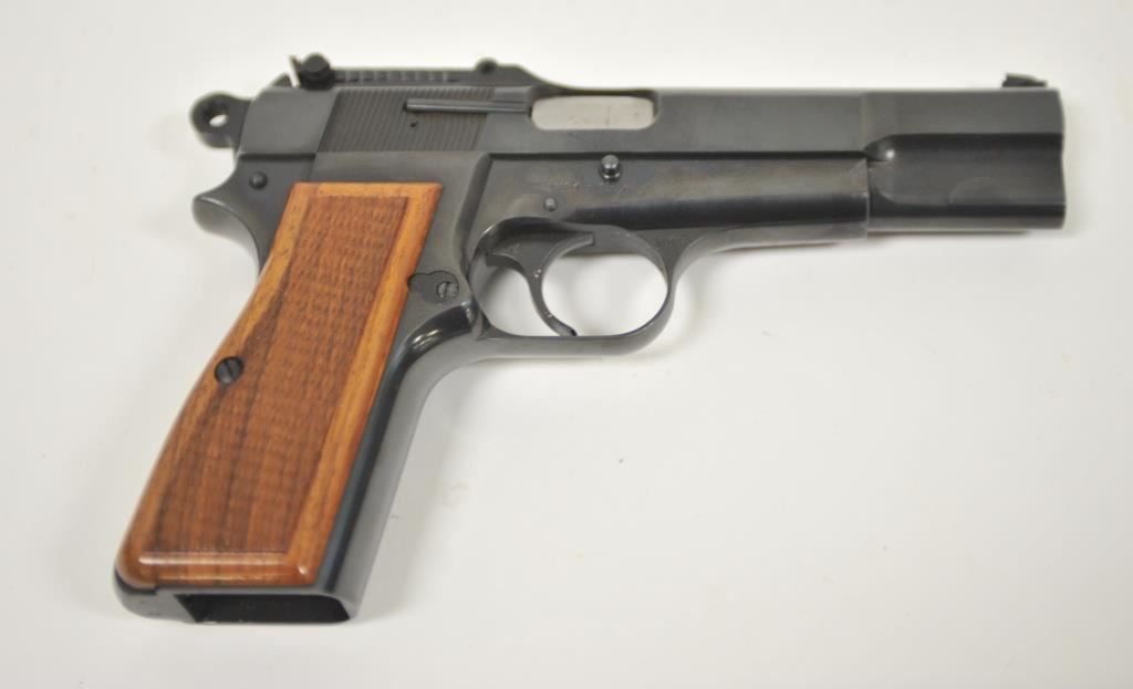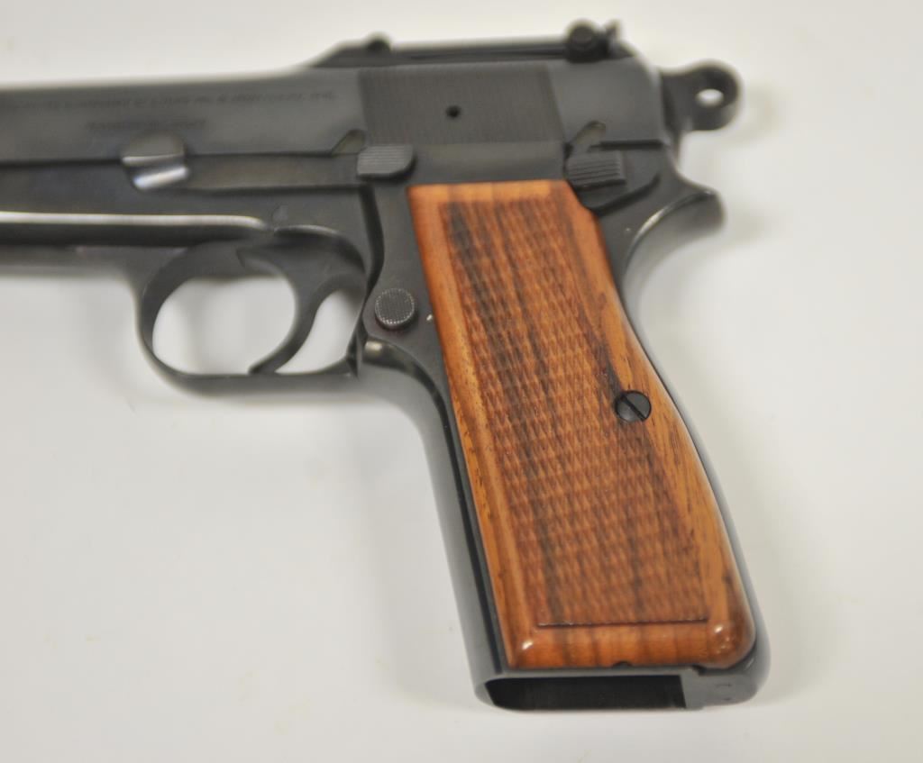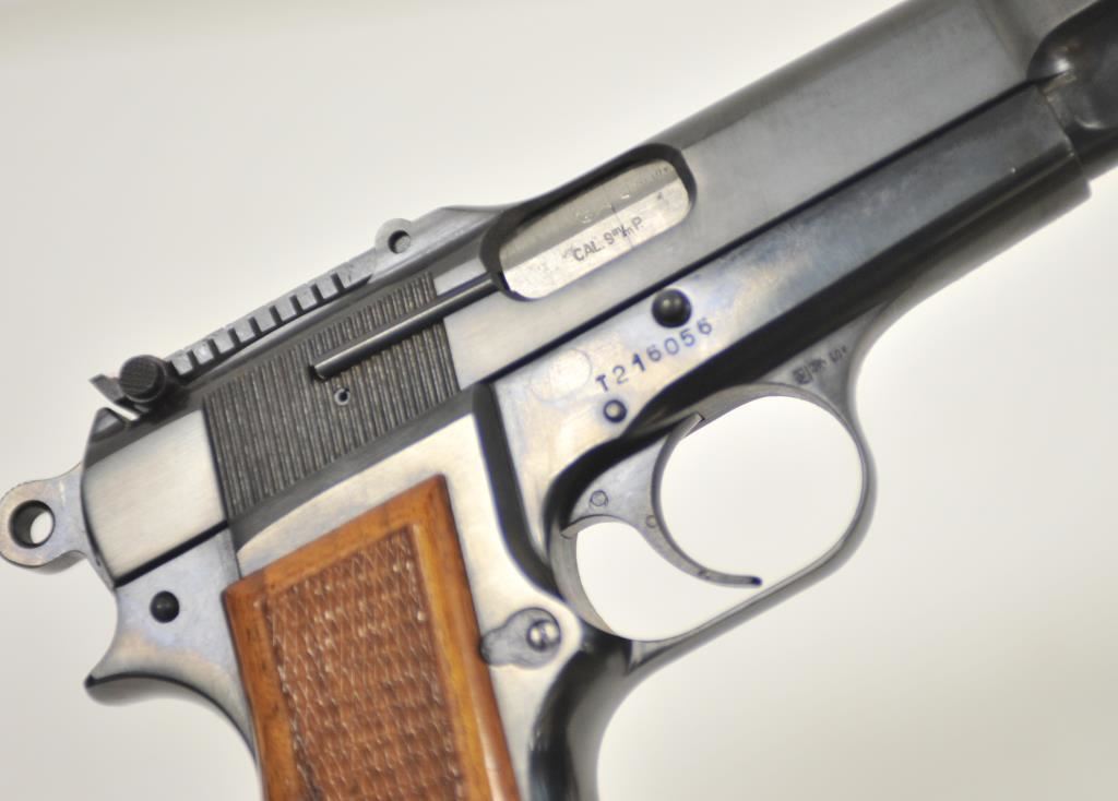 Belgian Browning Hi-Power semi-automatic pistol, 9mm caliber, Serial #T216056. The pistol is in excellent overall condition with a 4 ½” barrel with a blade front and tangent rear sights. The pistol retains approximately 98%-99% 0f its original blue finish with only the lightest handling marks. The checkered wood grips are in excellent condition as well with sharp checkering and red interior. The lot includes a black leather Browning marked boot, and one correct magazine. The bore is very good, the action is crisp and markings are sharp on this superb T-Series with desirable tangent sights and ringed hammer. Est.: $1,400-$2,800. (C+R).